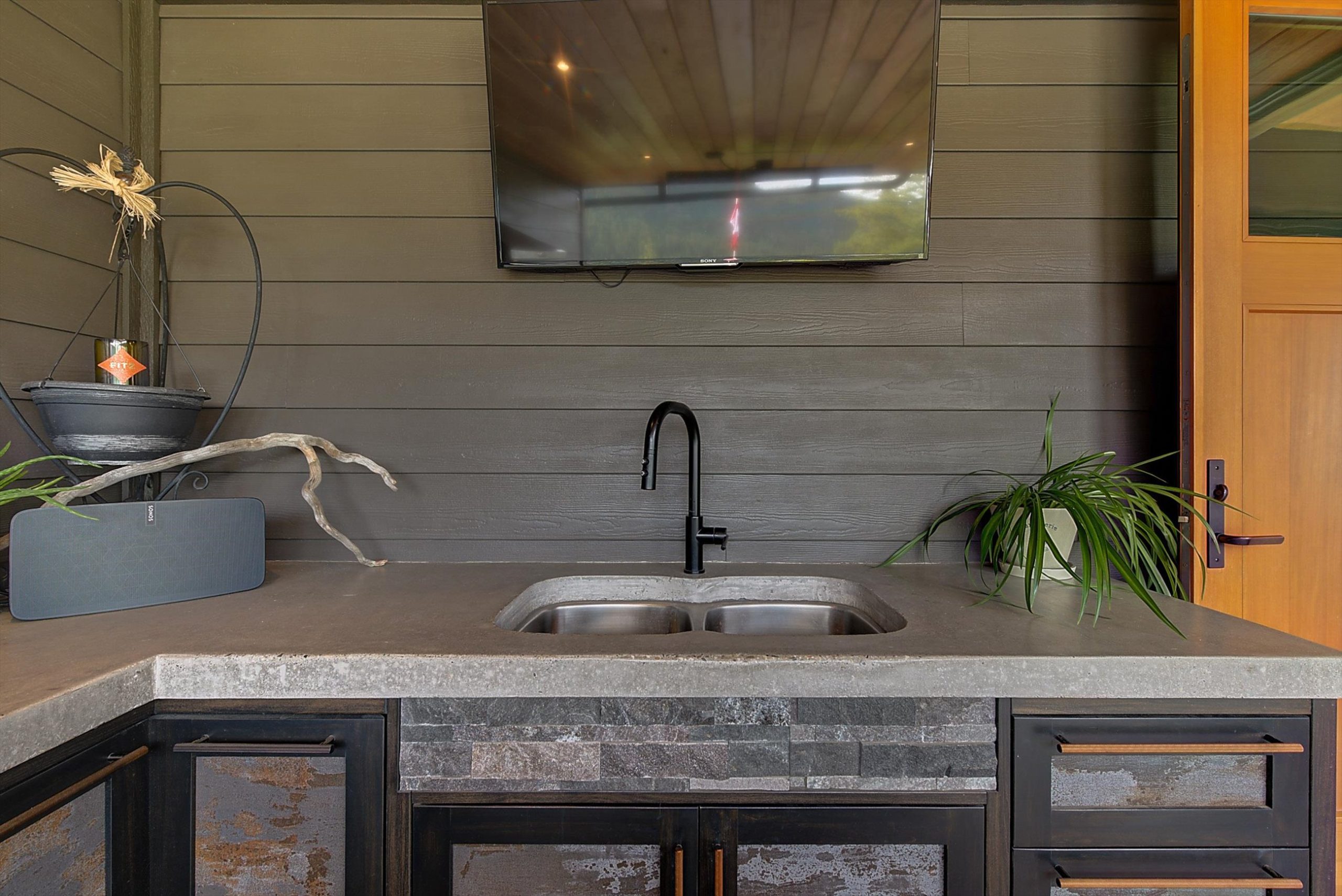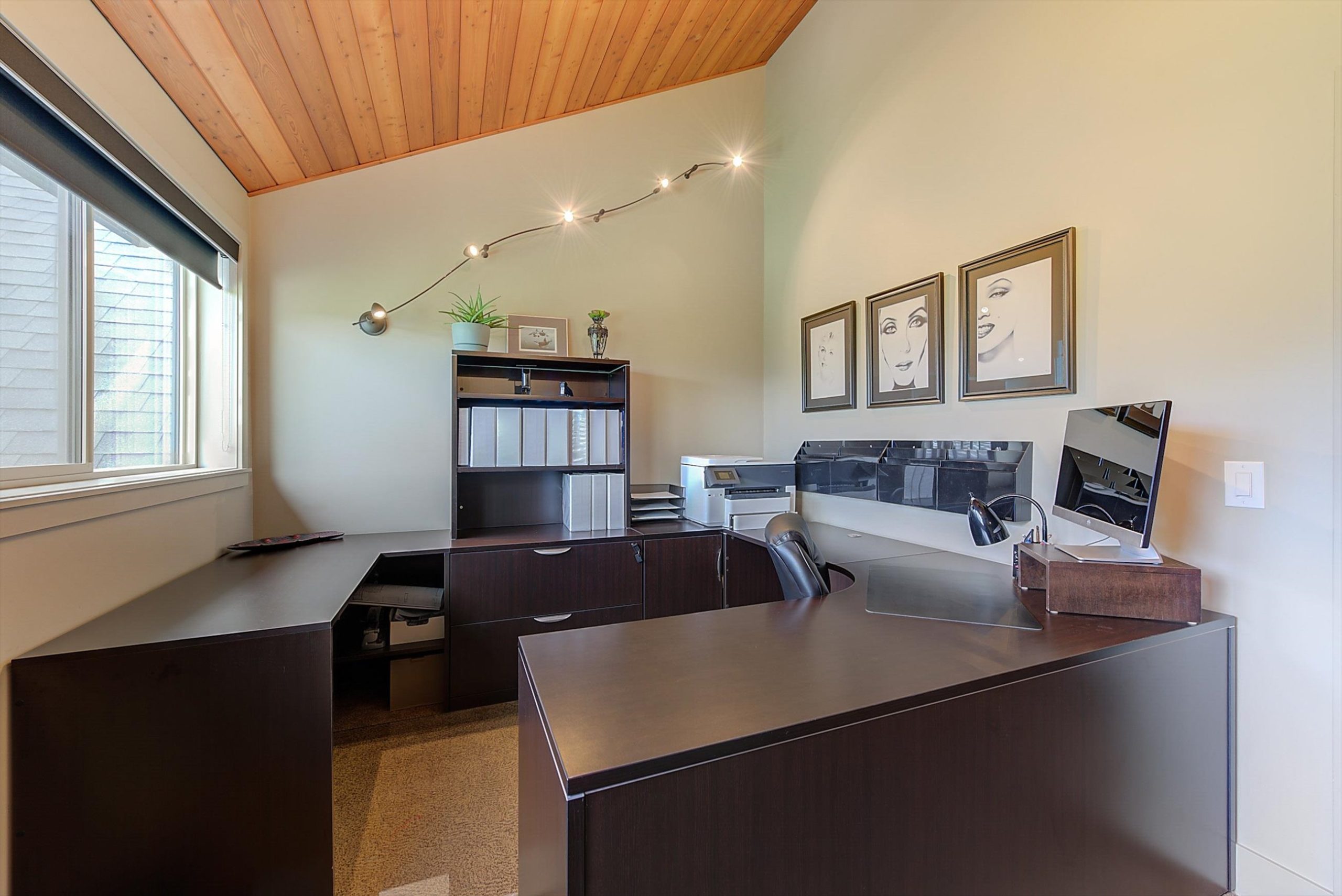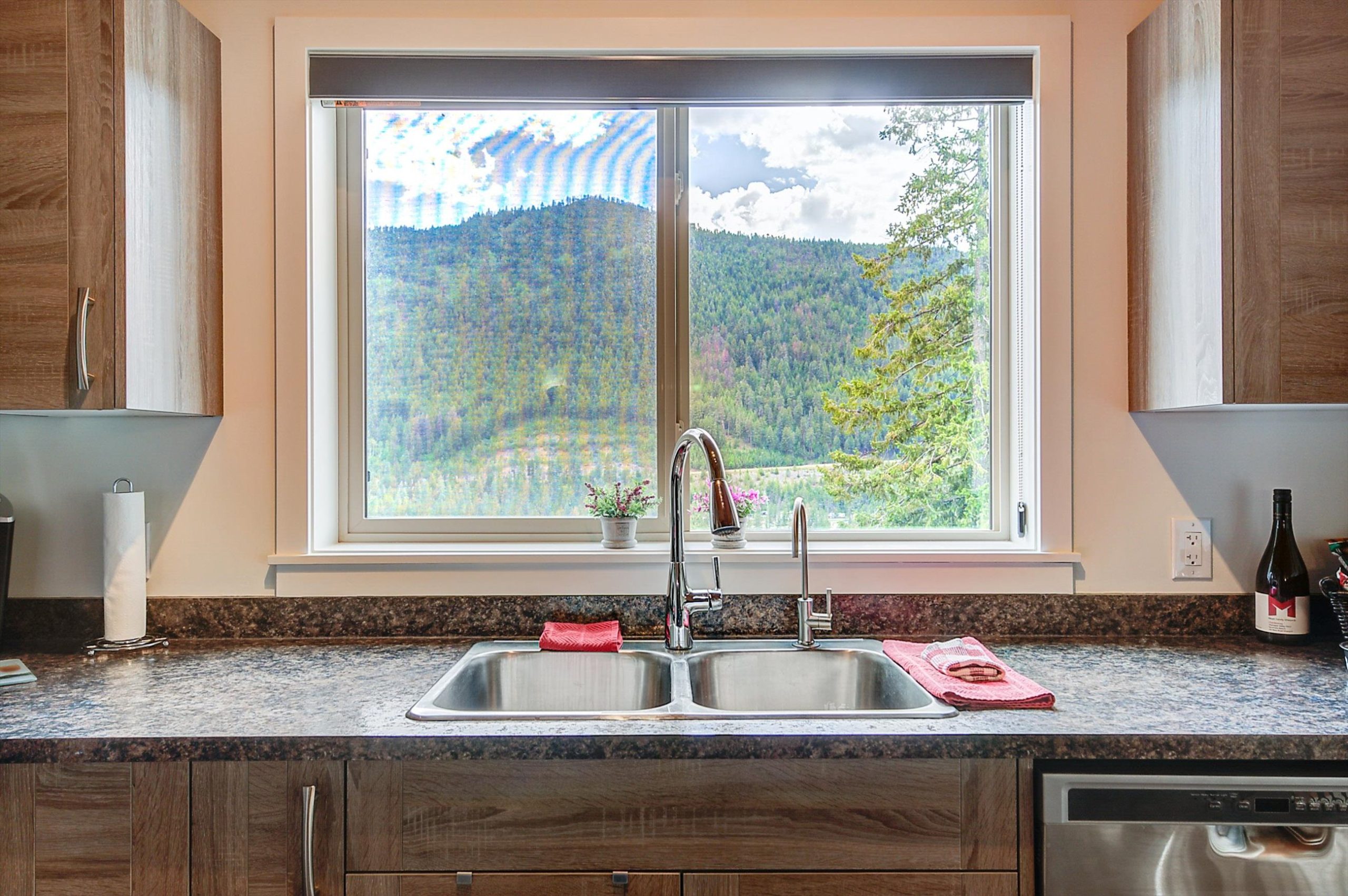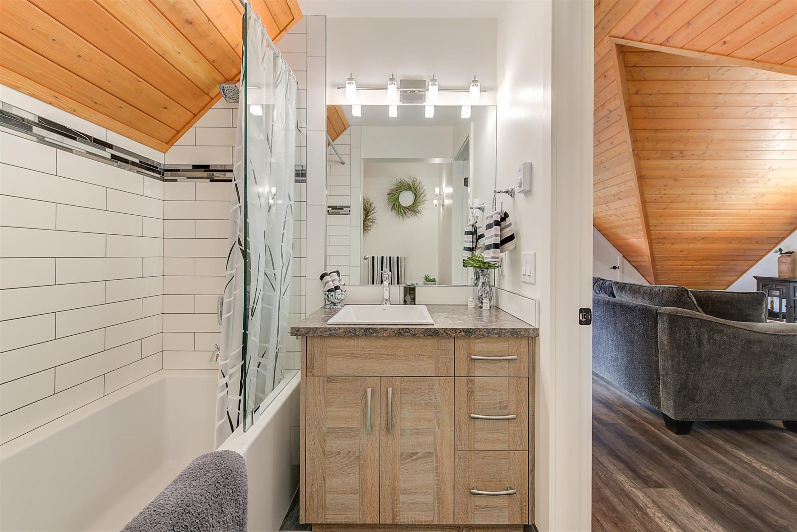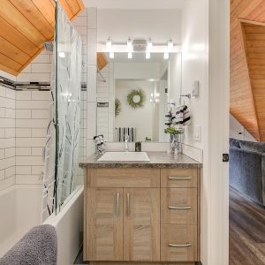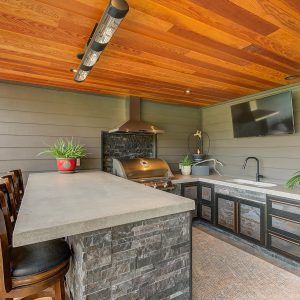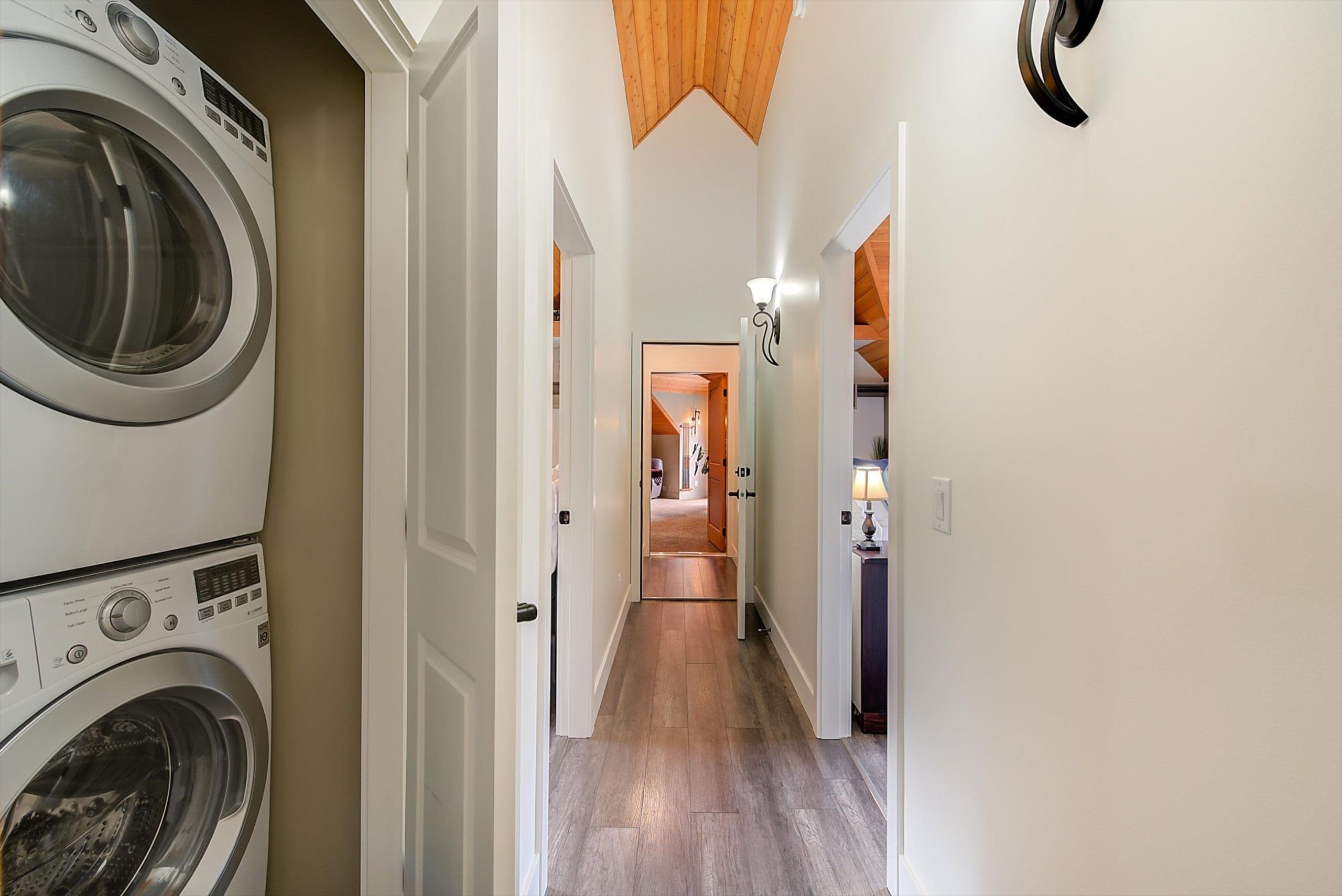 Inside, vaulted ceilings, rich wood detailing, and exposed beams create a warm yet elevated atmosphere. The open-concept main living area is anchored by a chef’s kitchen with quartz surfaces, premium appliances, and an oversized island, seamlessly connecting to the dining and living areas and extending to a covered outdoor space with serene views.