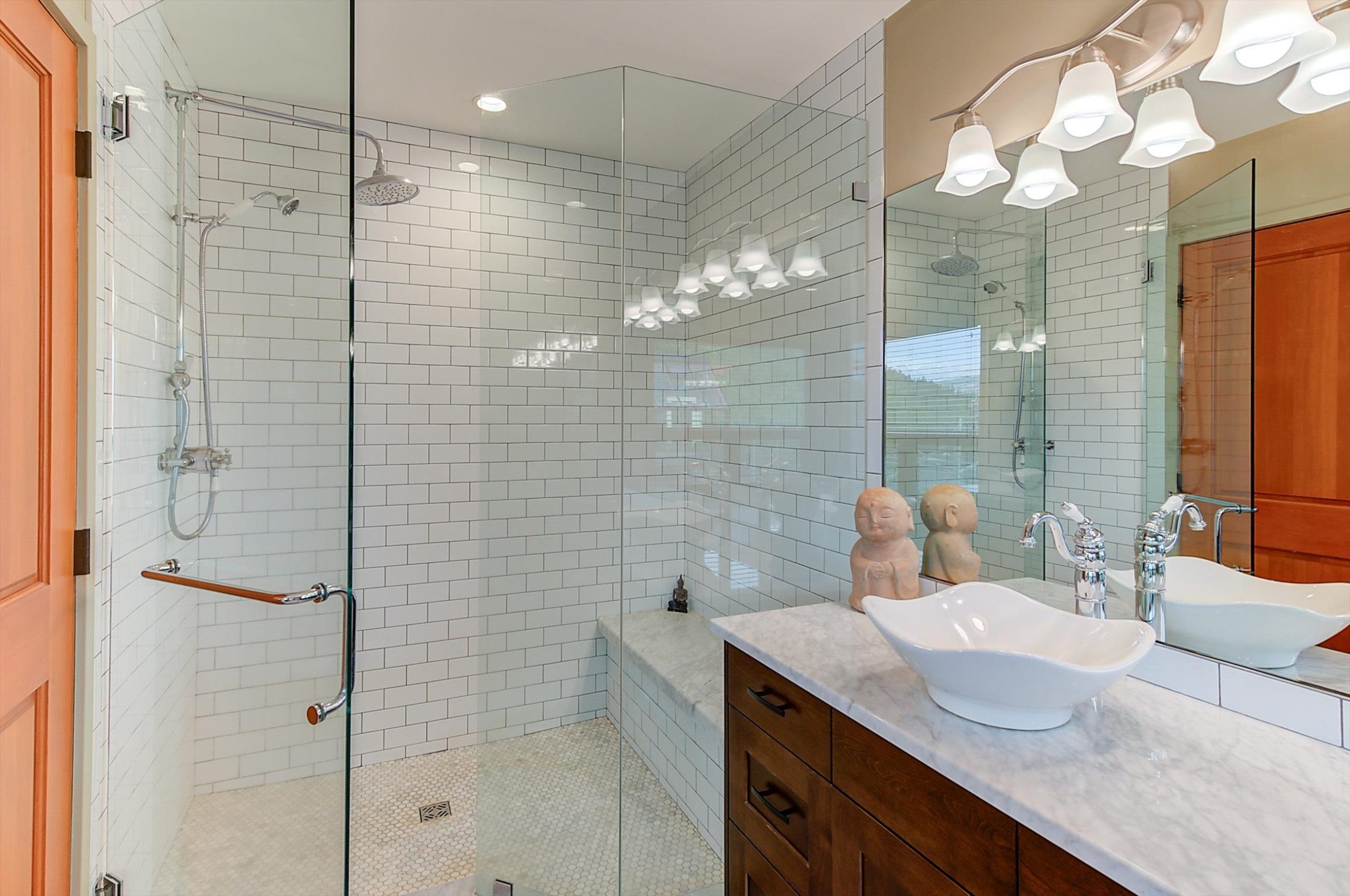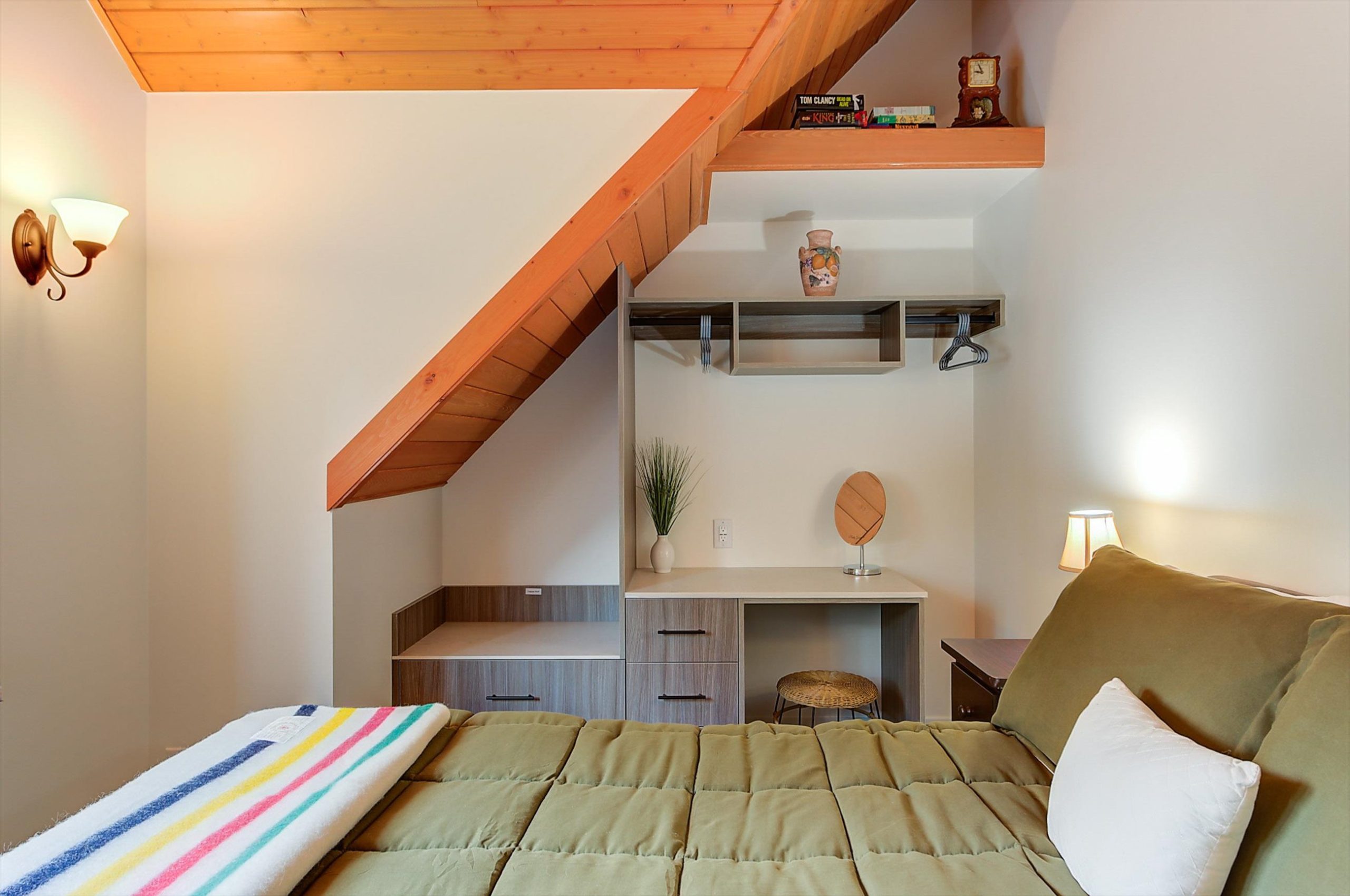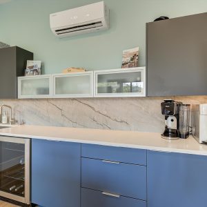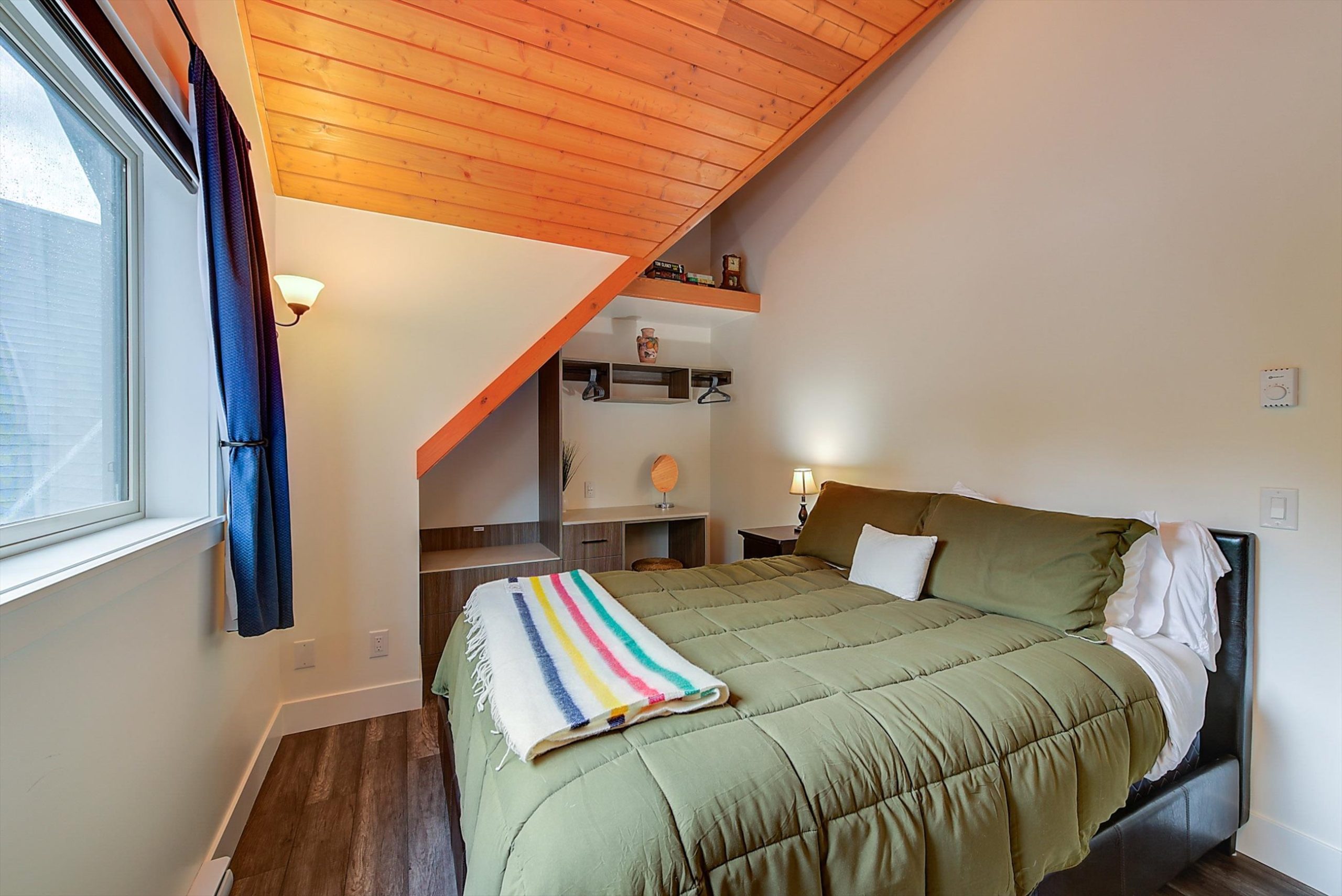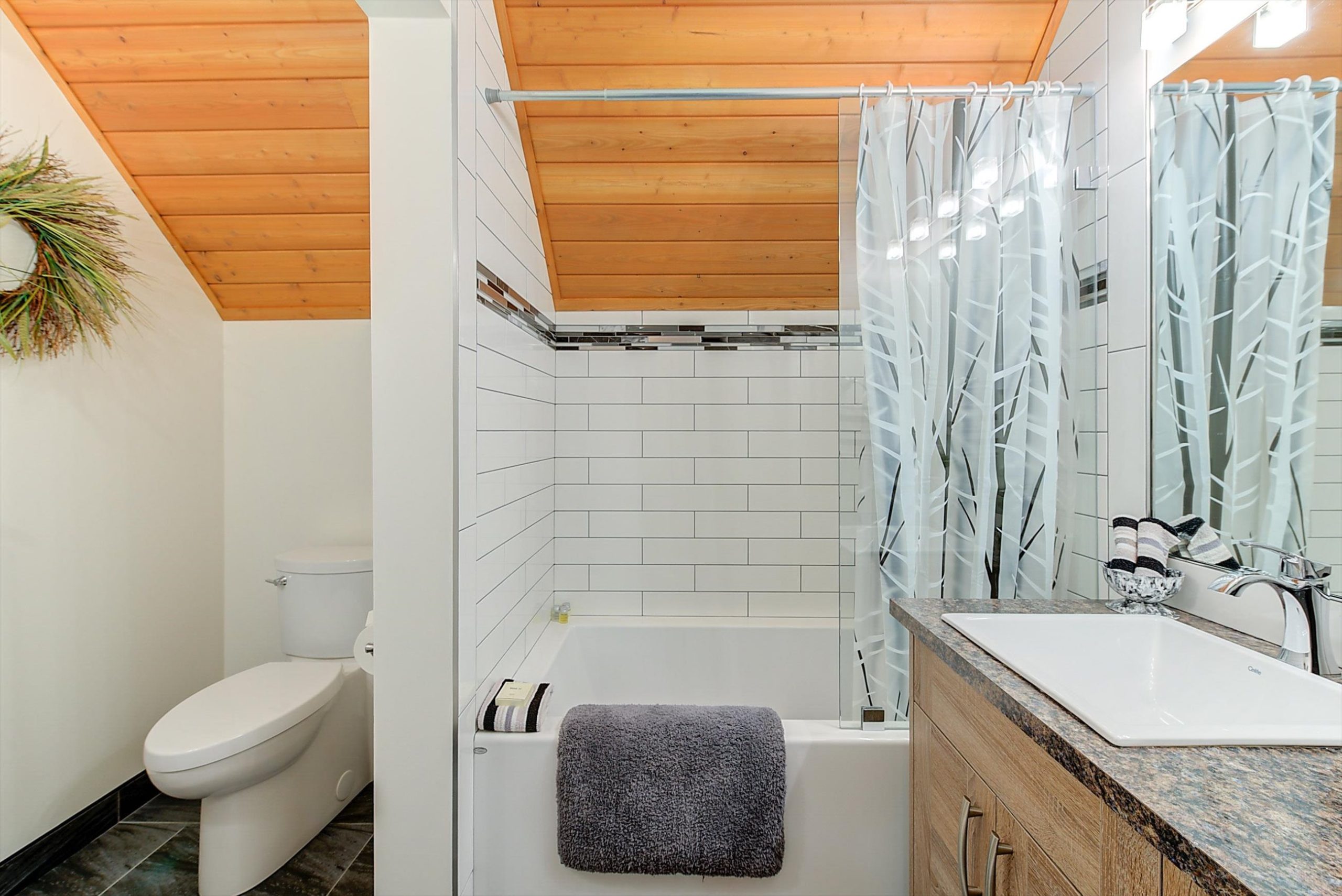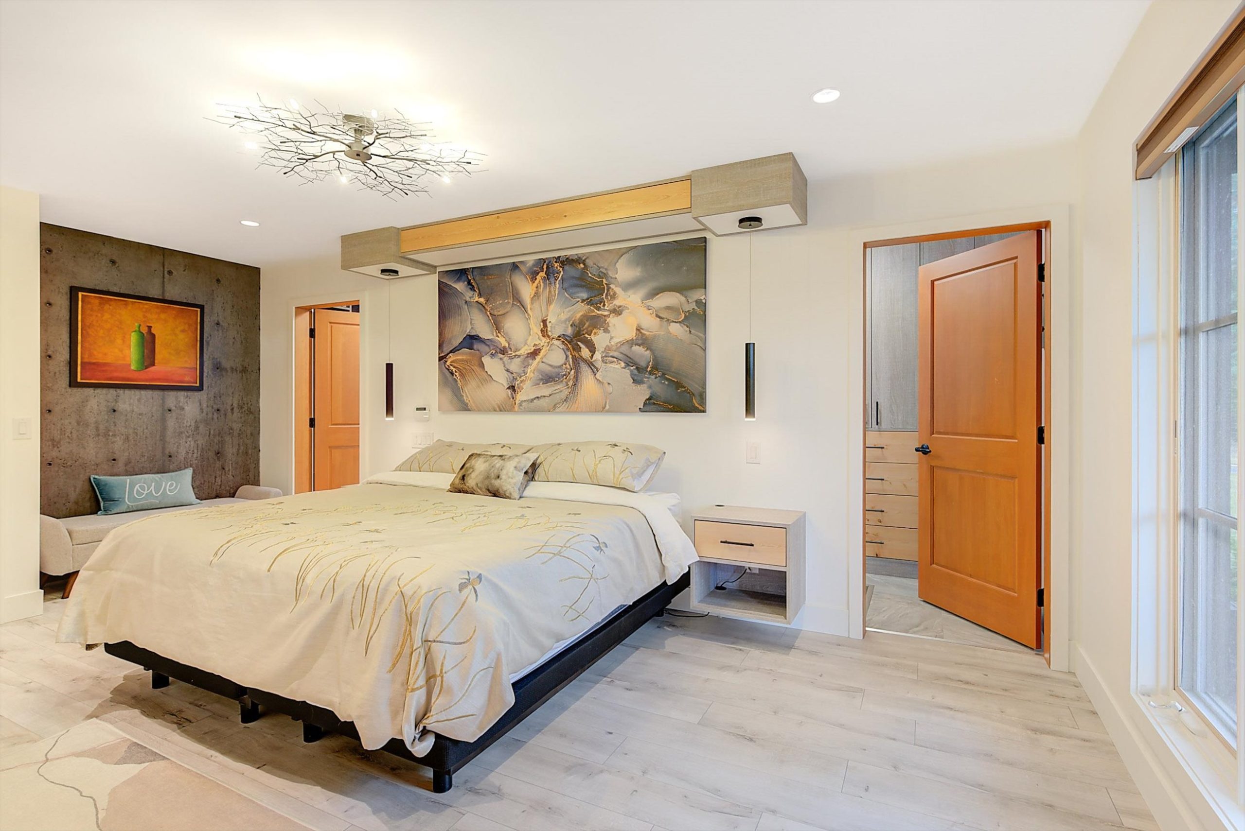 Inside, vaulted ceilings, rich wood detailing, and exposed beams create a warm yet elevated atmosphere. The open-concept main living area is anchored by a chef’s kitchen with quartz surfaces, premium appliances, and an oversized island, seamlessly connecting to the dining and living areas and extending to a covered outdoor space with serene views.