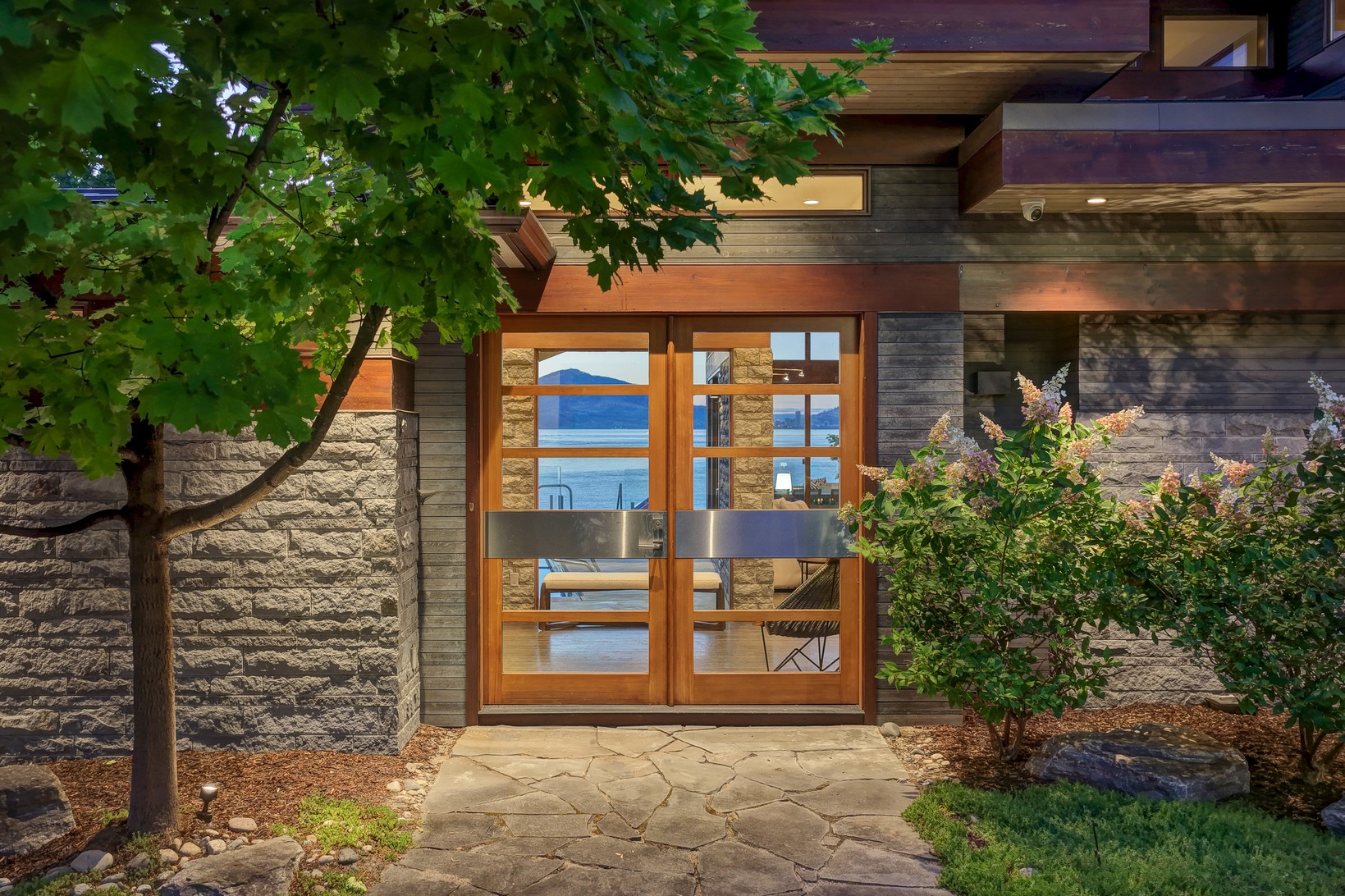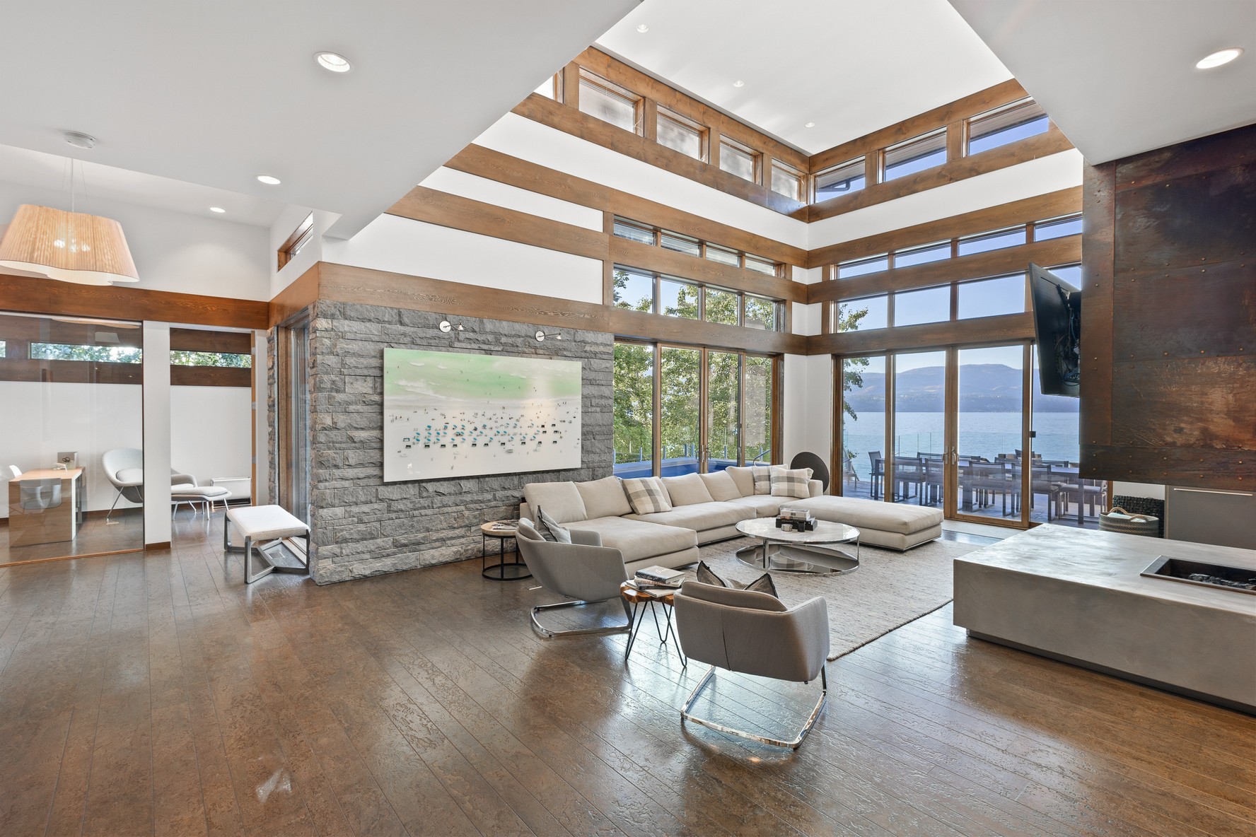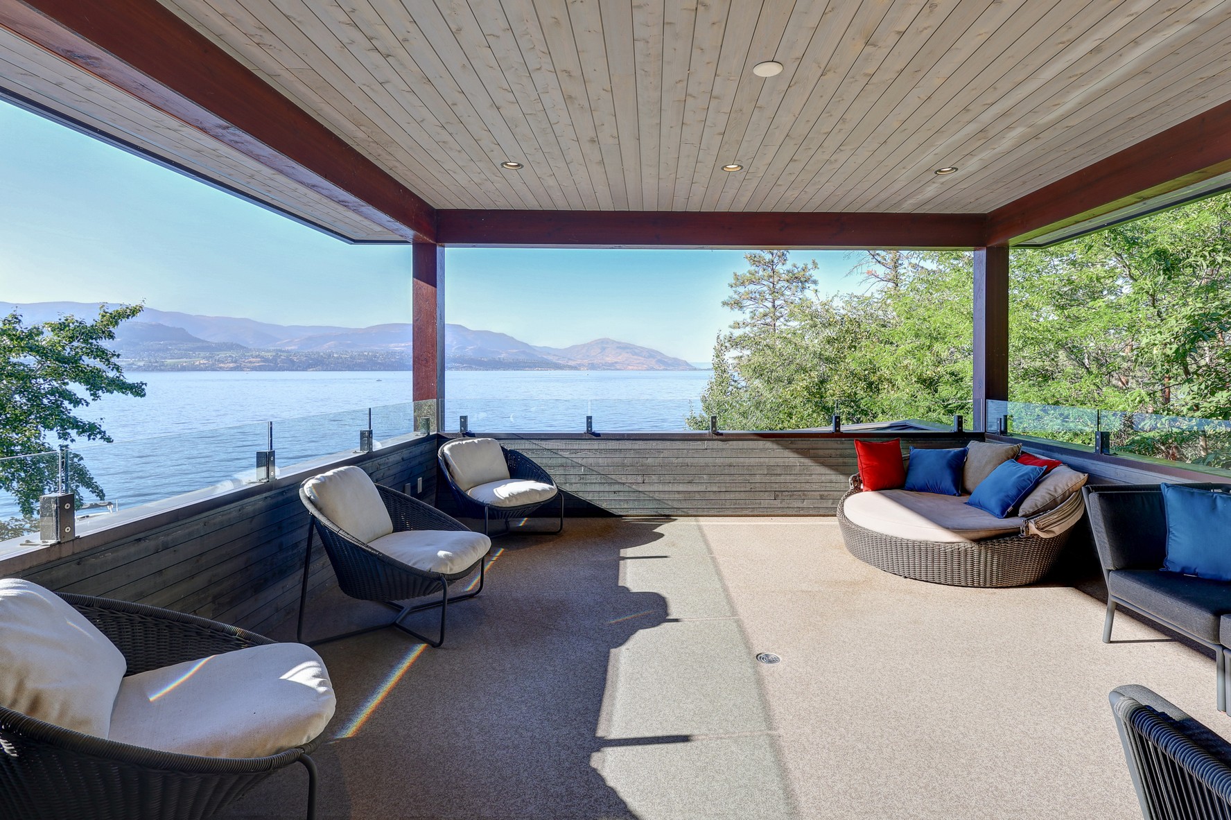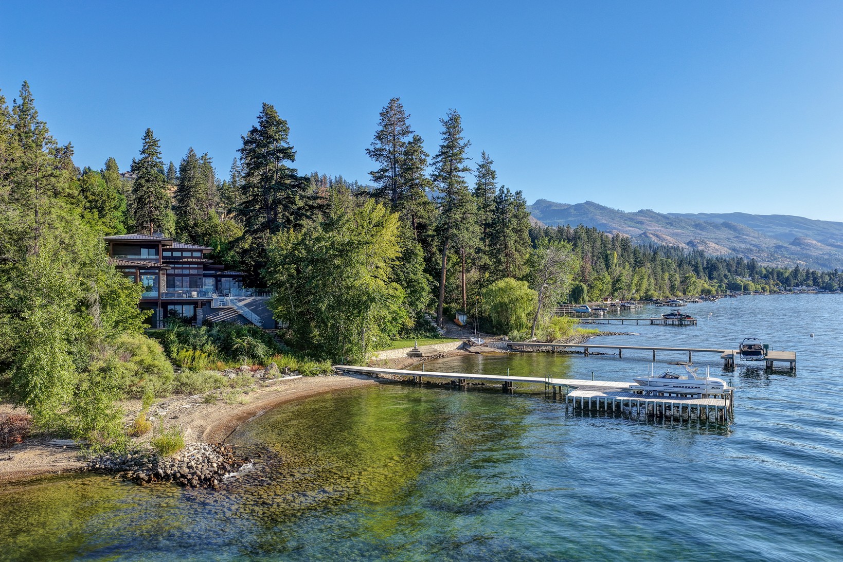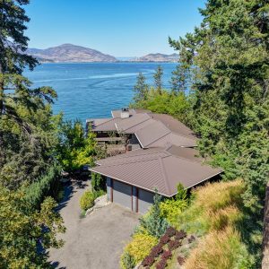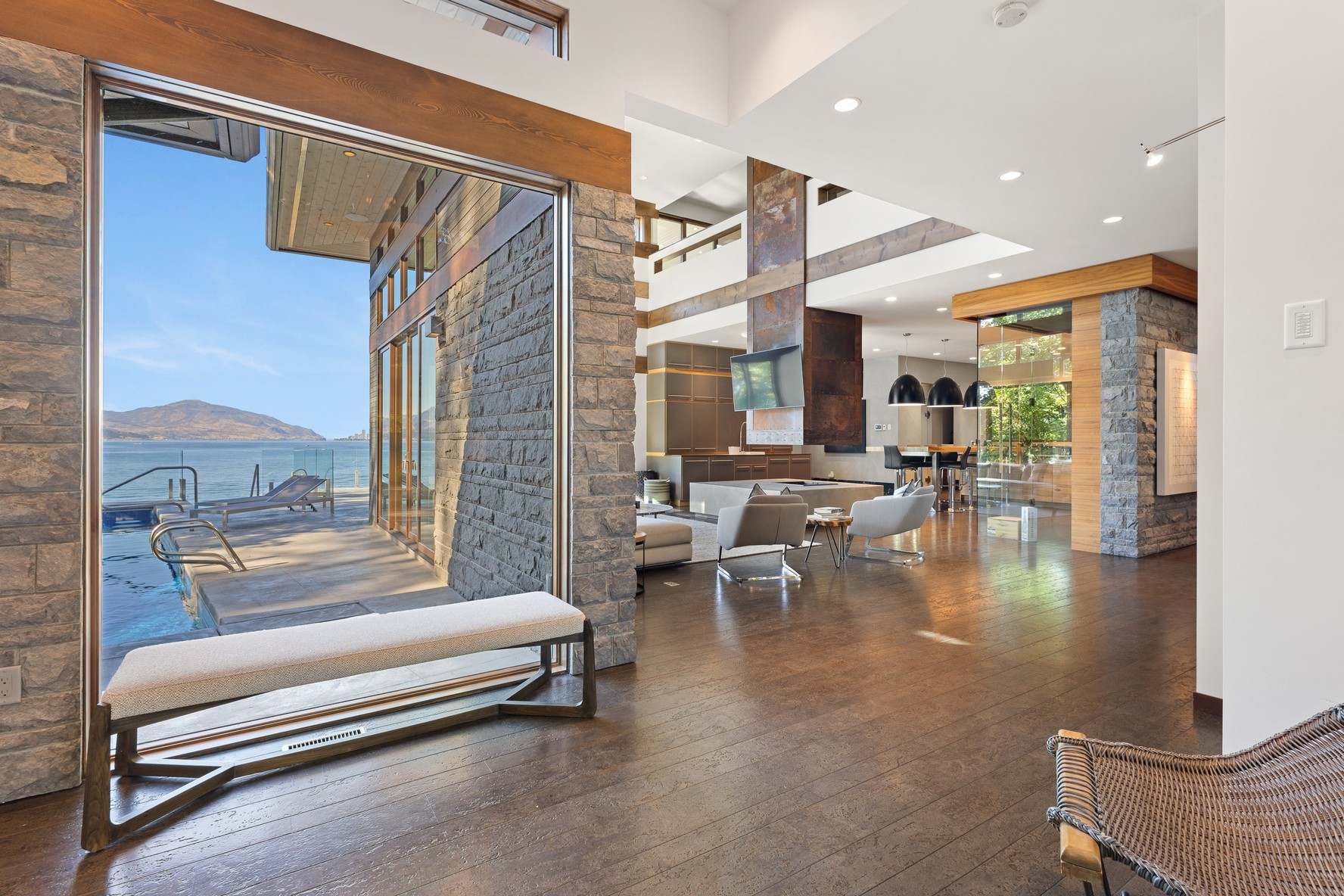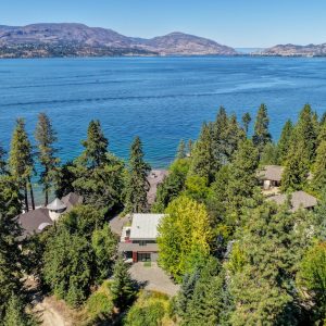 An architectural showpiece set behind gates on Okanagan Lake, this extraordinary lakeshore estate offers exceptional privacy and a truly elevated waterfront lifestyle. A long, winding drive framed by mature cedars and curated gardens reveals striking architecture — a refined blend of stone, cedar and metal roofing — positioned to capture panoramic lake, bridge and mountain views. With 112 ft of shoreline, the setting is as impressive as the residence itself.