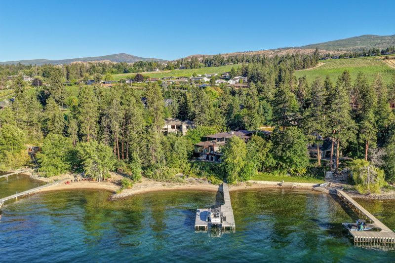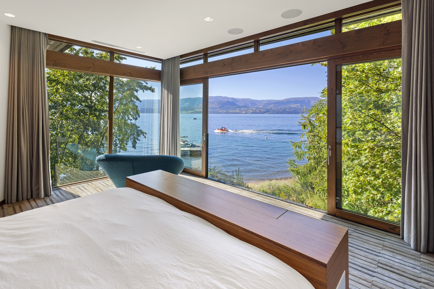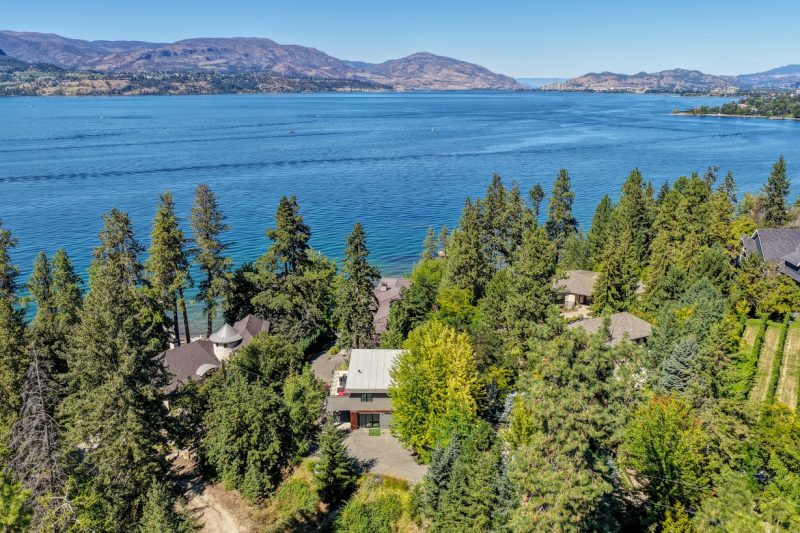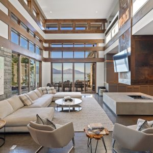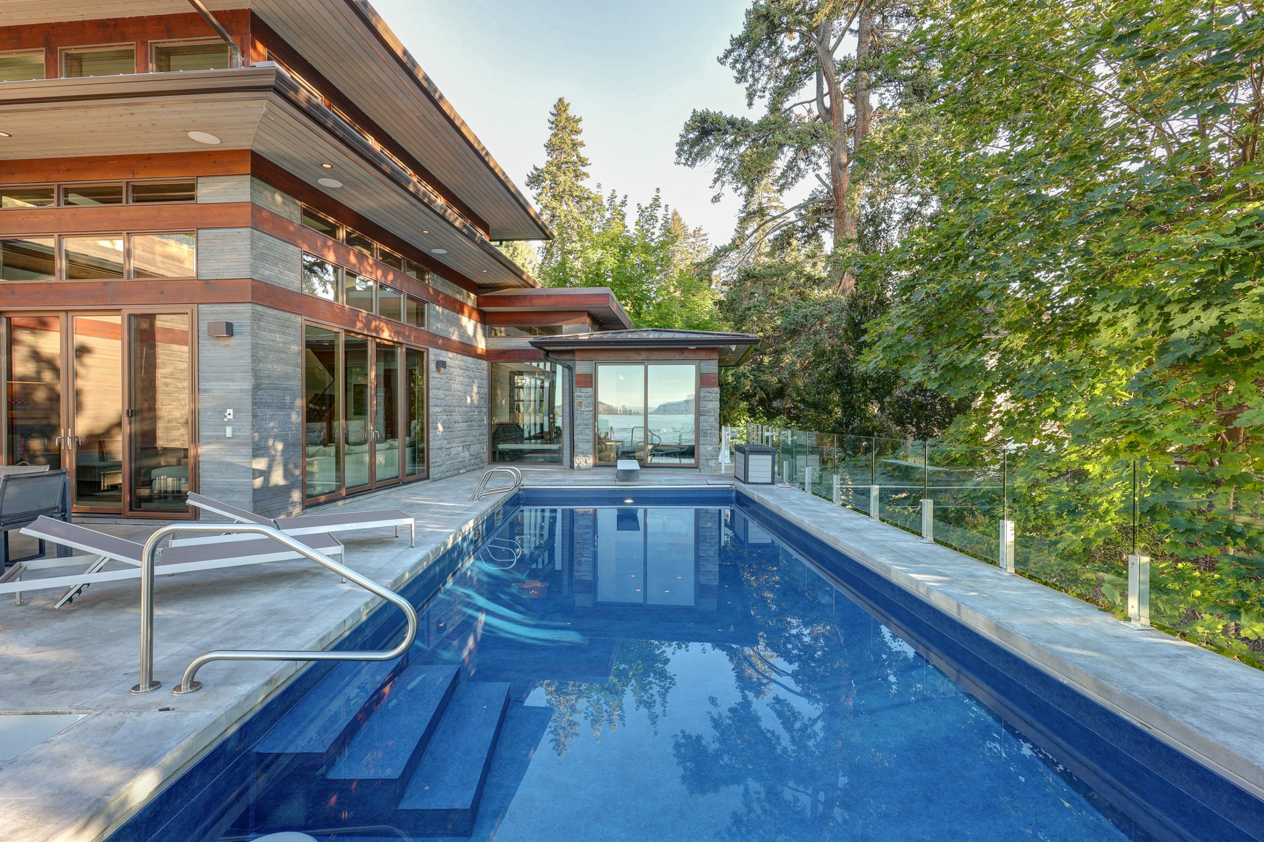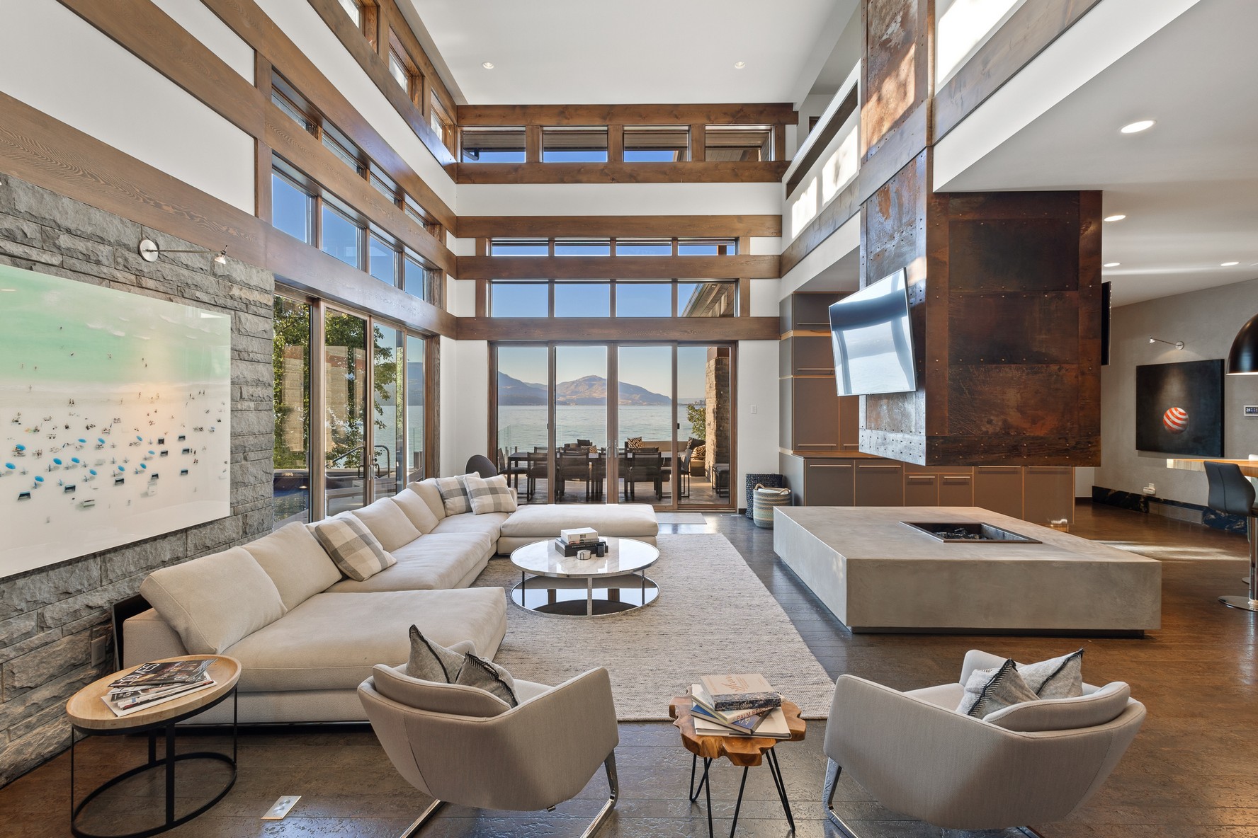 An architectural showpiece set behind gates on Okanagan Lake, this extraordinary lakeshore estate offers exceptional privacy and a truly elevated waterfront lifestyle. A long, winding drive framed by mature cedars and curated gardens reveals striking architecture — a refined blend of stone, cedar and metal roofing — positioned to capture panoramic lake, bridge and mountain views. With 112 ft of shoreline, the setting is as impressive as the residence itself.