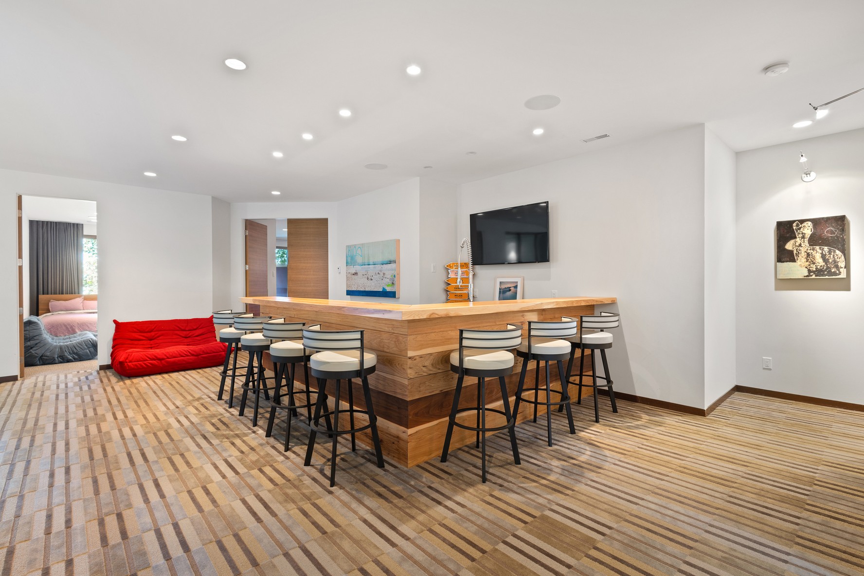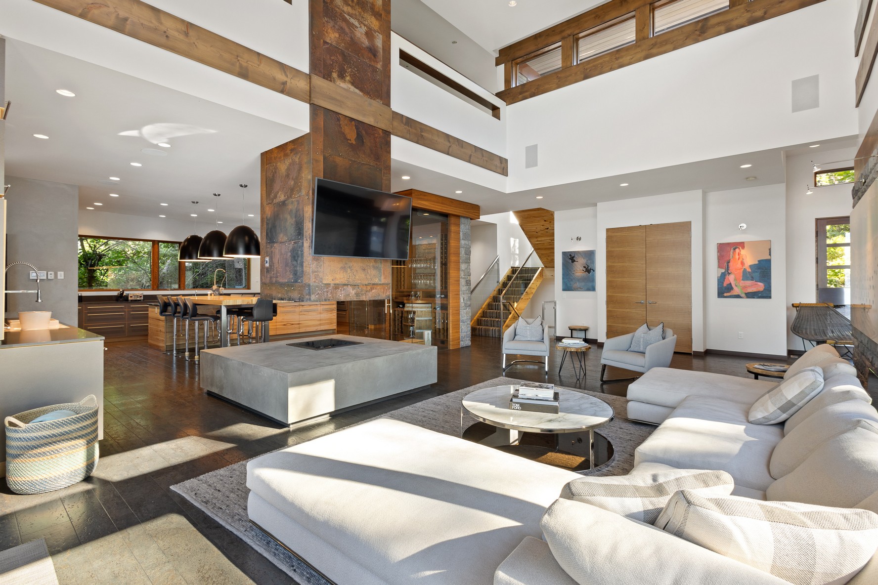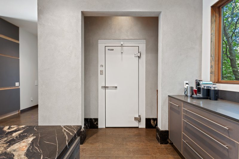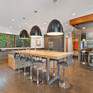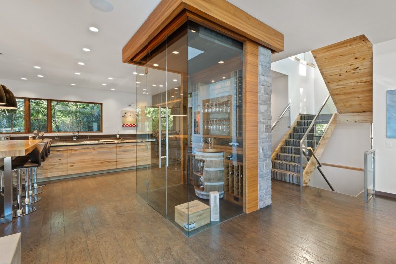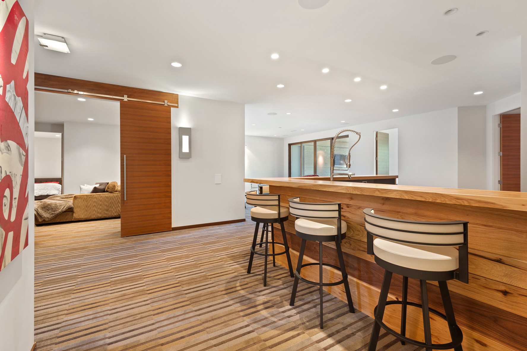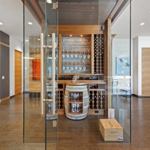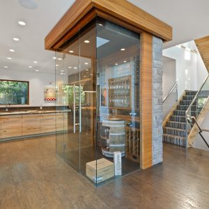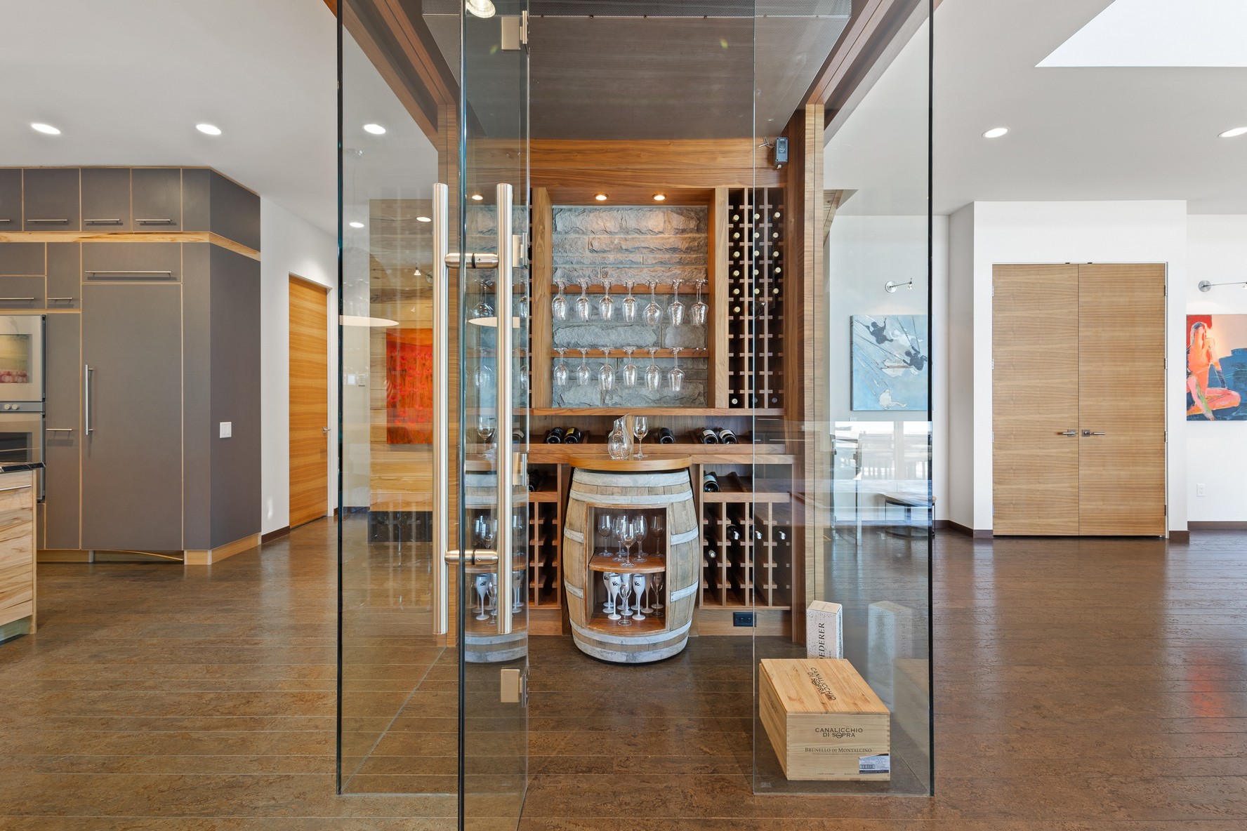 Inside, cork plank flooring, exposed beams and soaring ceilings create warmth and texture against dramatic steel and stone accents. Walls of glass open the great room to the pool terrace, creating seamless indoor-outdoor living. A glass-walled, temperature-controlled wine room adds a stunning focal point. The chef’s kitchen is designed for serious entertaining with a leathered granite island, quartz counters, Thermador induction cooktop, Gaggenau appliances, dual Miele dishwashers and a commercial-grade walk-in cooler.