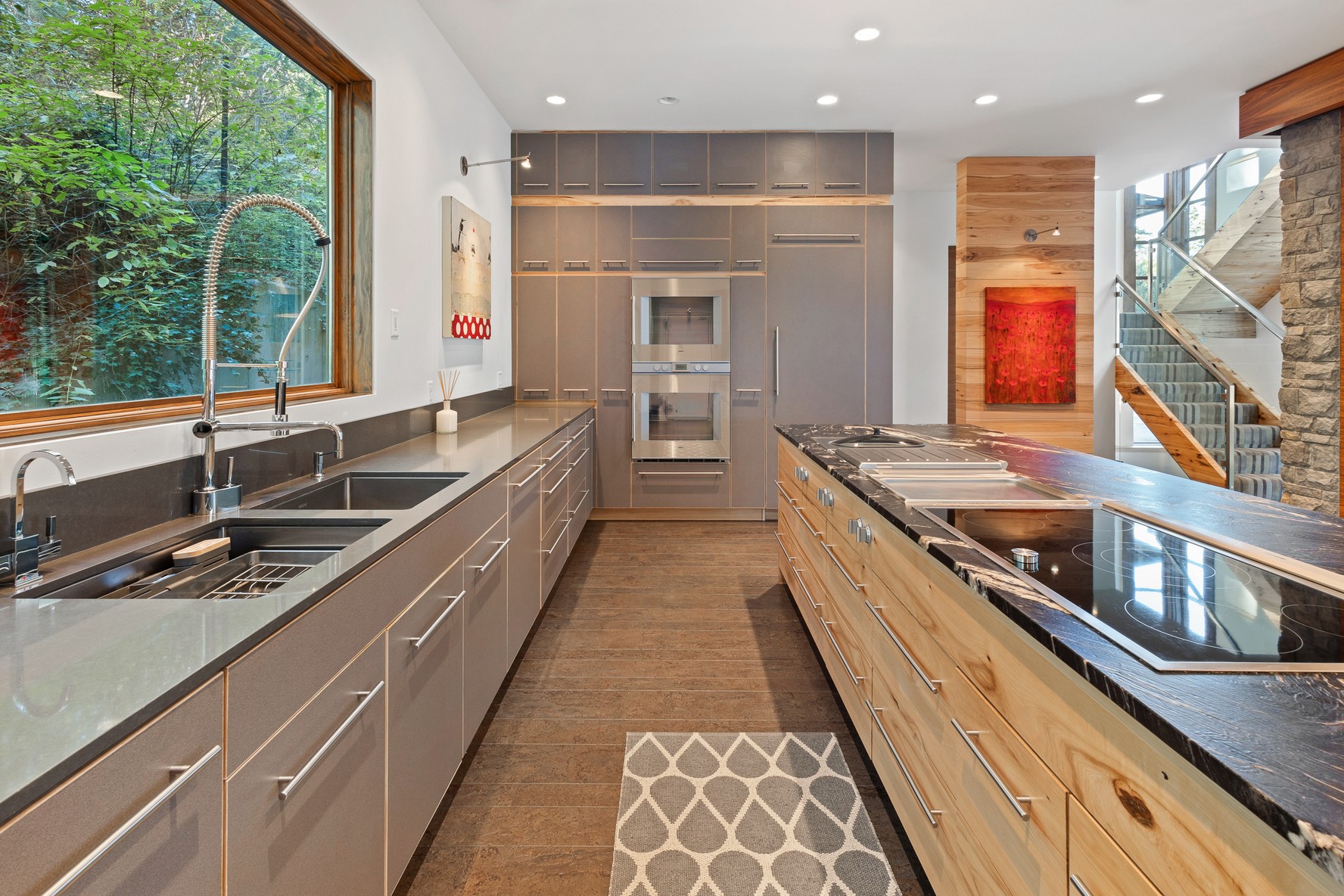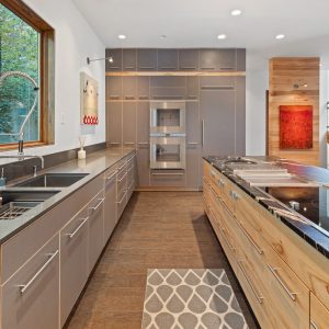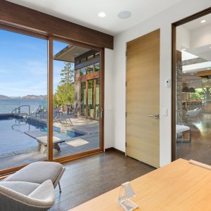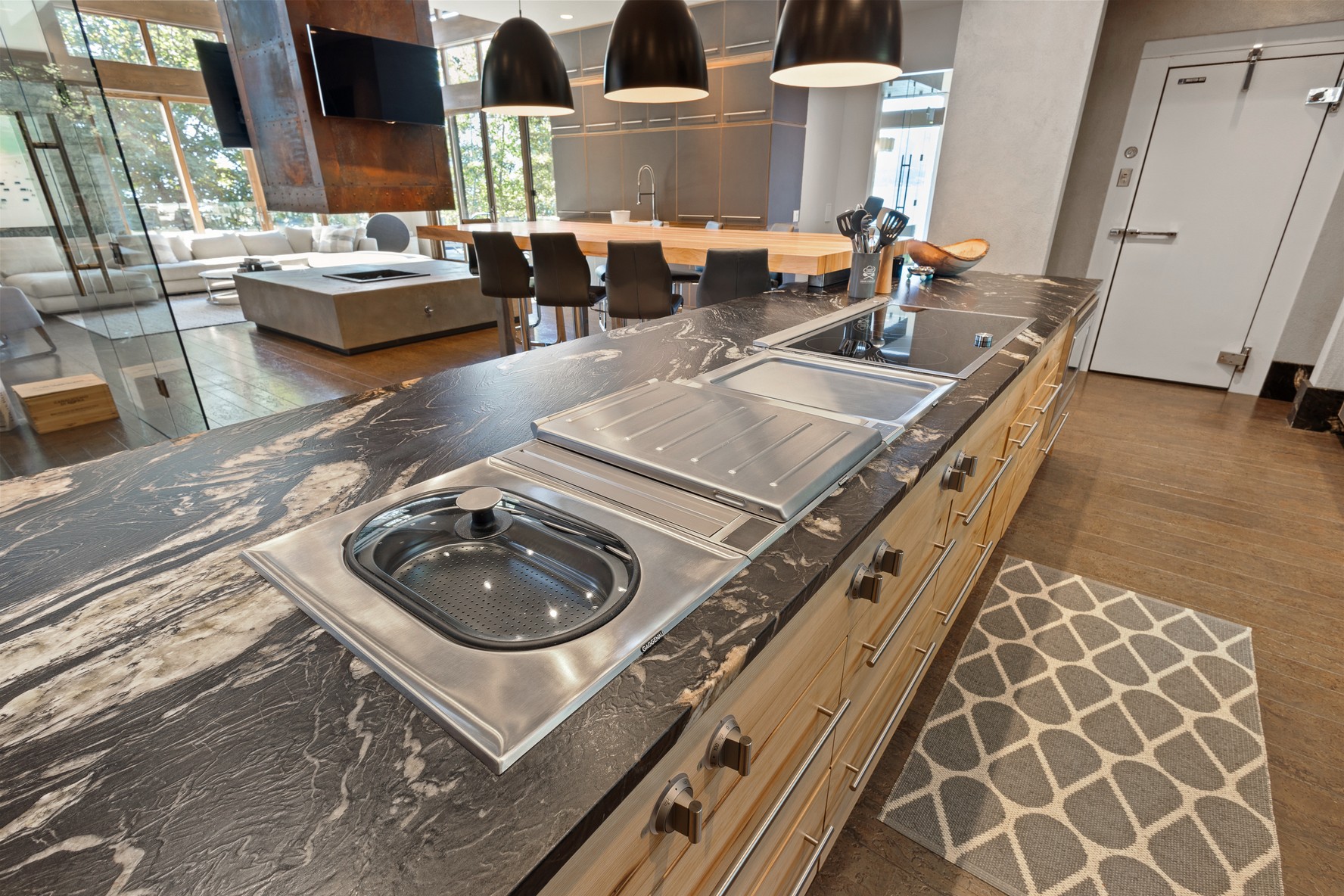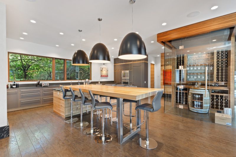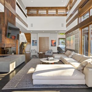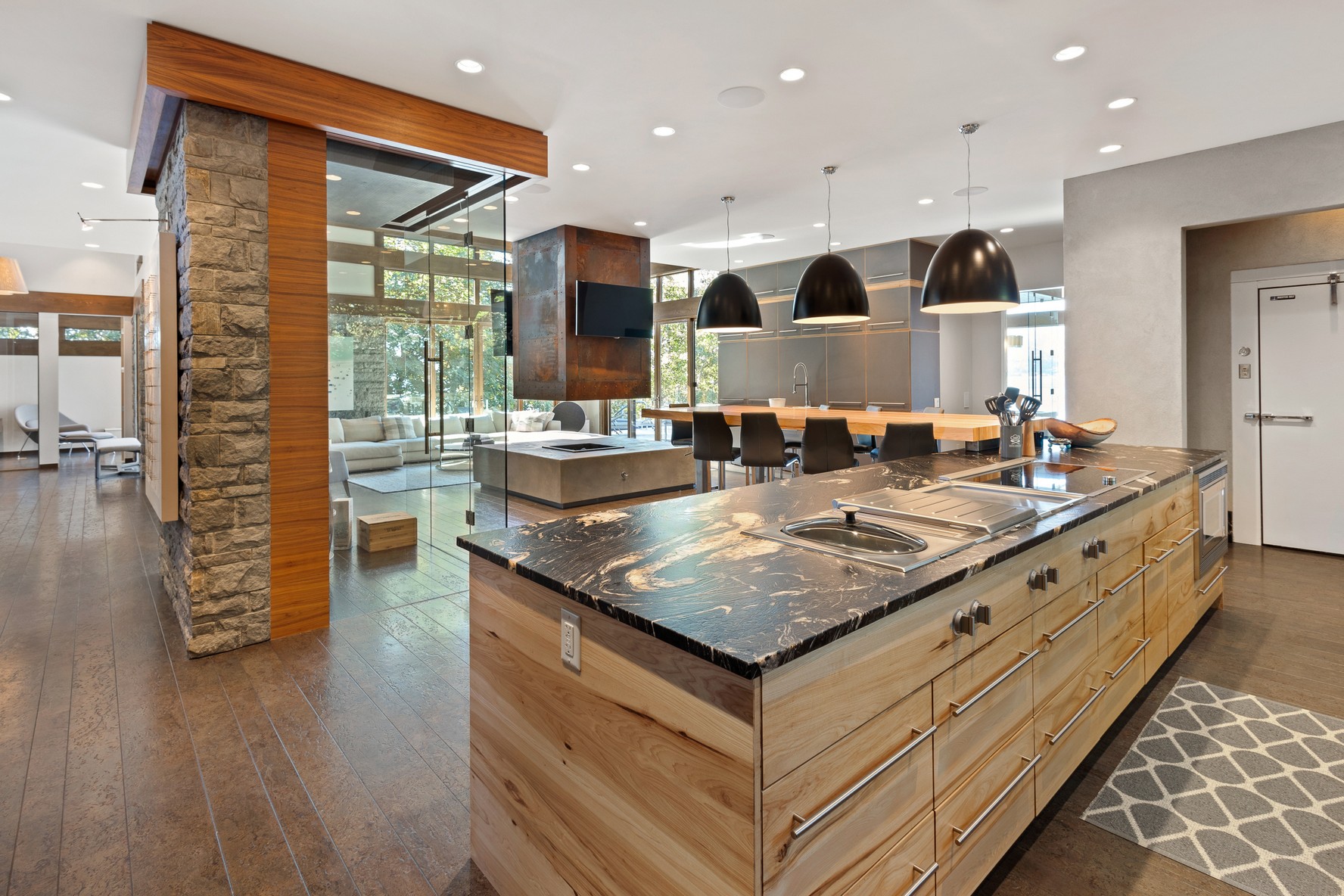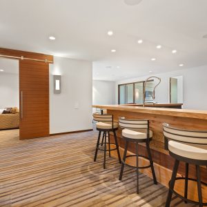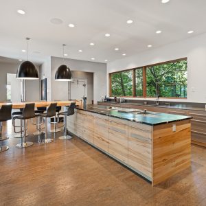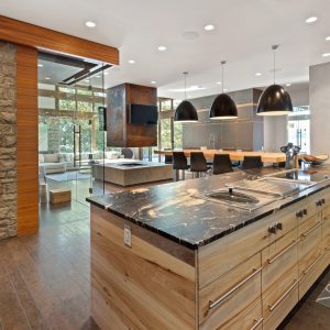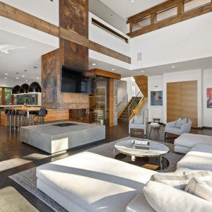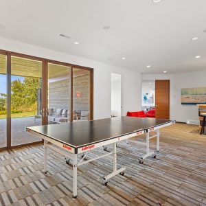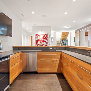 Inside, cork plank flooring, exposed beams and soaring ceilings create warmth and texture against dramatic steel and stone accents. Walls of glass open the great room to the pool terrace, creating seamless indoor-outdoor living. A glass-walled, temperature-controlled wine room adds a stunning focal point. The chef’s kitchen is designed for serious entertaining with a leathered granite island, quartz counters, Thermador induction cooktop, Gaggenau appliances, dual Miele dishwashers and a commercial-grade walk-in cooler.