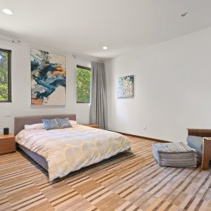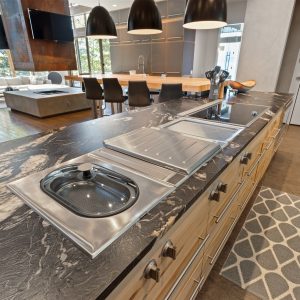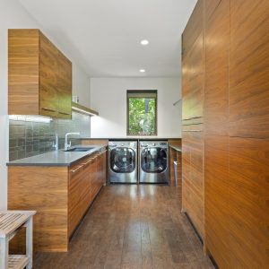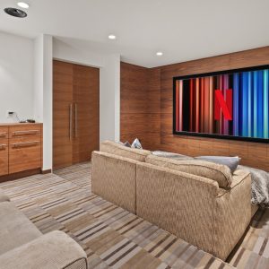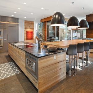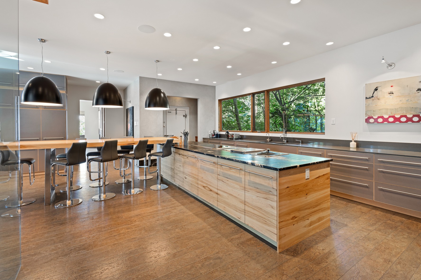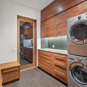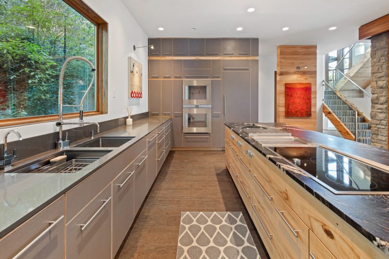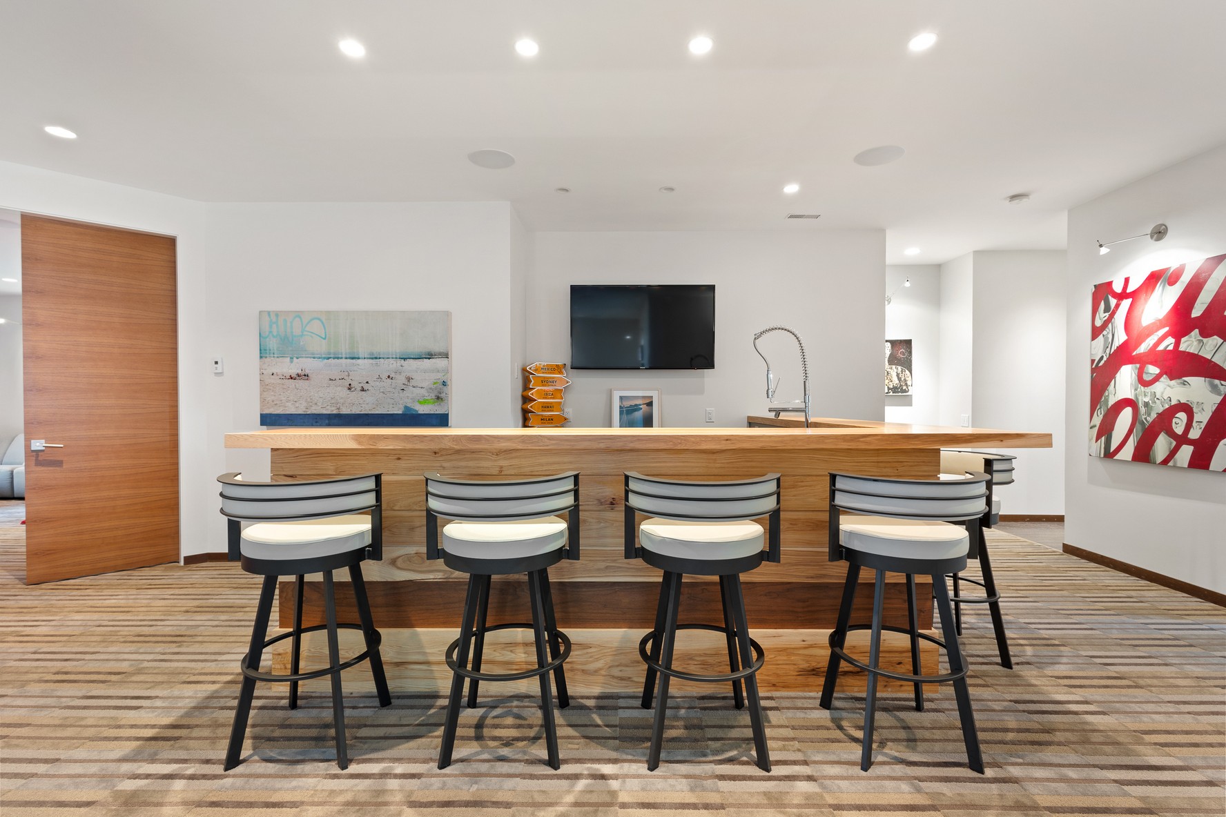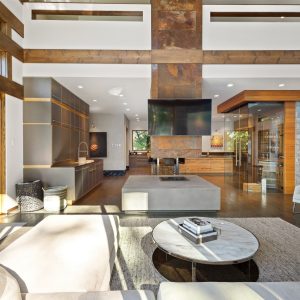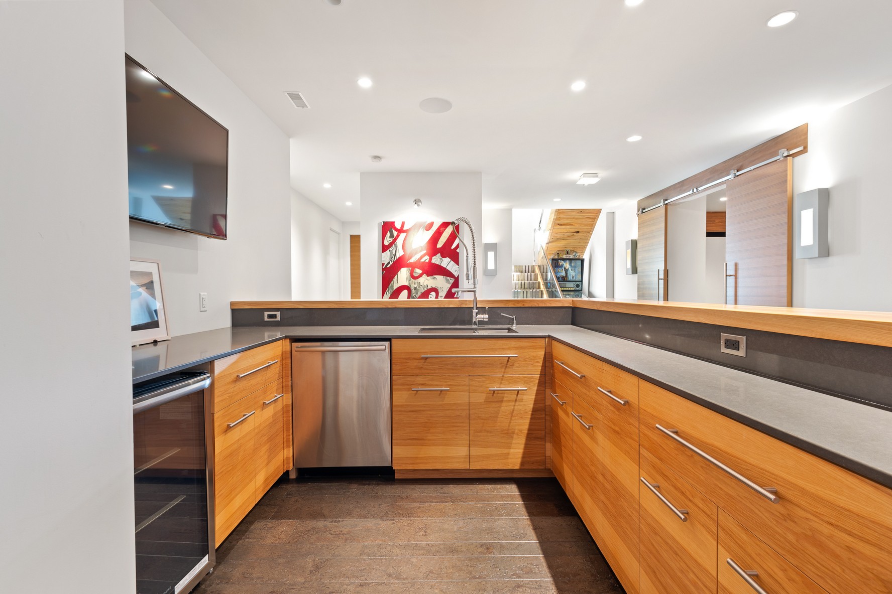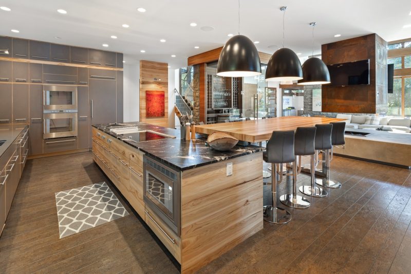 Inside, cork plank flooring, exposed beams and soaring ceilings create warmth and texture against dramatic steel and stone accents. Walls of glass open the great room to the pool terrace, creating seamless indoor-outdoor living. A glass-walled, temperature-controlled wine room adds a stunning focal point. The chef’s kitchen is designed for serious entertaining with a leathered granite island, quartz counters, Thermador induction cooktop, Gaggenau appliances, dual Miele dishwashers and a commercial-grade walk-in cooler.
