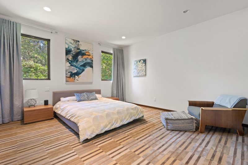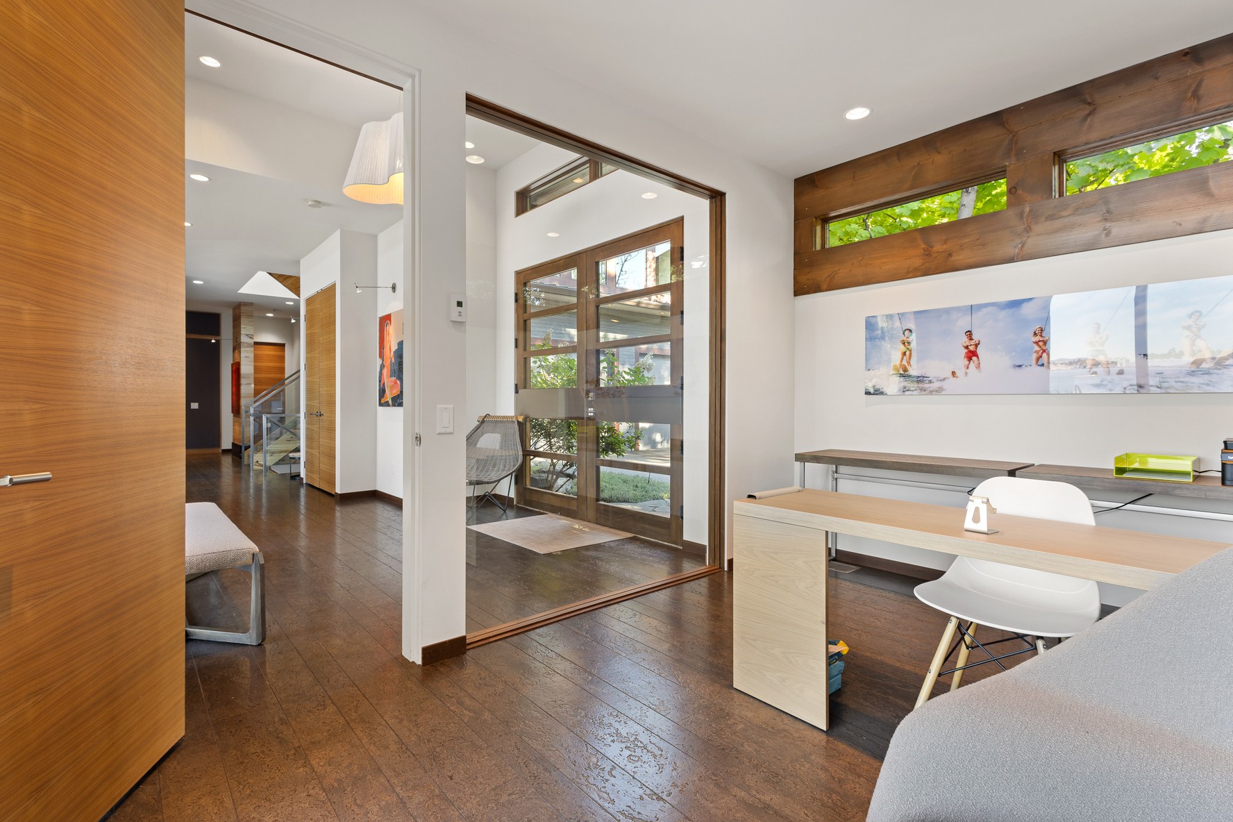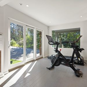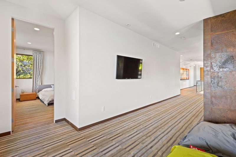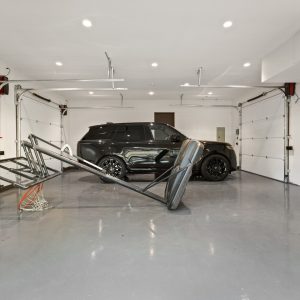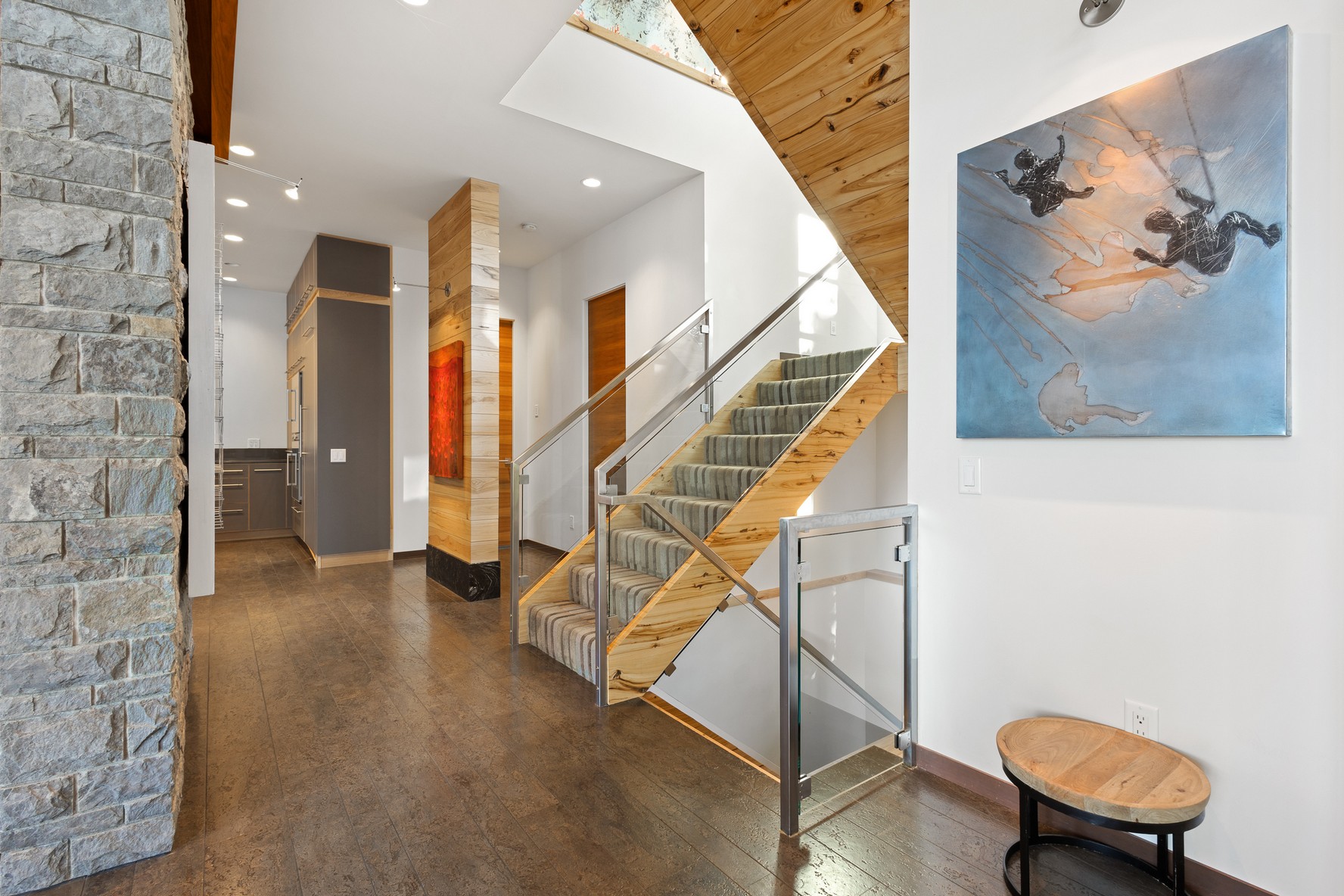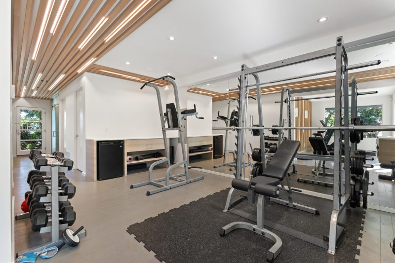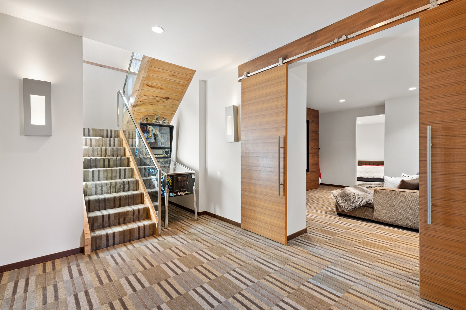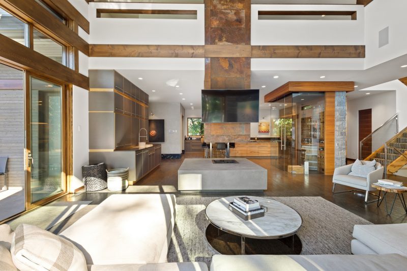 Inside, cork plank flooring, exposed beams and soaring ceilings create warmth and texture against dramatic steel and stone accents. Walls of glass open the great room to the pool terrace, creating seamless indoor-outdoor living. A glass-walled, temperature-controlled wine room adds a stunning focal point. The chef’s kitchen is designed for serious entertaining with a leathered granite island, quartz counters, Thermador induction cooktop, Gaggenau appliances, dual Miele dishwashers and a commercial-grade walk-in cooler.