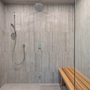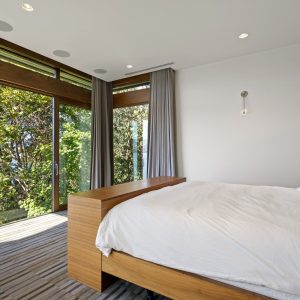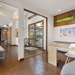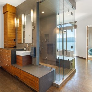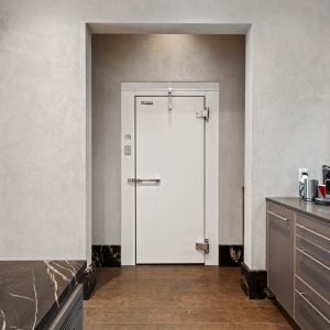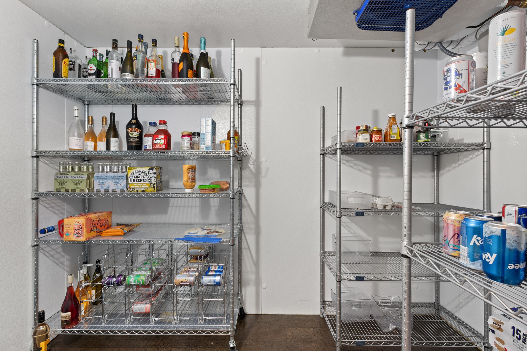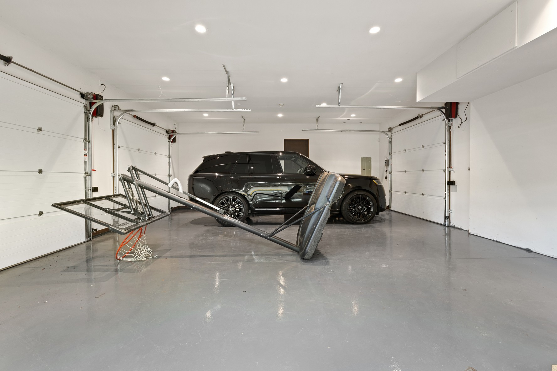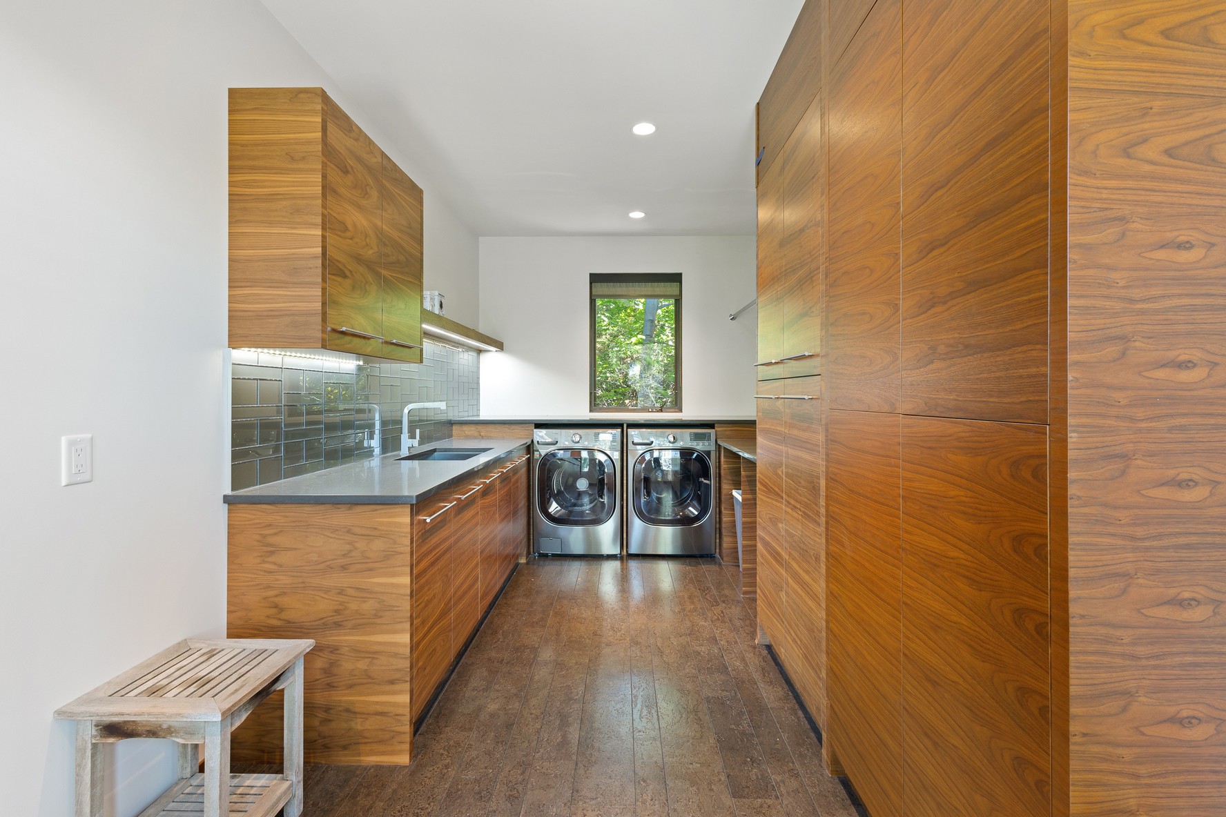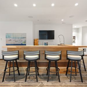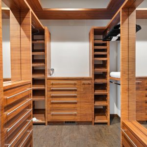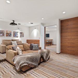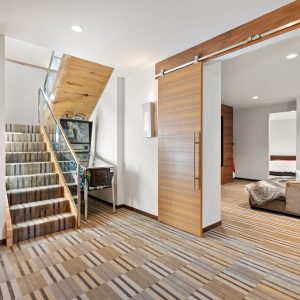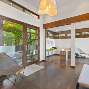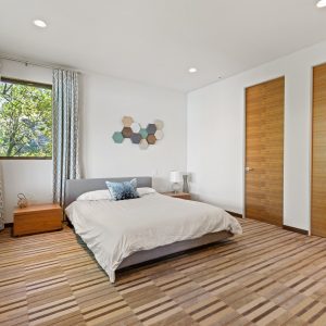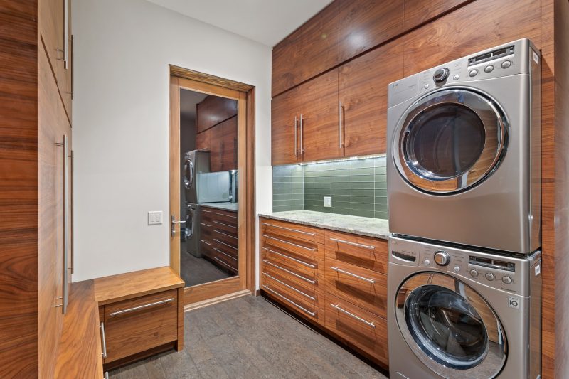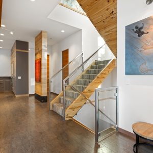 Inside, cork plank flooring, exposed beams and soaring ceilings create warmth and texture against dramatic steel and stone accents. Walls of glass open the great room to the pool terrace, creating seamless indoor-outdoor living. A glass-walled, temperature-controlled wine room adds a stunning focal point. The chef’s kitchen is designed for serious entertaining with a leathered granite island, quartz counters, Thermador induction cooktop, Gaggenau appliances, dual Miele dishwashers and a commercial-grade walk-in cooler.