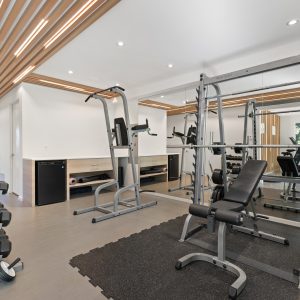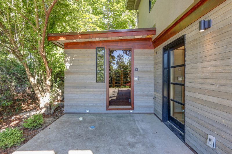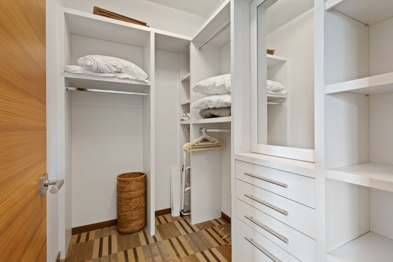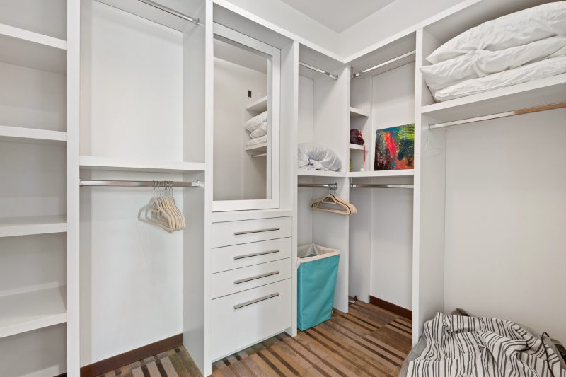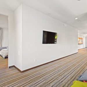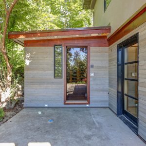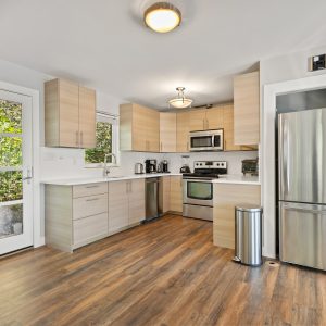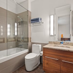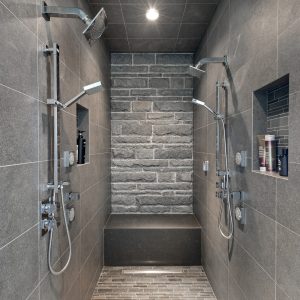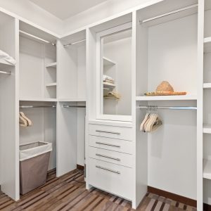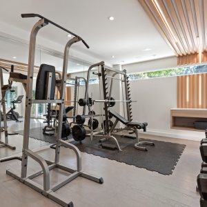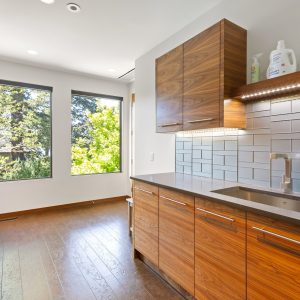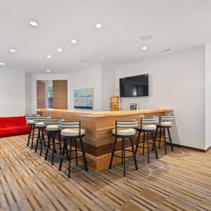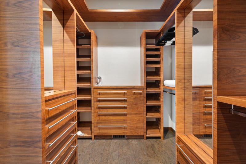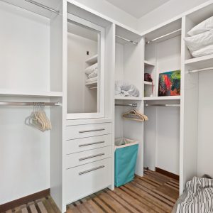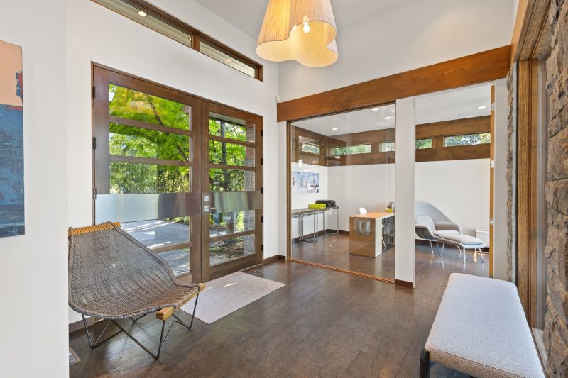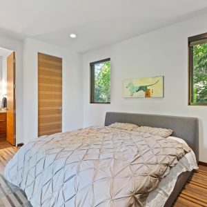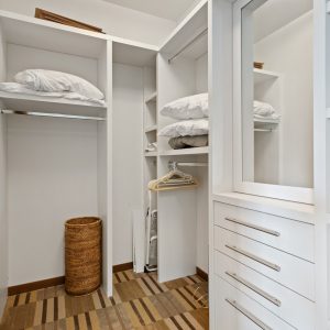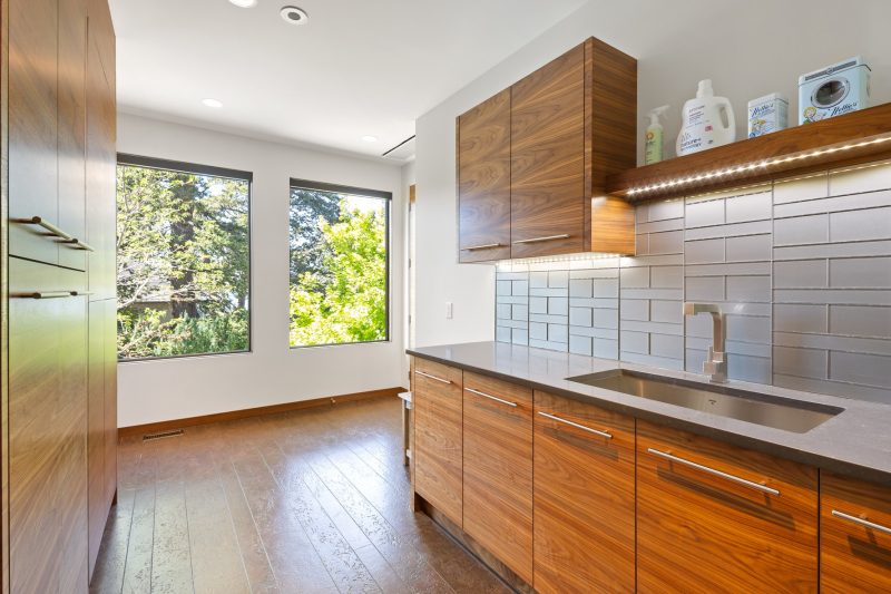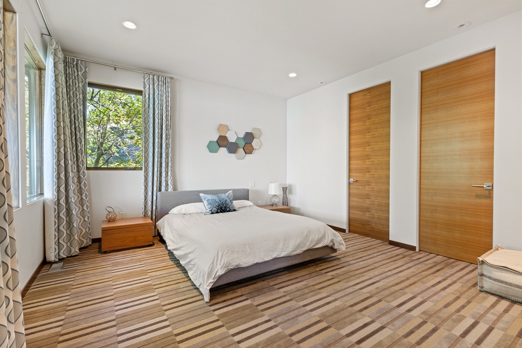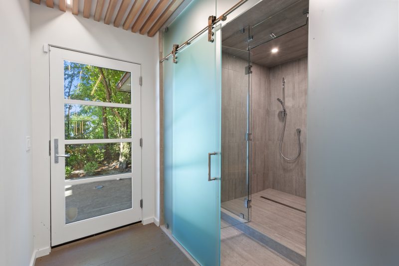 Inside, cork plank flooring, exposed beams and soaring ceilings create warmth and texture against dramatic steel and stone accents. Walls of glass open the great room to the pool terrace, creating seamless indoor-outdoor living. A glass-walled, temperature-controlled wine room adds a stunning focal point. The chef’s kitchen is designed for serious entertaining with a leathered granite island, quartz counters, Thermador induction cooktop, Gaggenau appliances, dual Miele dishwashers and a commercial-grade walk-in cooler.