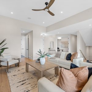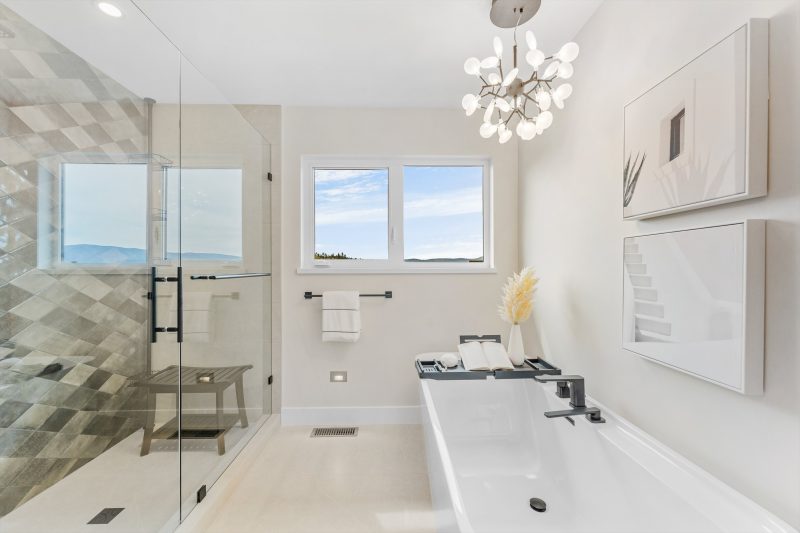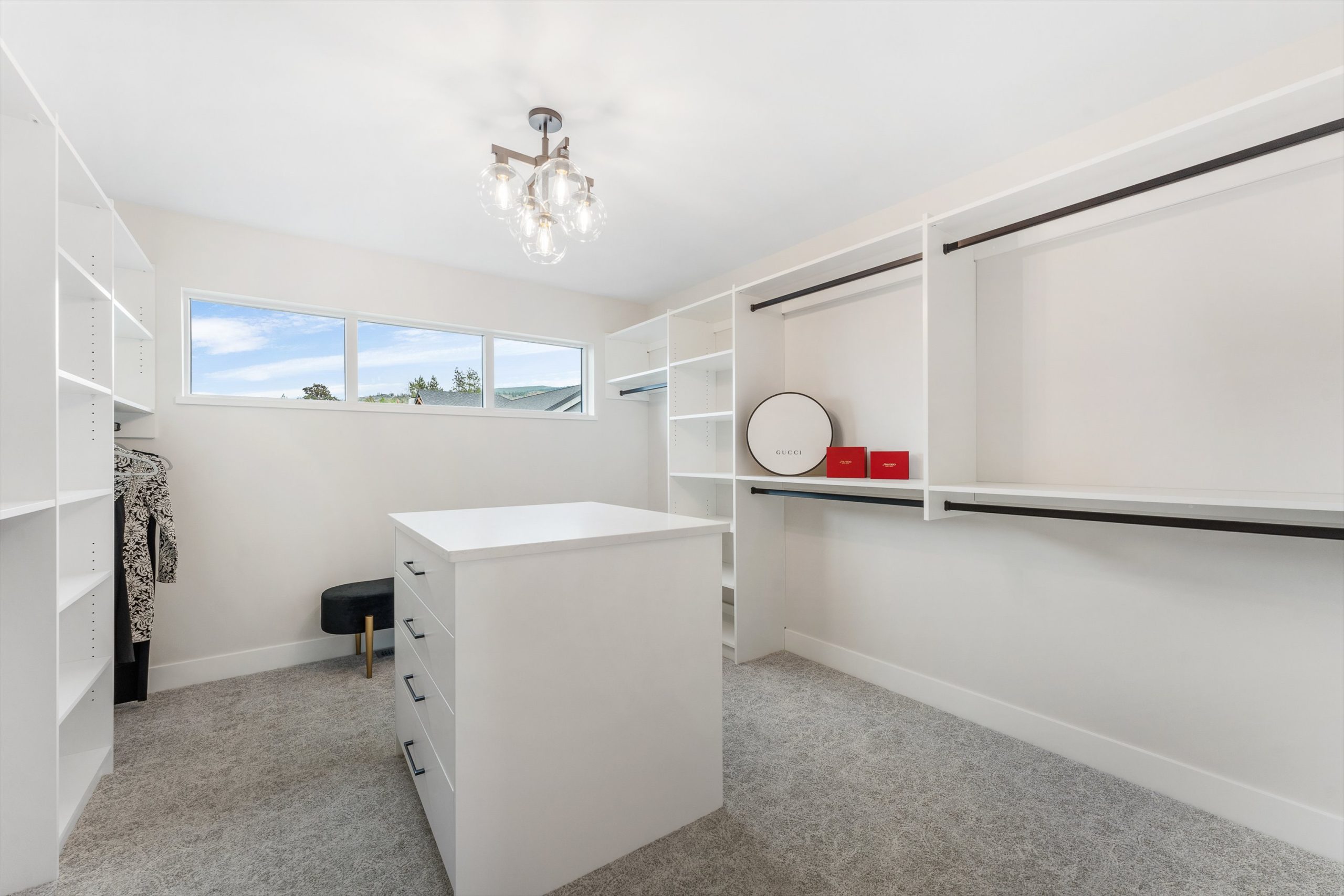 The top floor is entirely dedicated to the main primary suite with a large sun deck, sit down make-up vanity, free-standing soaker tub, custom tiled shower, and large walk-in closet with an island.