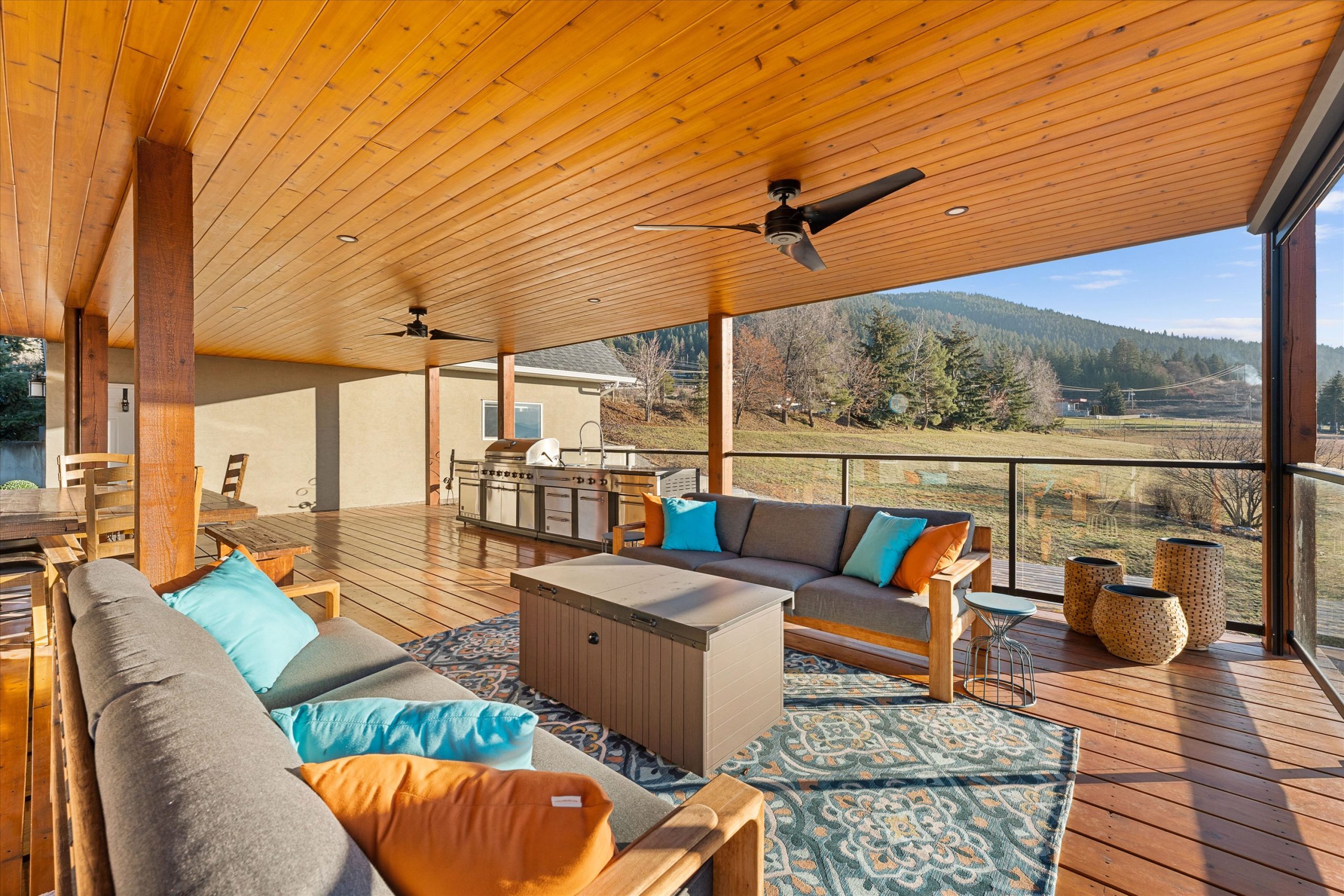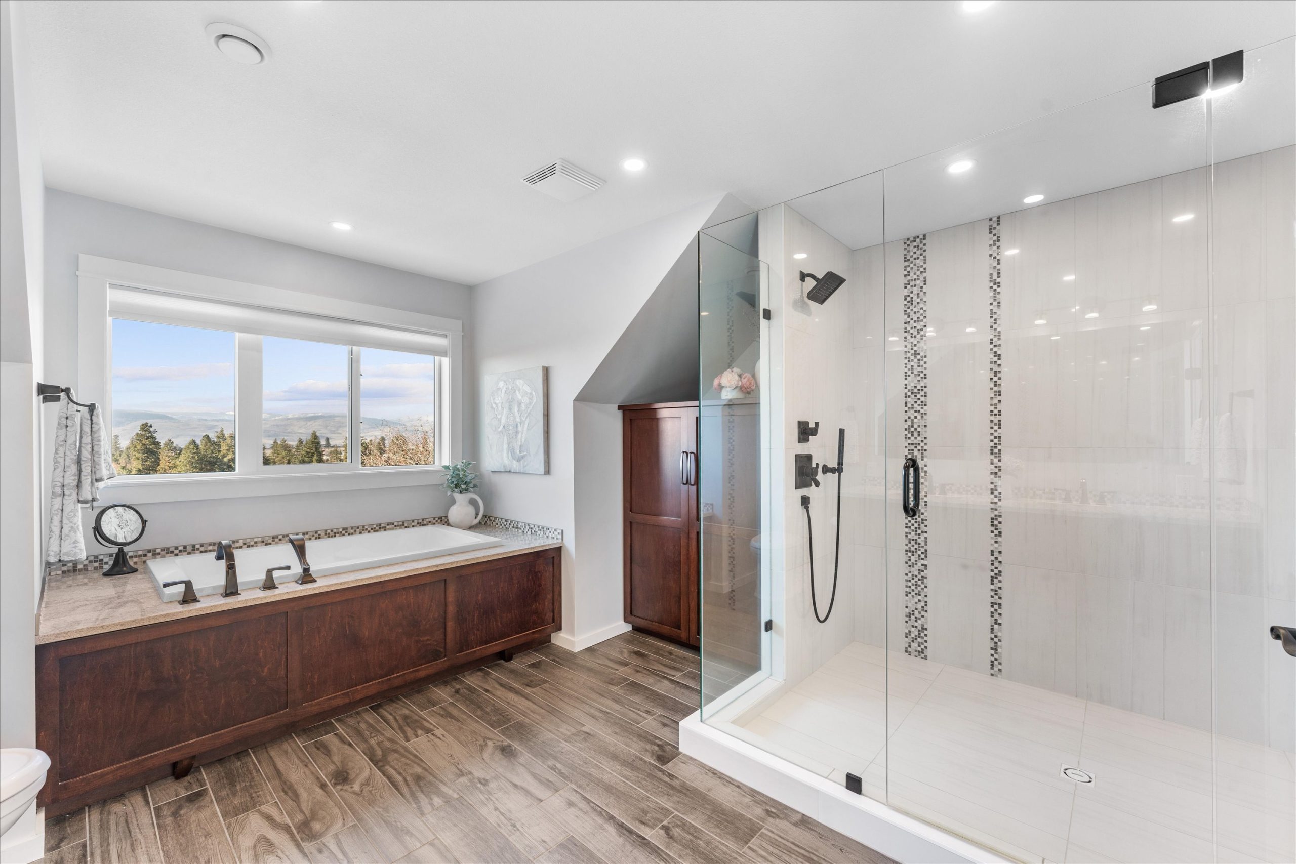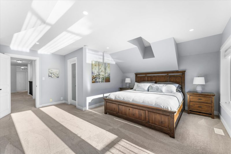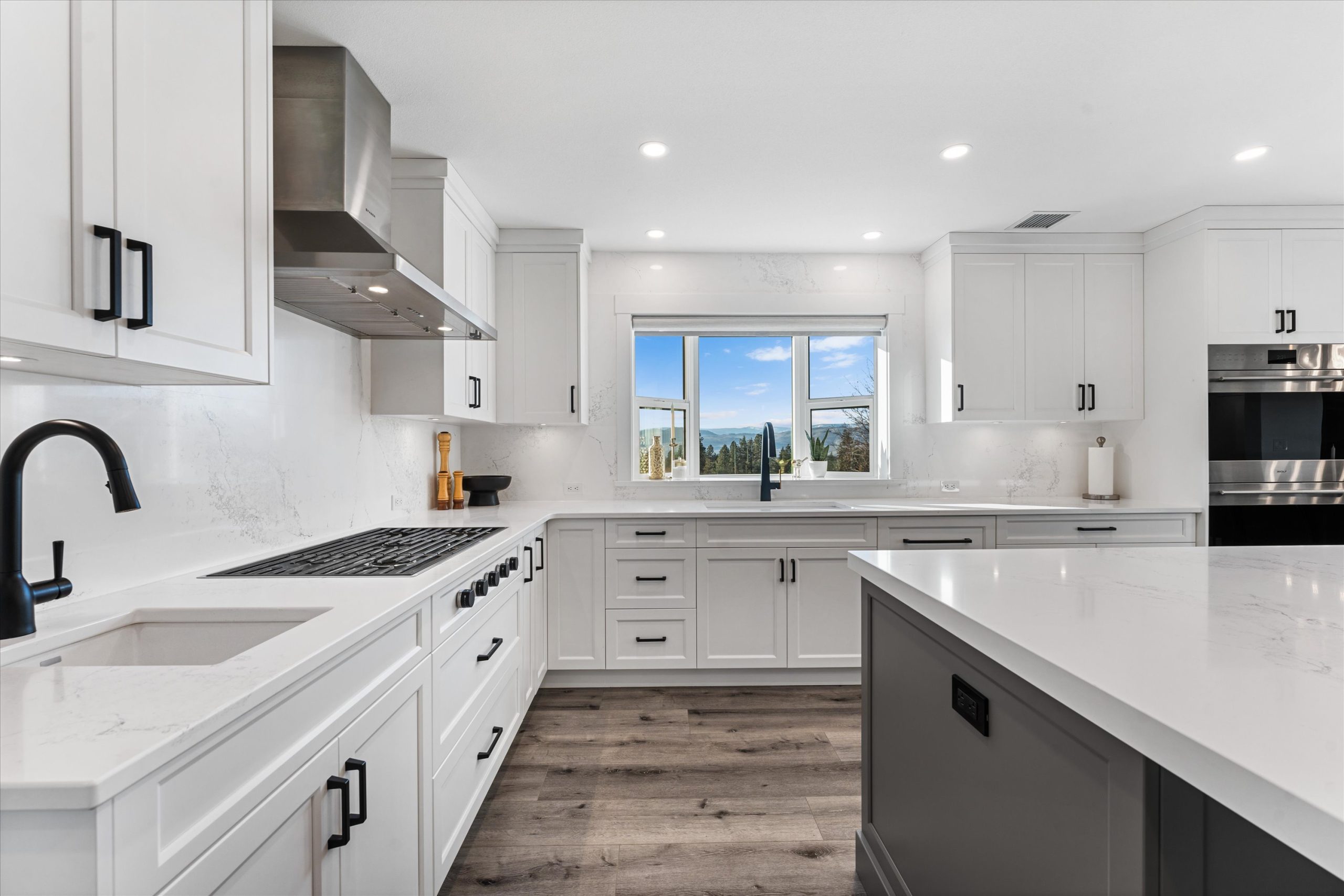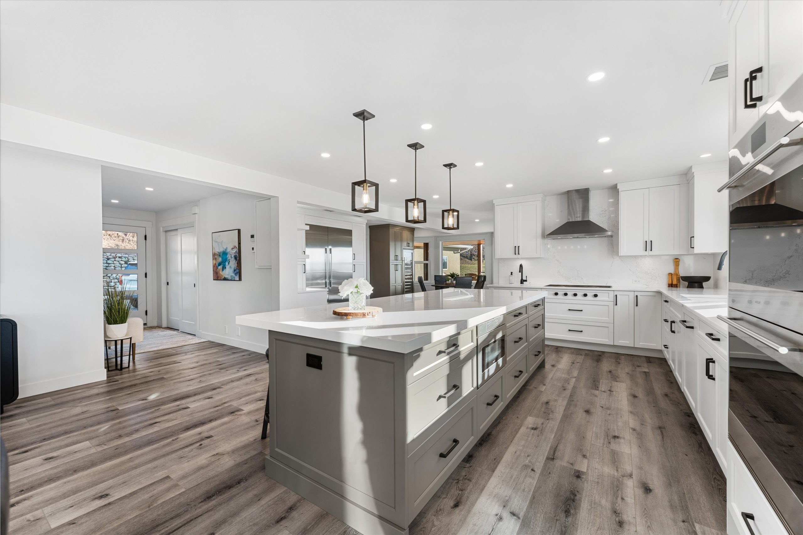 A chef’s kitchen with Wolf appliances, a Fisher & Paykel built-in fridge, butler’s pantry, and large island opens to sun-filled living and dining spaces, along with a covered west-facing Western Red Cedar deck with hot tub for effortless indoor-outdoor entertaining. The upper-level primary suite is a true retreat with lake and orchard views, a Juliette balcony, and spa-inspired ensuite, while a separate one-bedroom in-law suite on the lower level offers private access, parking, and a patio.
