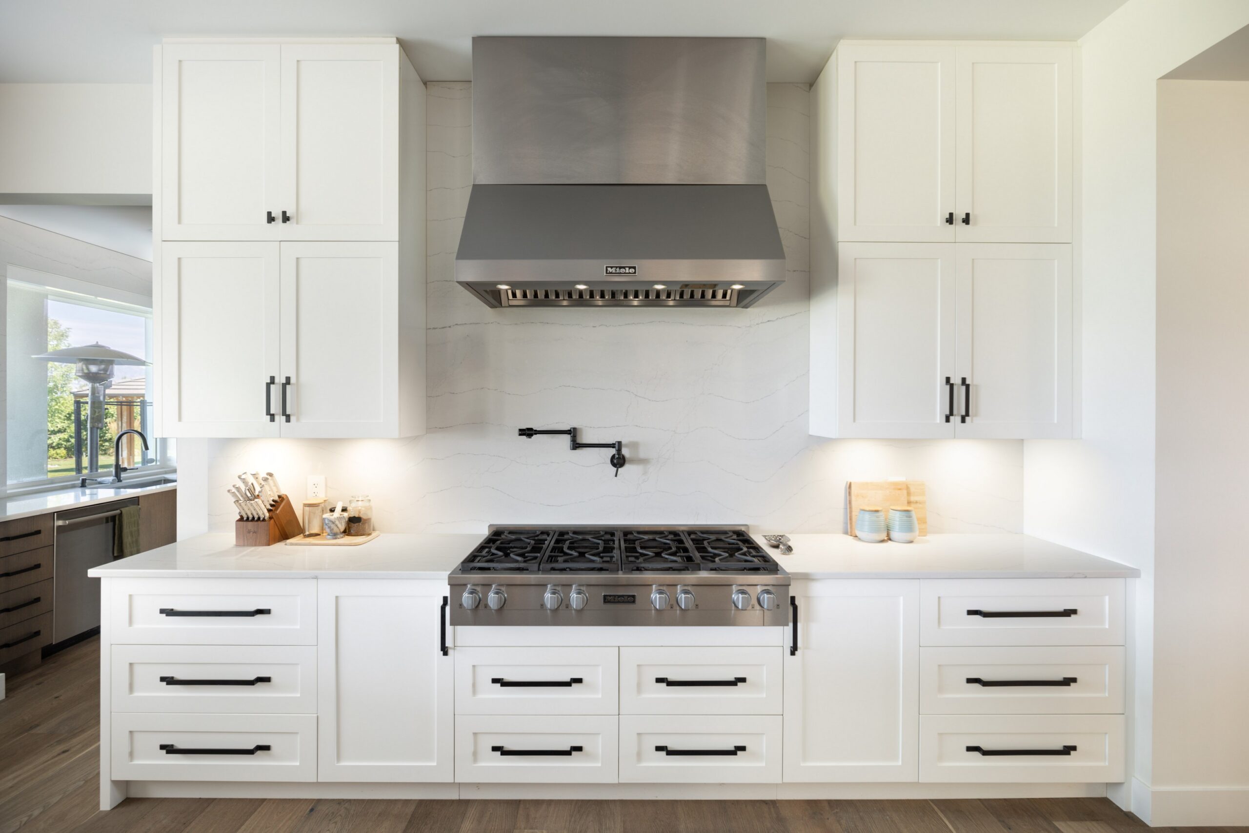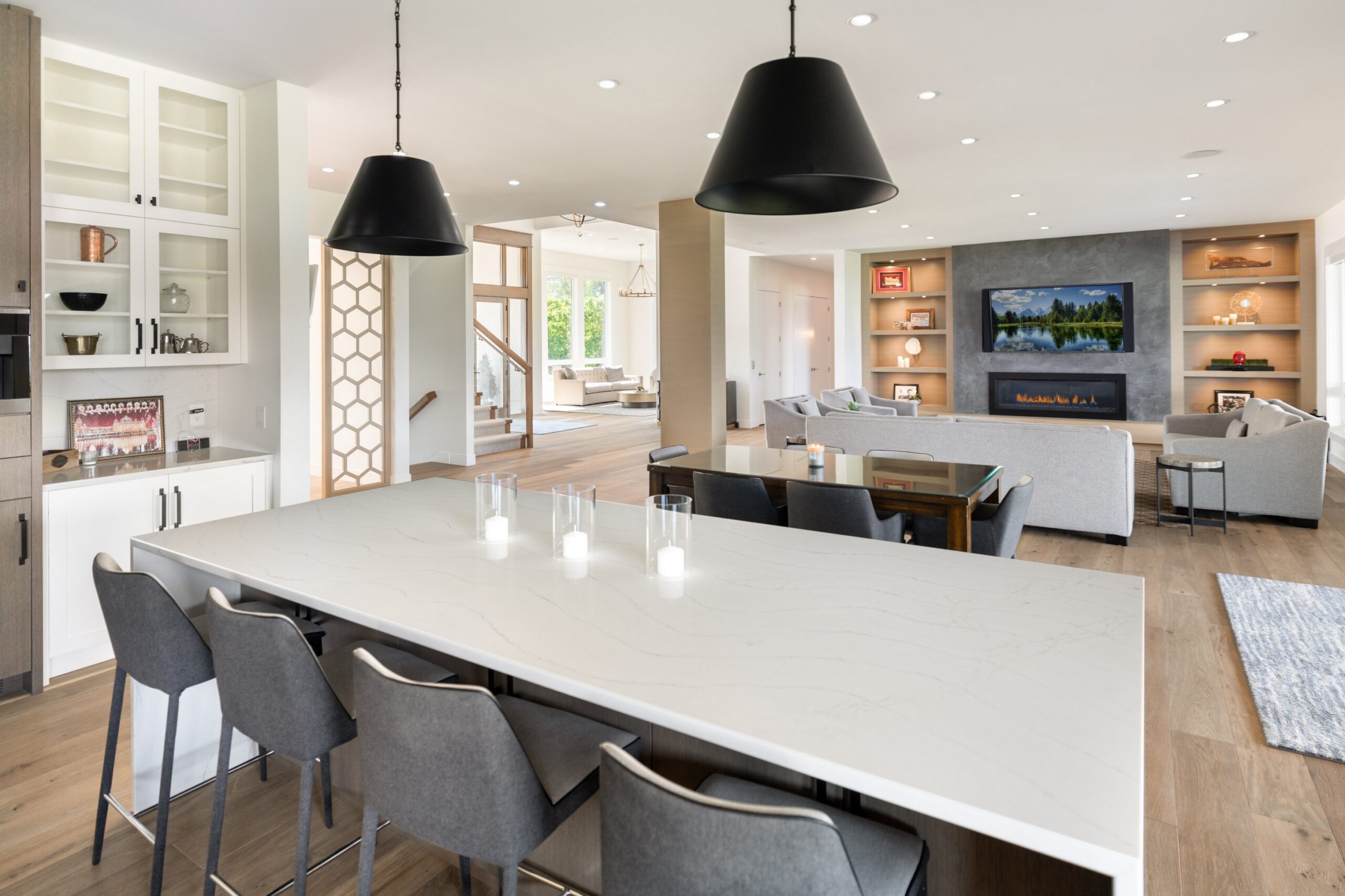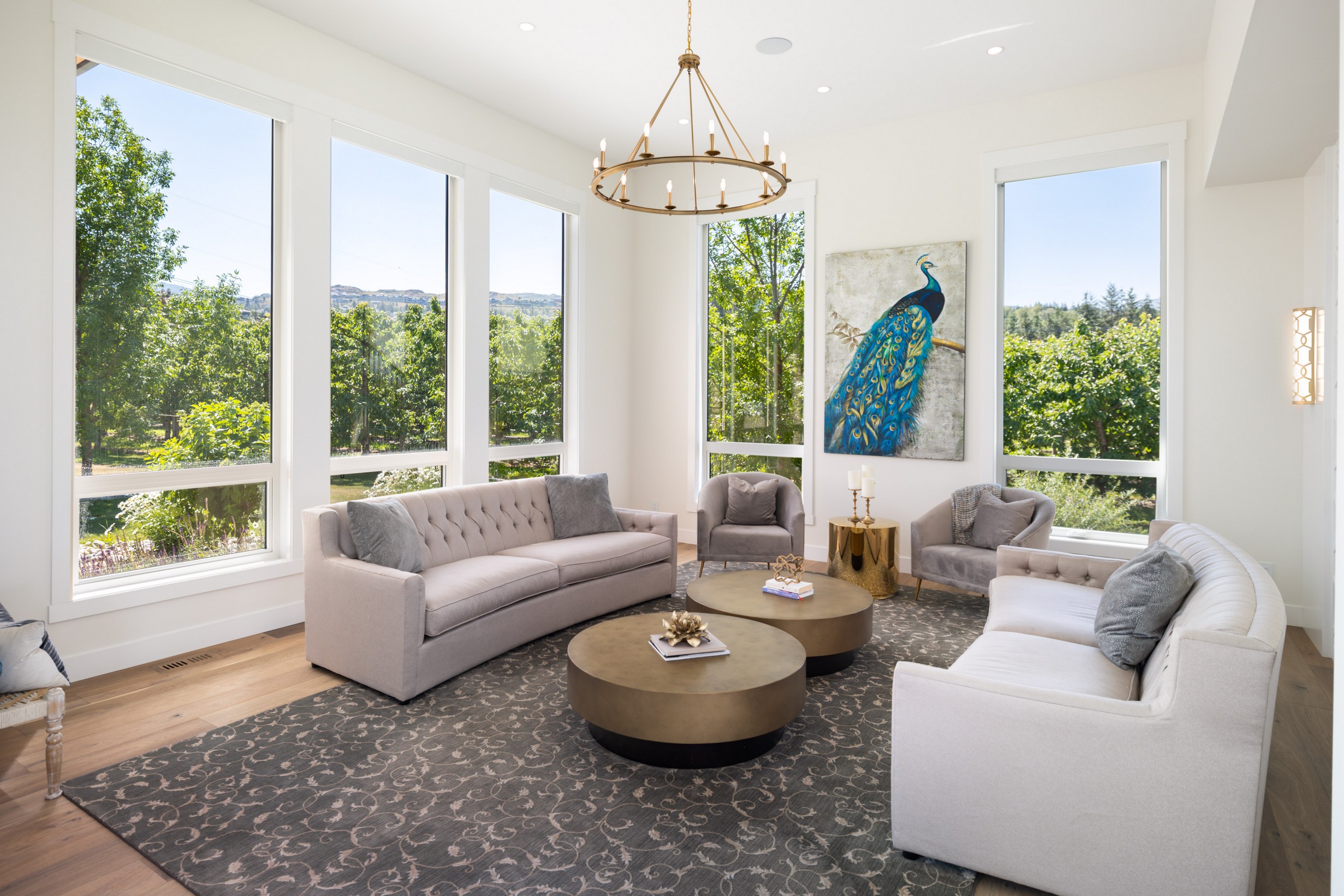 A grand foyer with an elegant chandelier welcomes you to the home. The main level boasts a large office, a living area with a gas fireplace, a formal living room, and a dining room with a coffered ceiling. The chef’s kitchen boasts a double island, 2 sinks, a massive fridge-freezer combo, an 8-burner gas range, and a bar fridge. Large butler’s pantry. Mudroom includes built-ins, and laundry facilities. Sliding doors lead to a huge, covered patio with a water feature, speakers, an 8-person hot tub and an expansive lawn area.