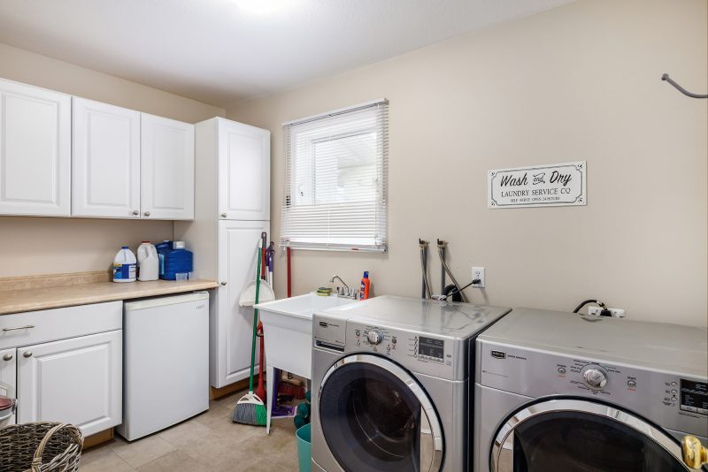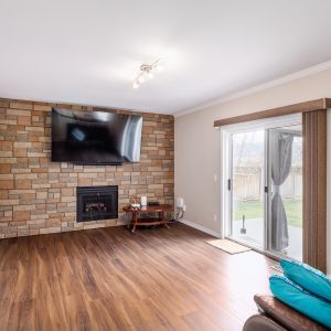 The kitchen provides ample cabinetry, tile backsplash and a bright breakfast nook overlooking the backyard, and connects to a cozy family room with laminate floors, electric fireplace and sliding doors to the patio and lawn. A practical laundry/mud room with built-in storage and sink links directly to the garage, alongside a convenient two-piece powder room.