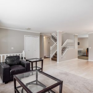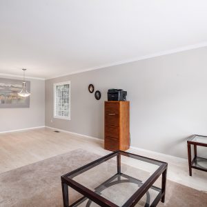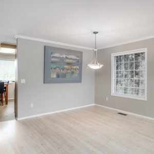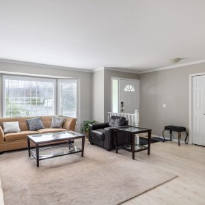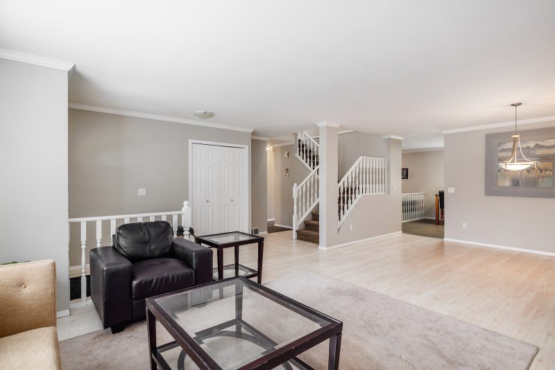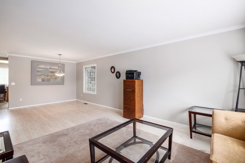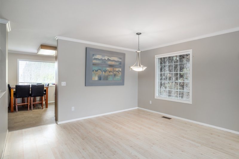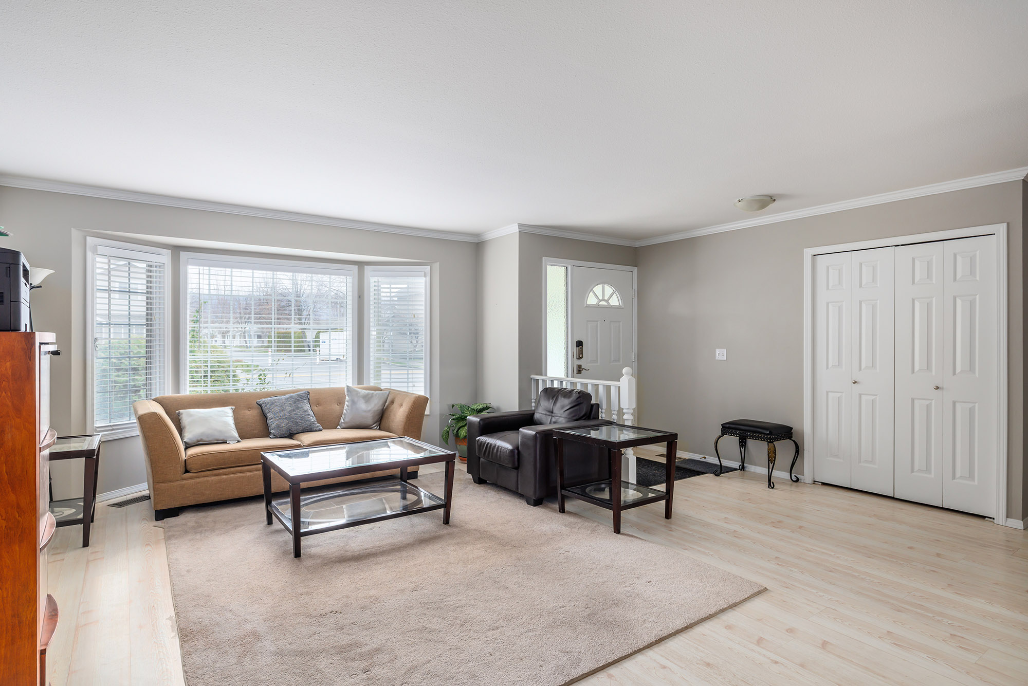 The main level features an open foyer with guest closet, spacious living room with laminate flooring and a large bay window, plus an adjoining dining area ideal for entertaining.