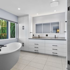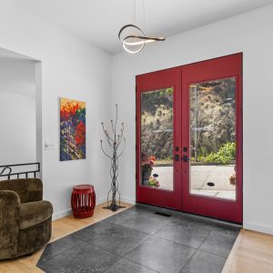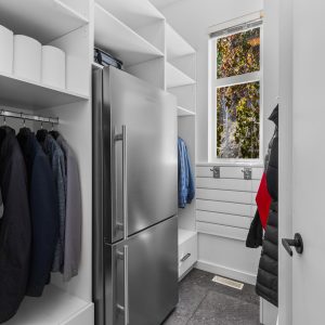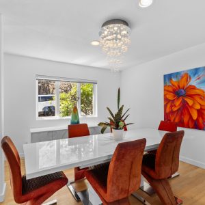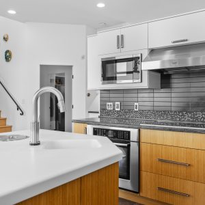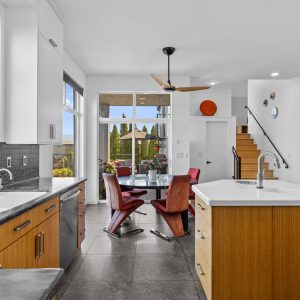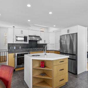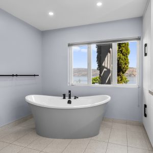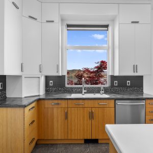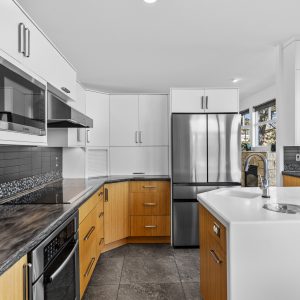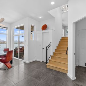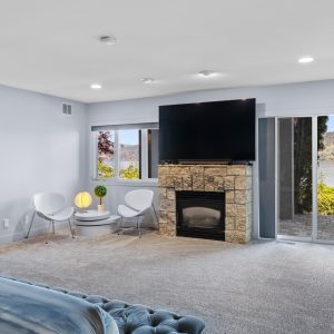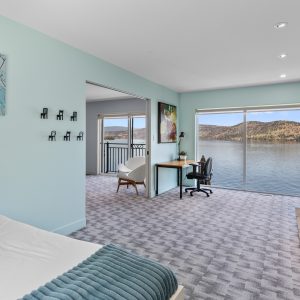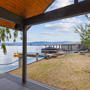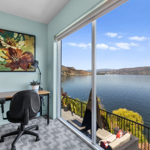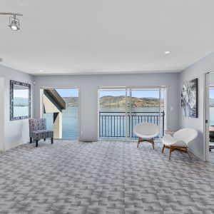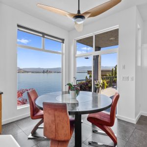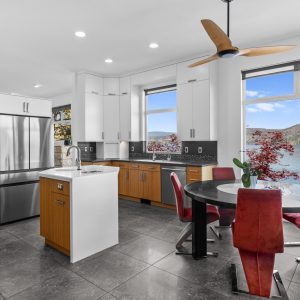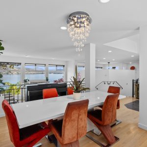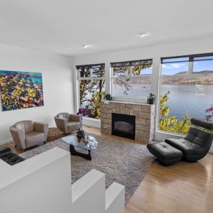 Inside, the home has been thoughtfully renovated with warm finishes and functional design. The kitchen features stainless steel appliances, a built-in oven and cooktop, two-tone custom cabinetry, and heated flooring. The open-concept layout connects the kitchen, dining, and living areas, all oriented to take in the lake and city views through large windows. Each waterfront property in Sailview Bay includes its own private dock, accessed by stairs or a personal funicular. The community is known for its privacy, natural surroundings, and convenient location—offering a quiet retreat that remains close to the amenities of Kelowna and West Kelowna.