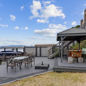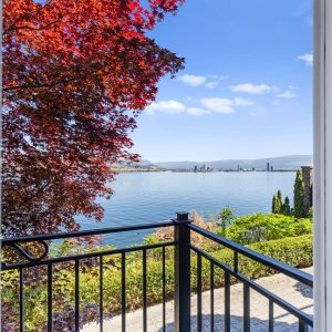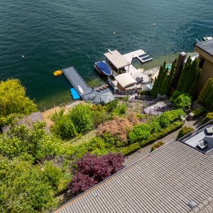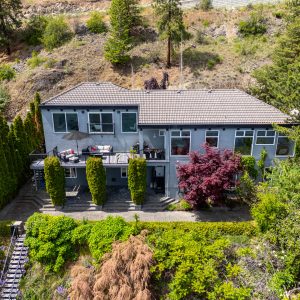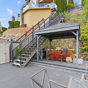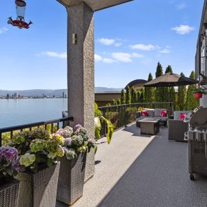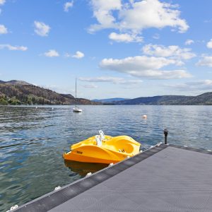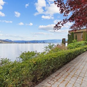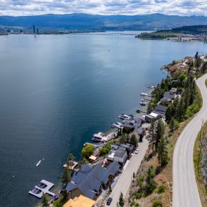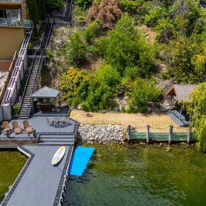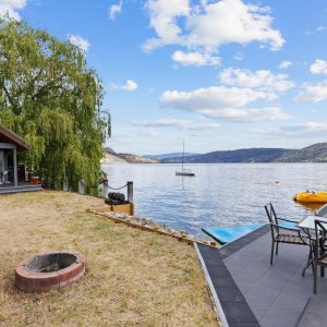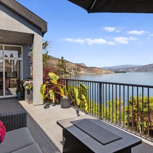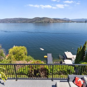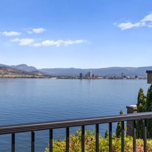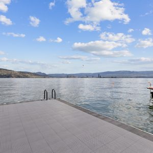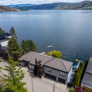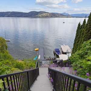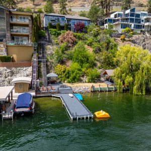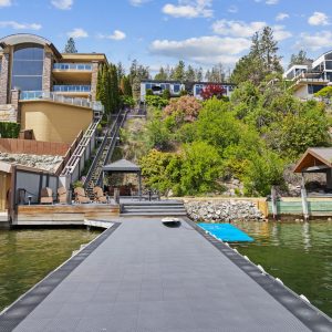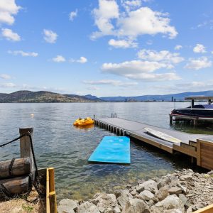 Situated just minutes from downtown Kelowna, this updated walk-out lakefront home is located in Sailview Bay, a quiet, gated community along Westside Road. Set on the cliffside with over 100 feet of private waterfront, the property captures panoramic views of Okanagan Lake and the downtown skyline, offering a peaceful setting by day and a backdrop of city lights at night. Designed to accommodate both everyday living and hosting guests, this five-bedroom home is well suited for families and visitors coming to enjoy the Okanagan lifestyle. The dock has been resurfaced with Sport Court tiles and offers direct access to deep, clear water—ideal for swimming, paddleboarding, or diving. Just steps from the shoreline, a generous open deck, covered outdoor bar, and vaulted-ceiling cabana are perfect to relax by the water.
