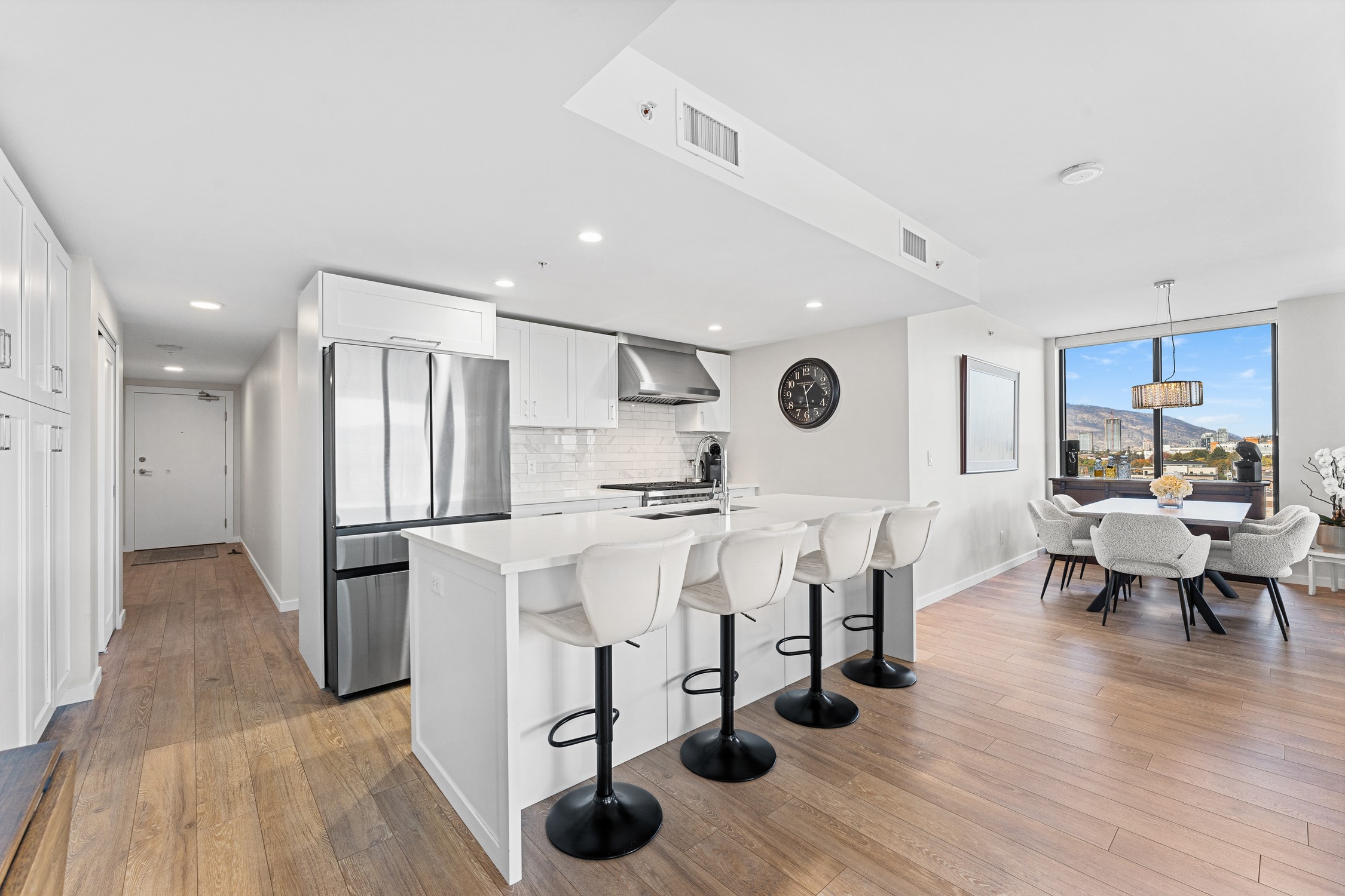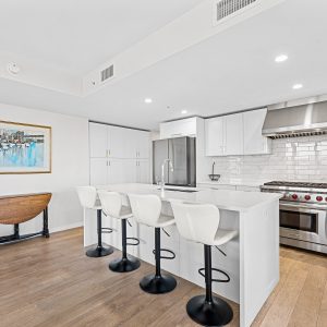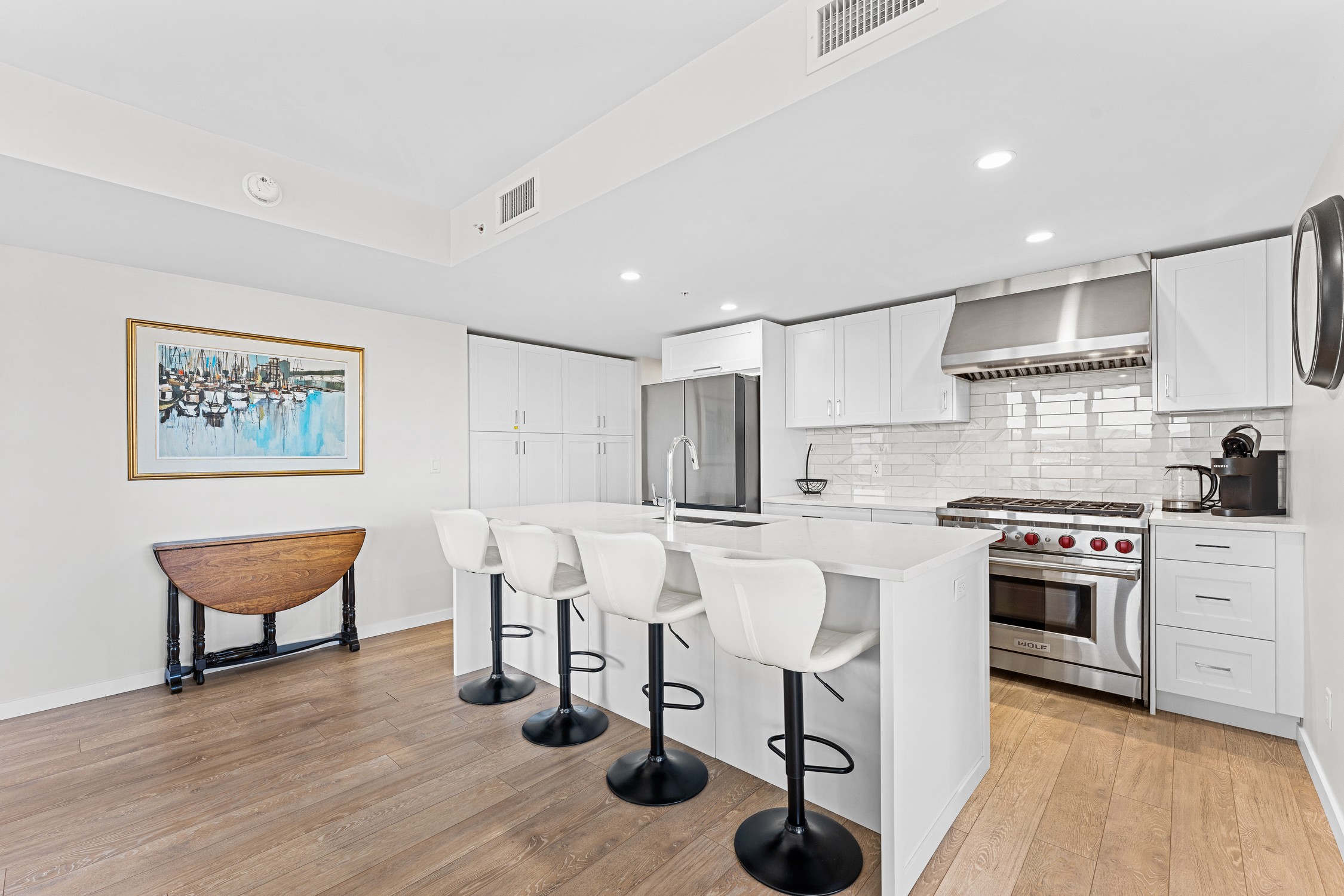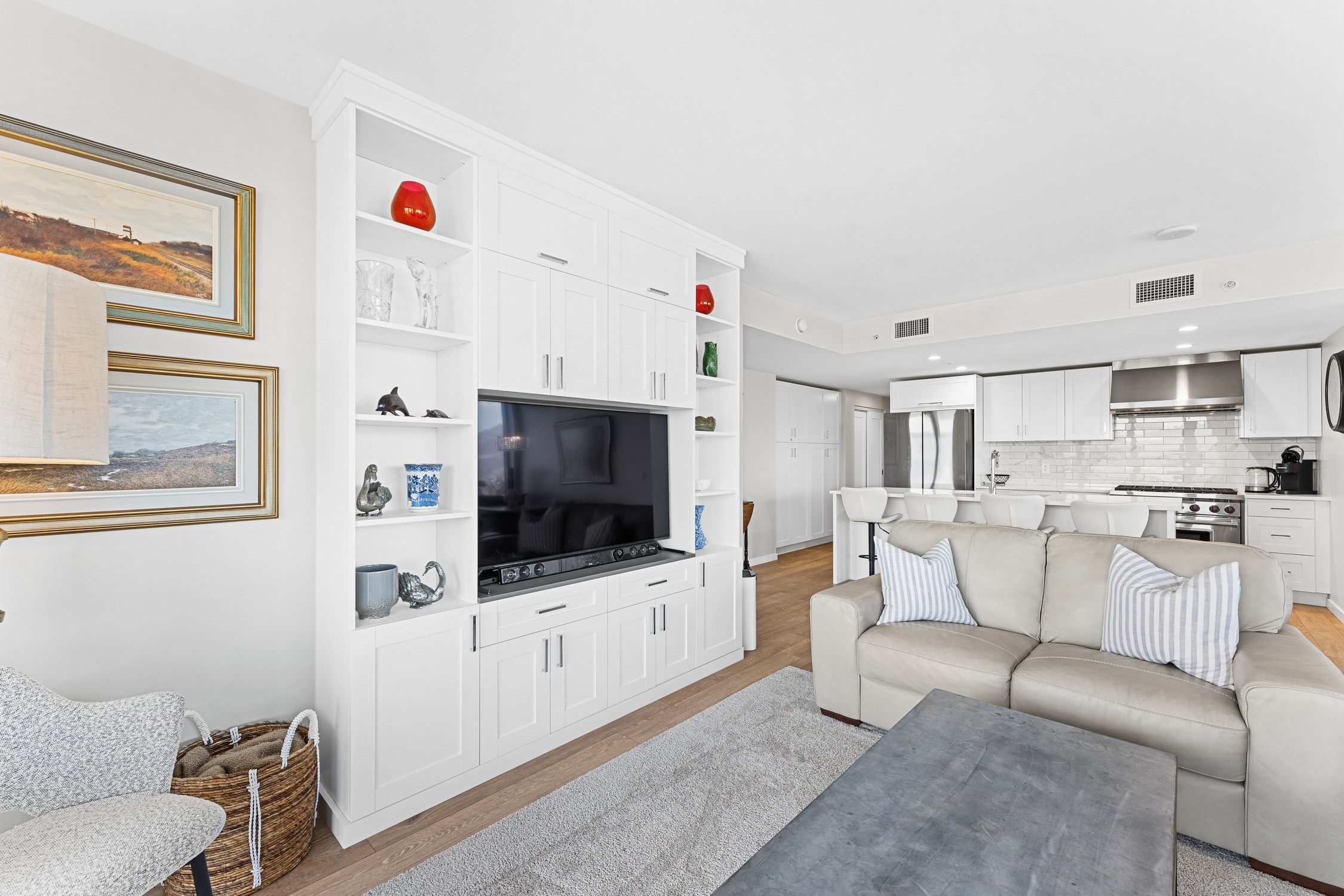 The designer kitchen is a chef’s dream with a Wolf 6-burner oven, stainless steel appliances including a newer full sized refrigerator, sleek white cabinetry, bright quartz countertops, and a newer washer/dryer. The inviting dining and living areas feature a custom built-in entertainment unit.
