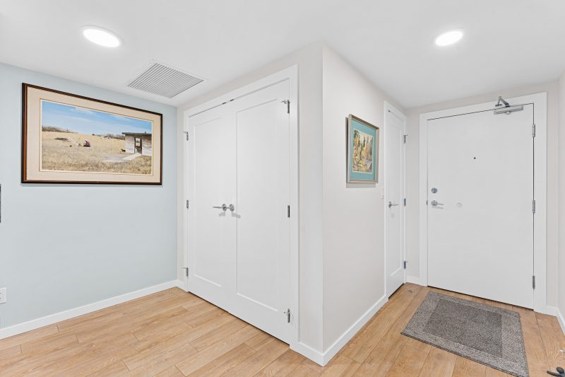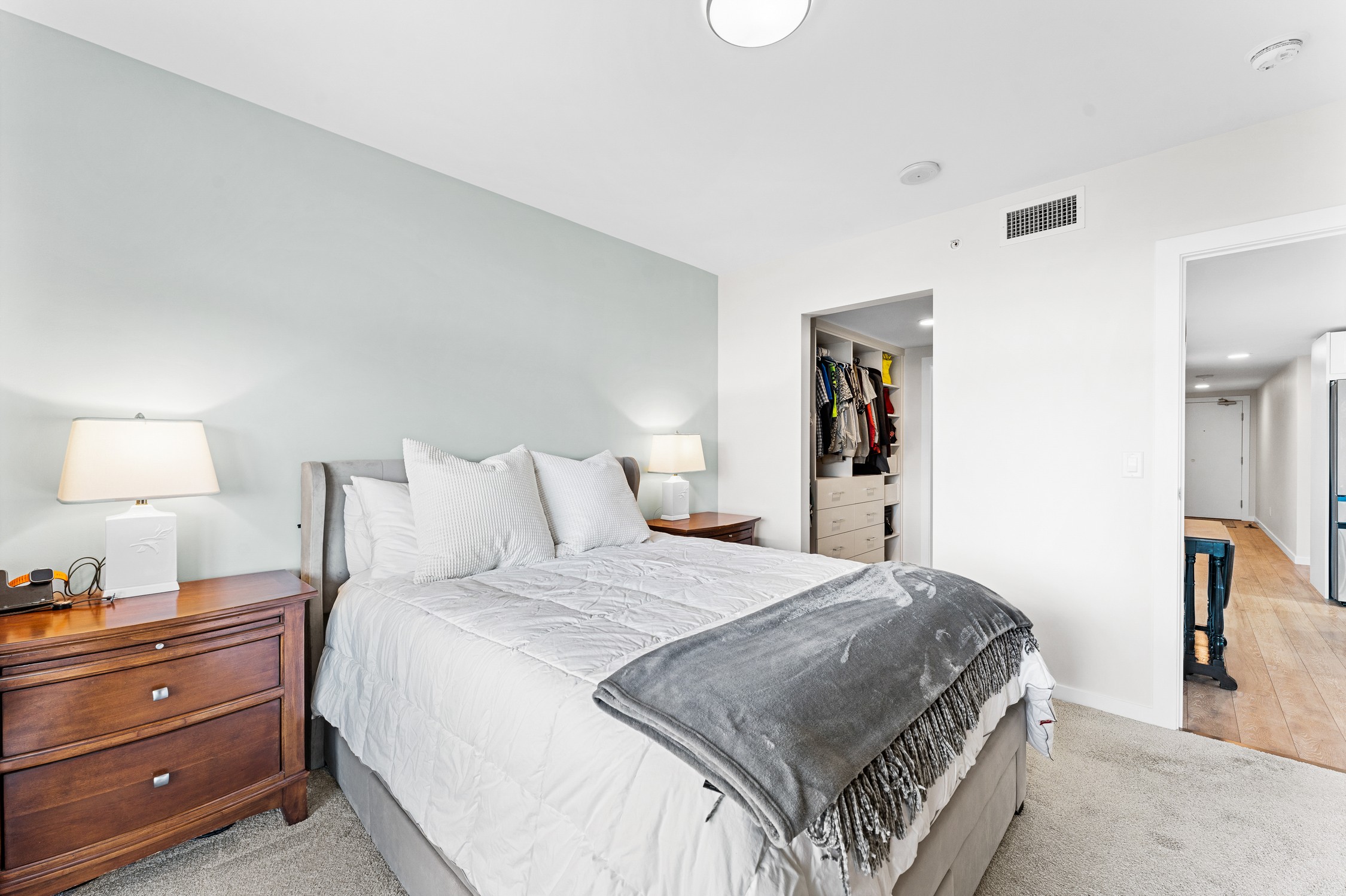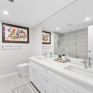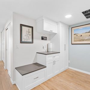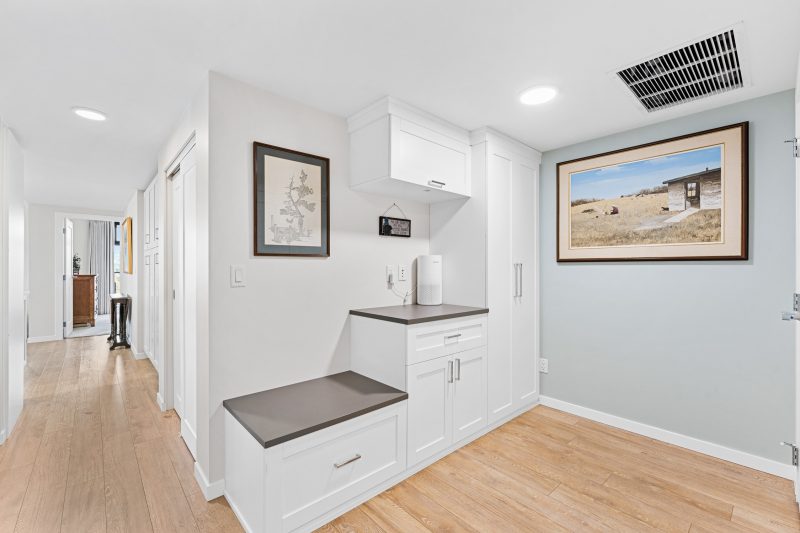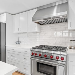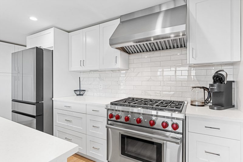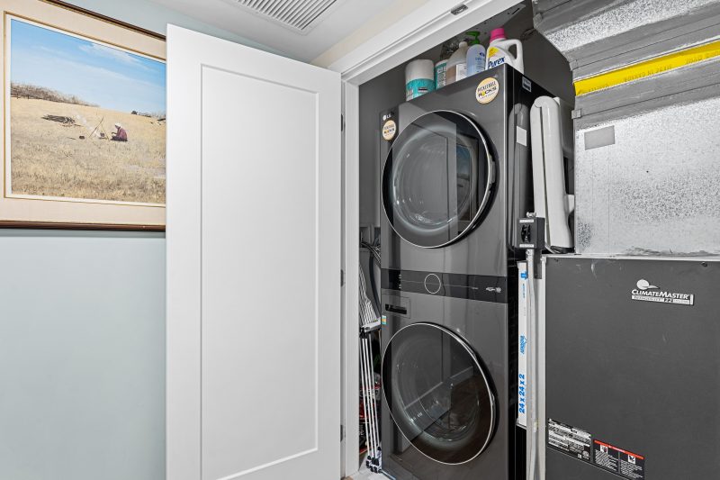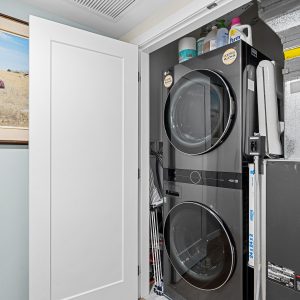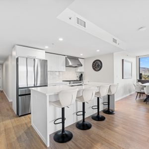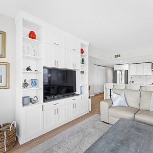 The designer kitchen is a chef’s dream with a Wolf 6-burner oven, stainless steel appliances including a newer full sized refrigerator, sleek white cabinetry, bright quartz countertops, and a newer washer/dryer. The inviting dining and living areas feature a custom built-in entertainment unit.