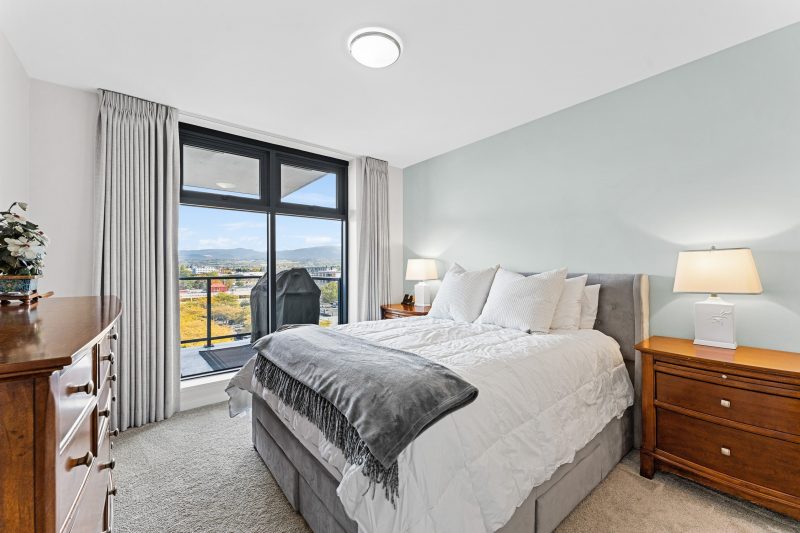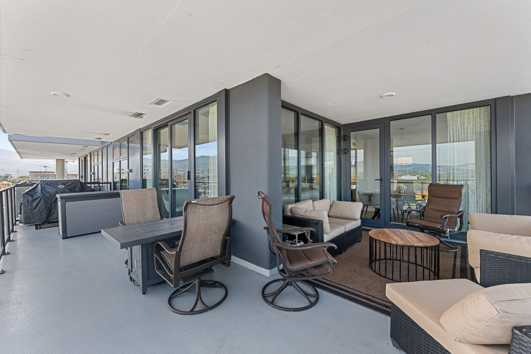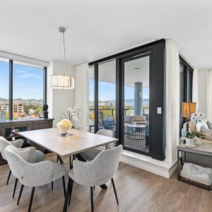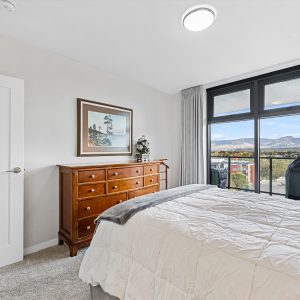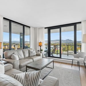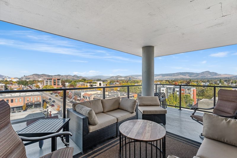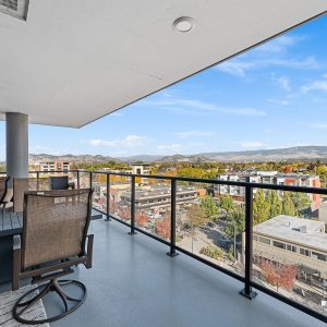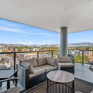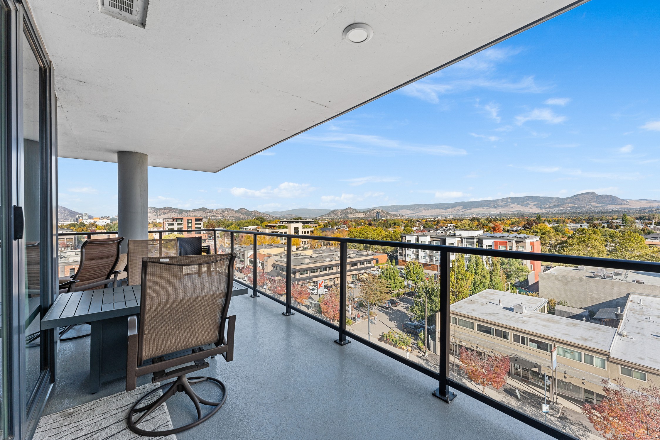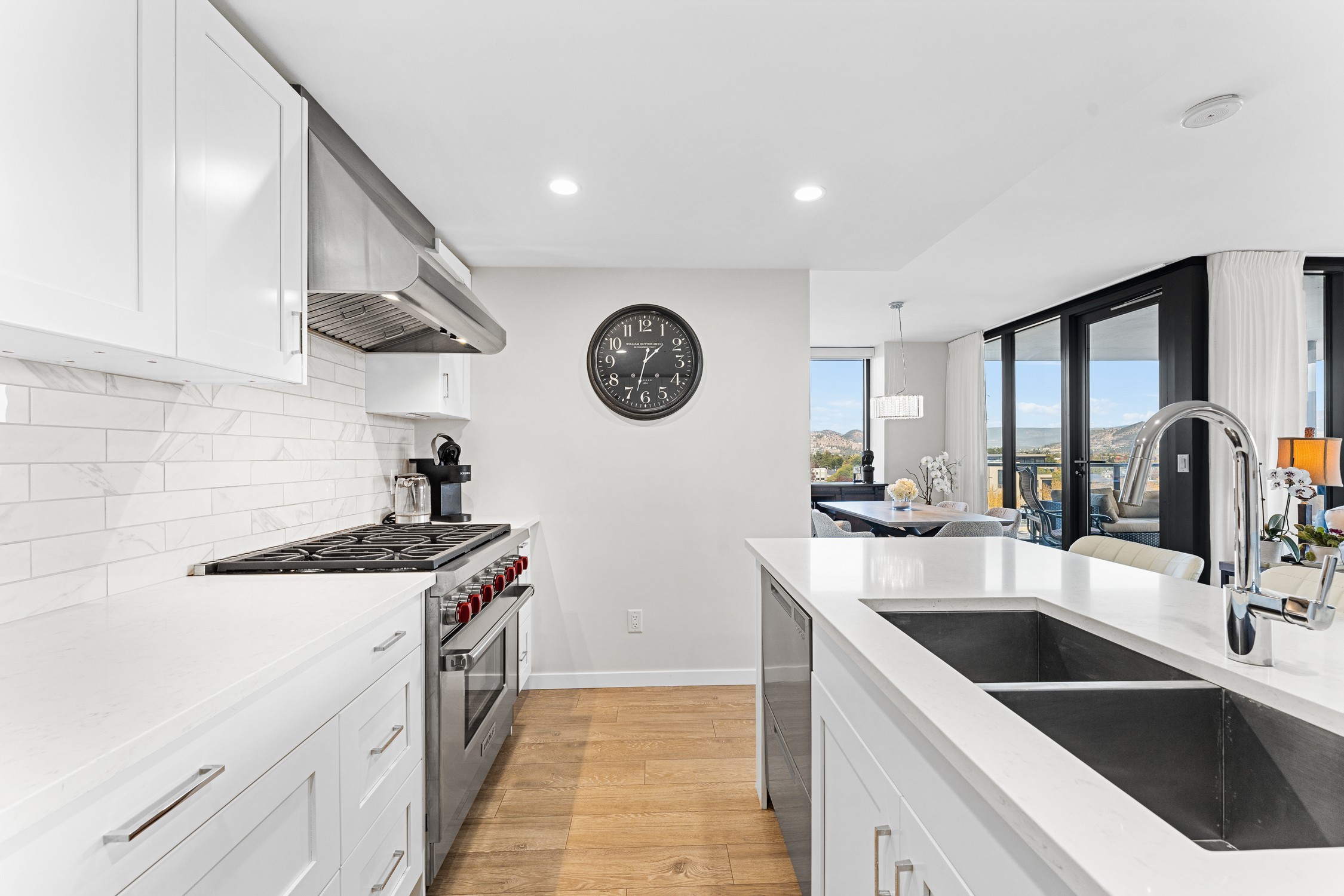 Step onto the spacious east-facing corner deck, perfectly protected from the elements to enjoy morning sun and cool afternoons, while taking in city, mountain, and partial lake views.