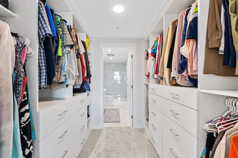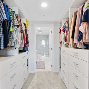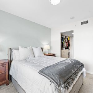 The primary suite offers blackout drapery, California walk-through closet, and a luxurious 4-piece ensuite with glass shower. Two additional bedrooms share a 3-piece bath, one with a built-in Murphy bed.