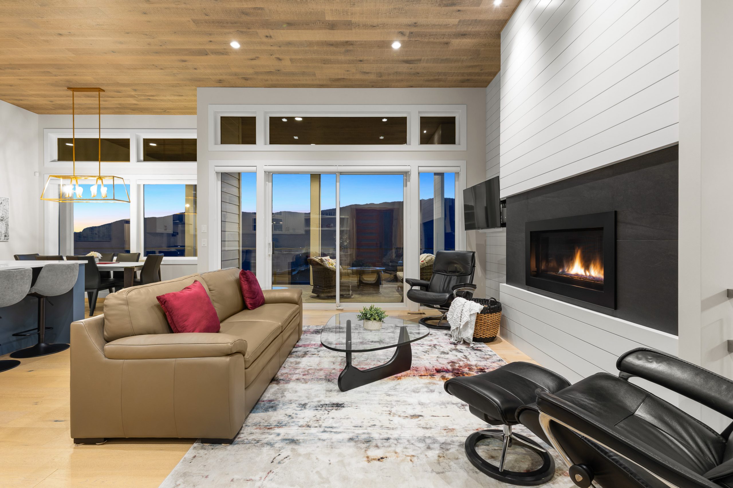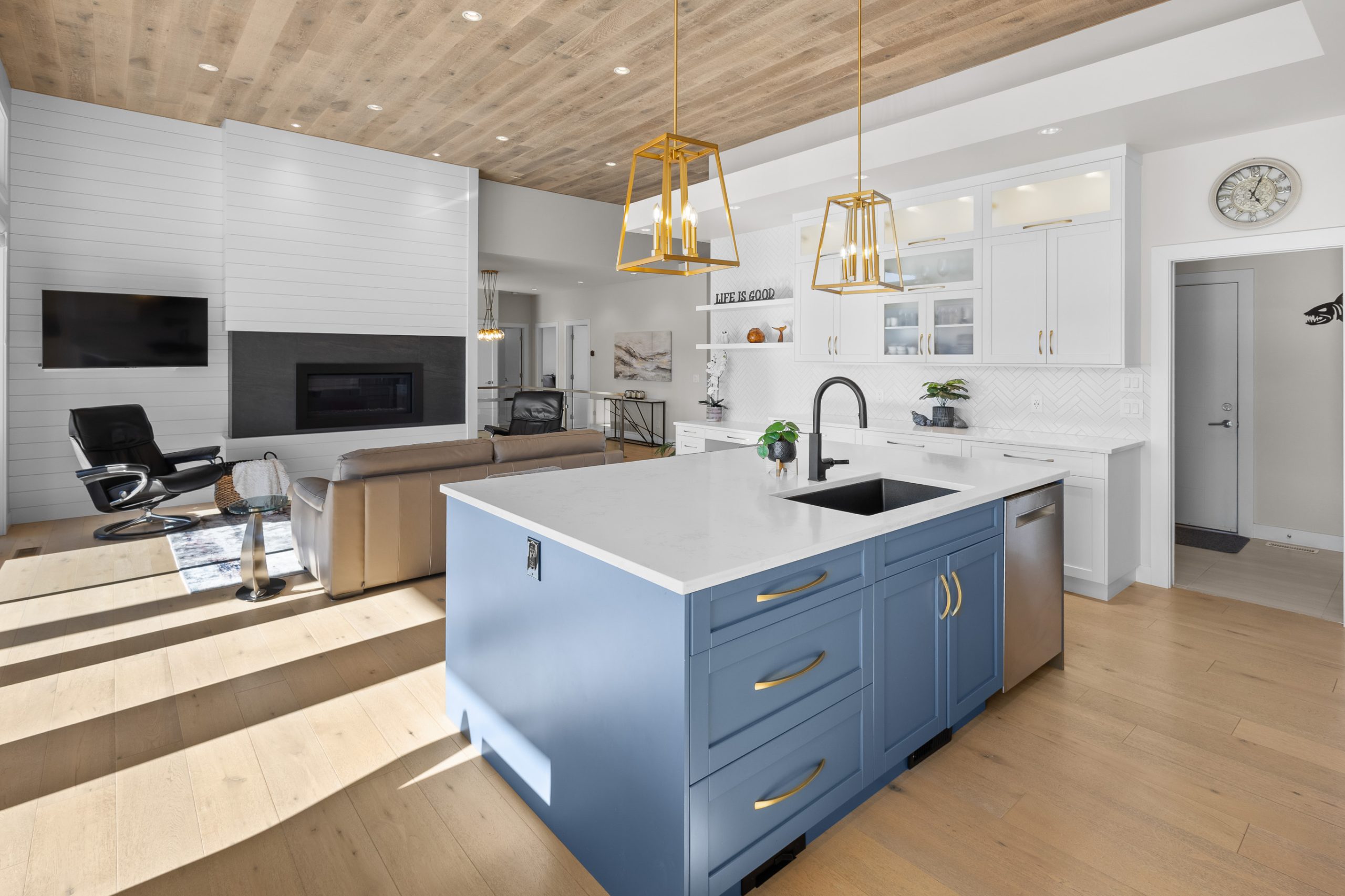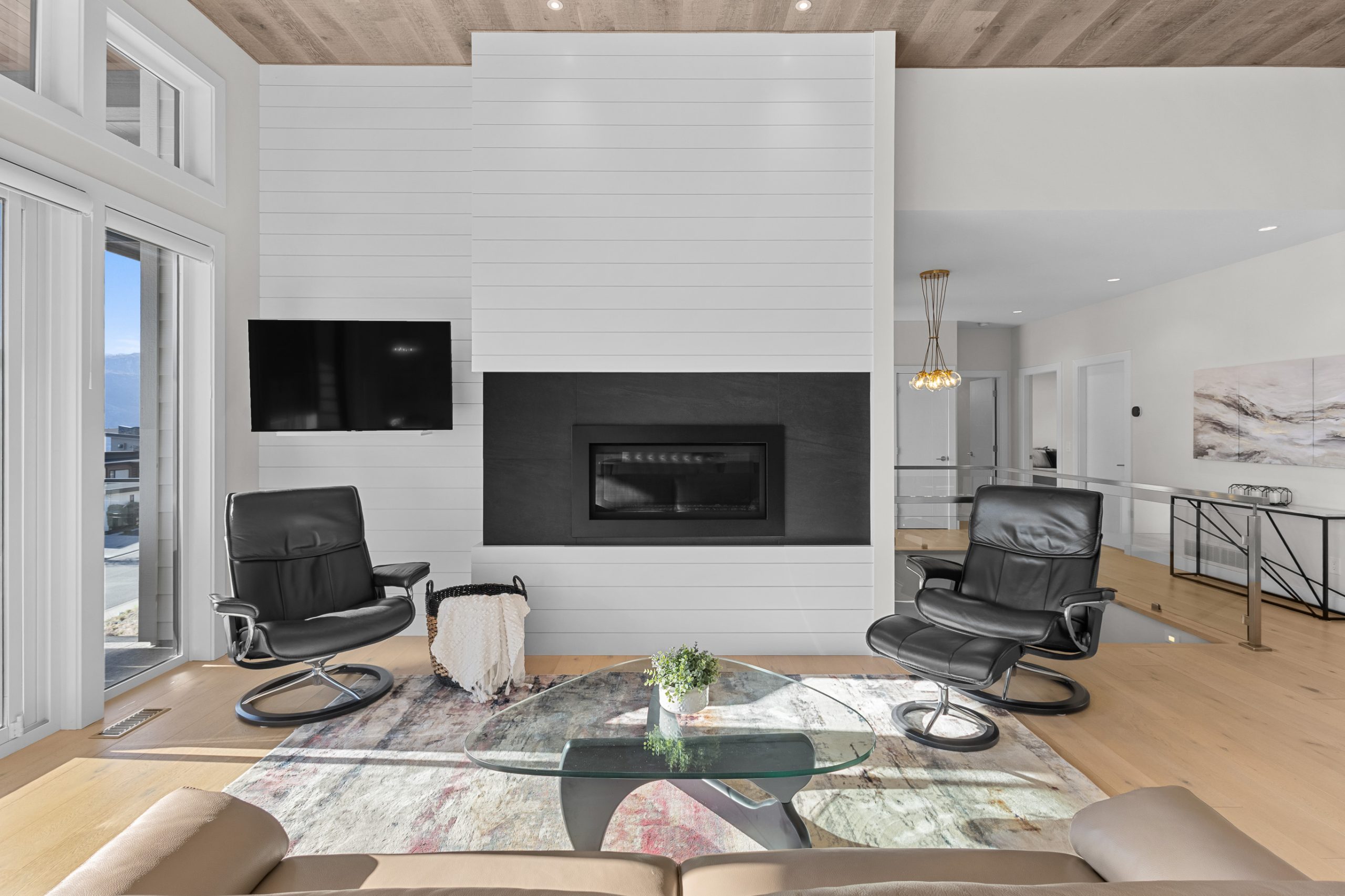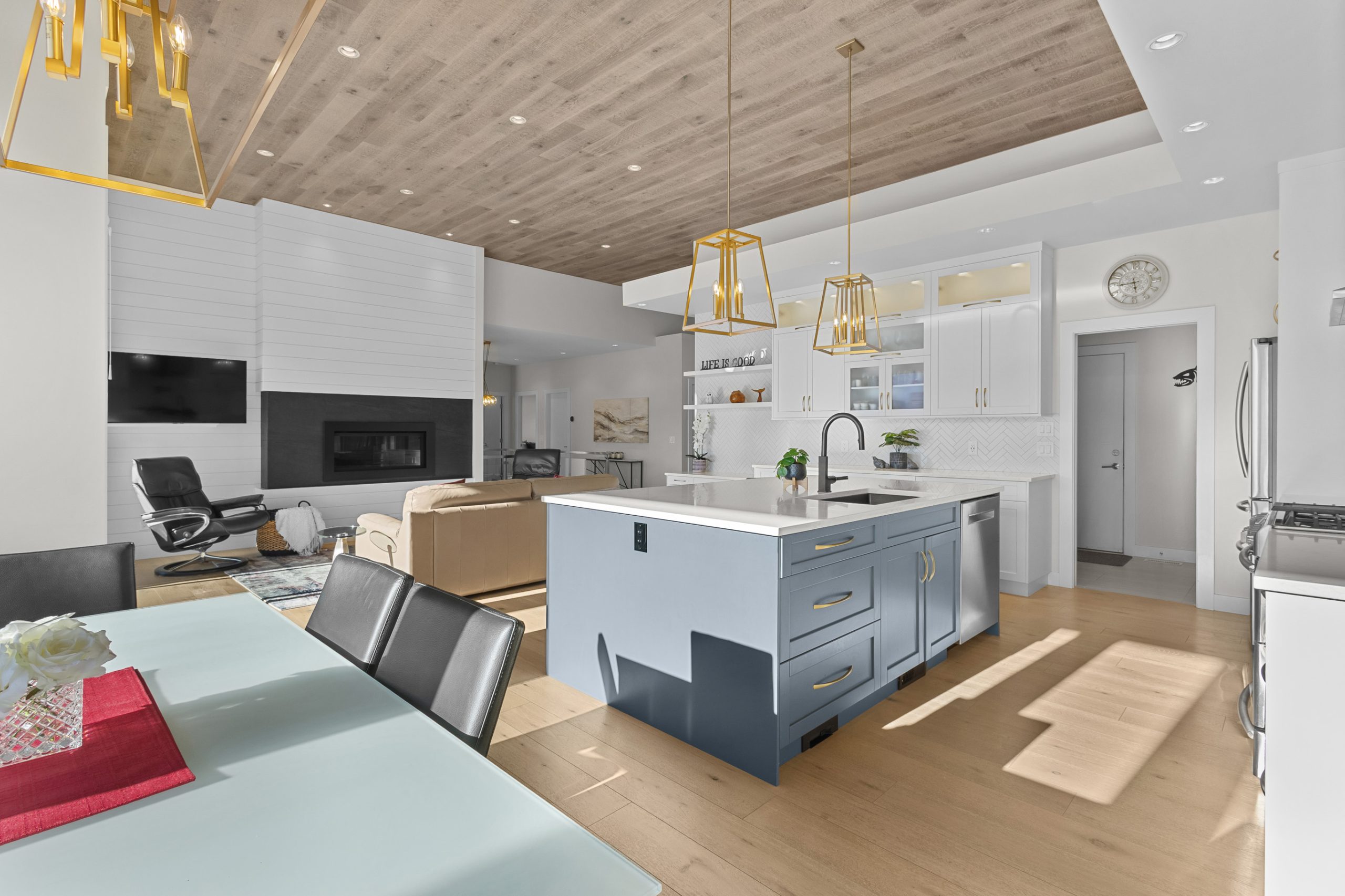 Inside, expansive windows frame stunning lake views from the open concept kitchen, dining, and living areas, creating seamless flow for everyday living and entertaining. The bright kitchen offers generous counter space, abundant cabinetry, and direct access to the view balcony. The living room is anchored by a beautiful fireplace.