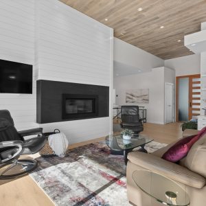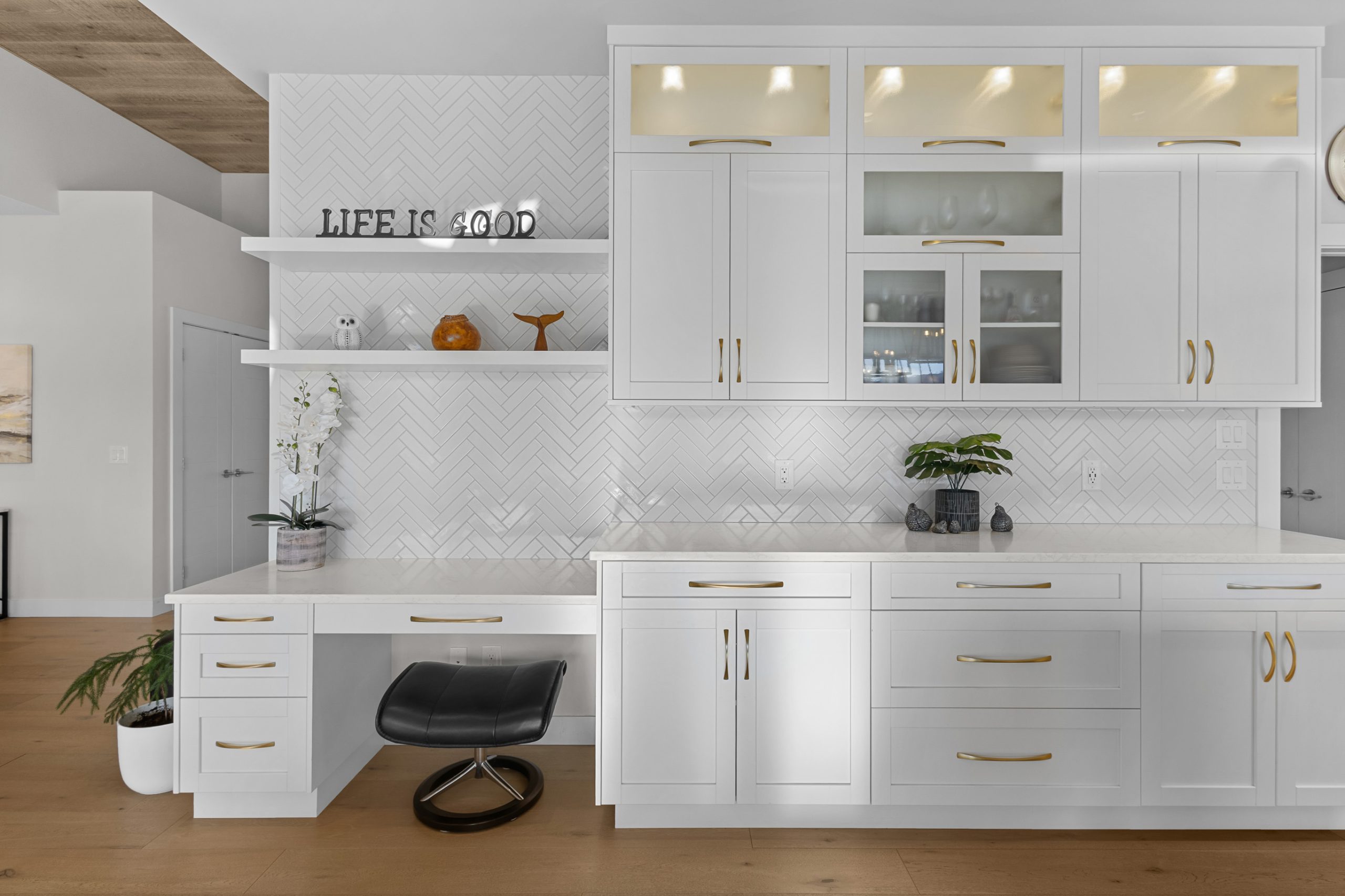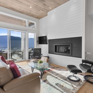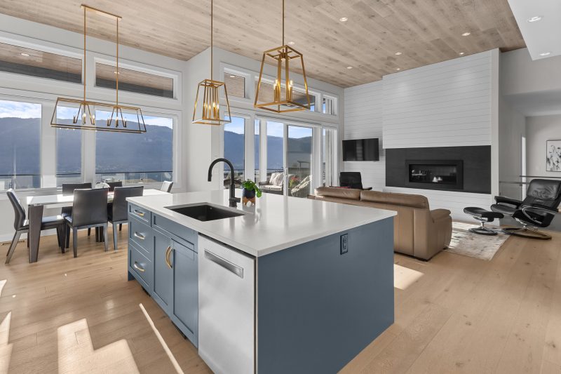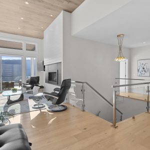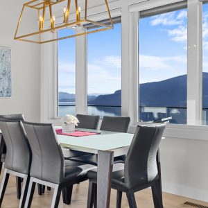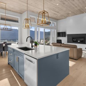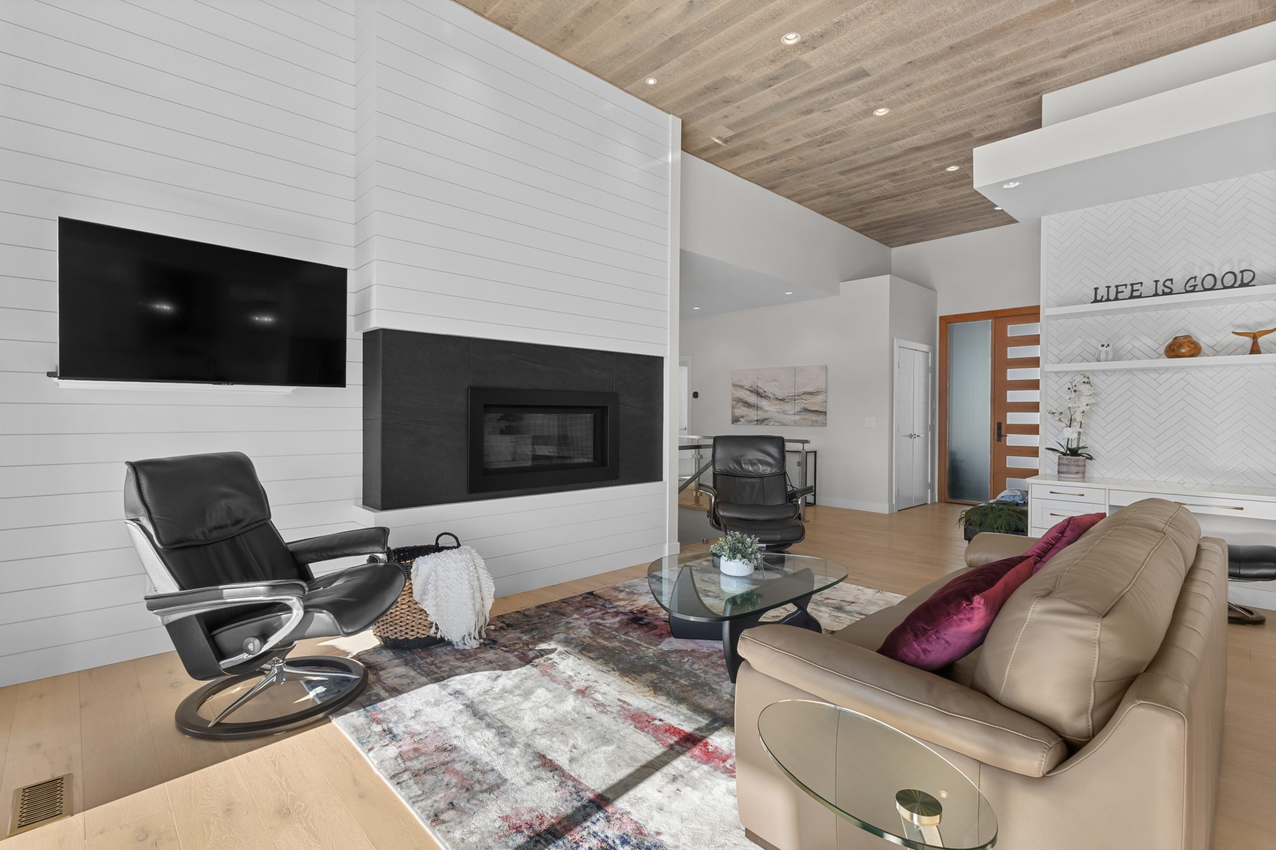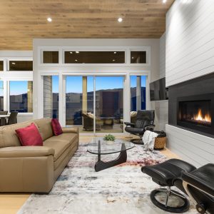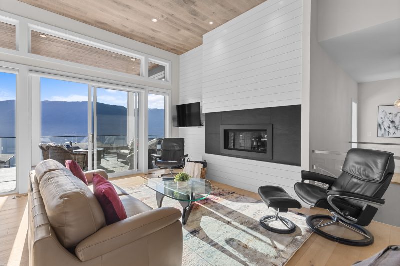 Inside, expansive windows frame stunning lake views from the open concept kitchen, dining, and living areas, creating seamless flow for everyday living and entertaining. The bright kitchen offers generous counter space, abundant cabinetry, and direct access to the view balcony. The living room is anchored by a beautiful fireplace.