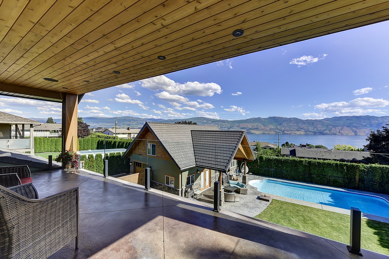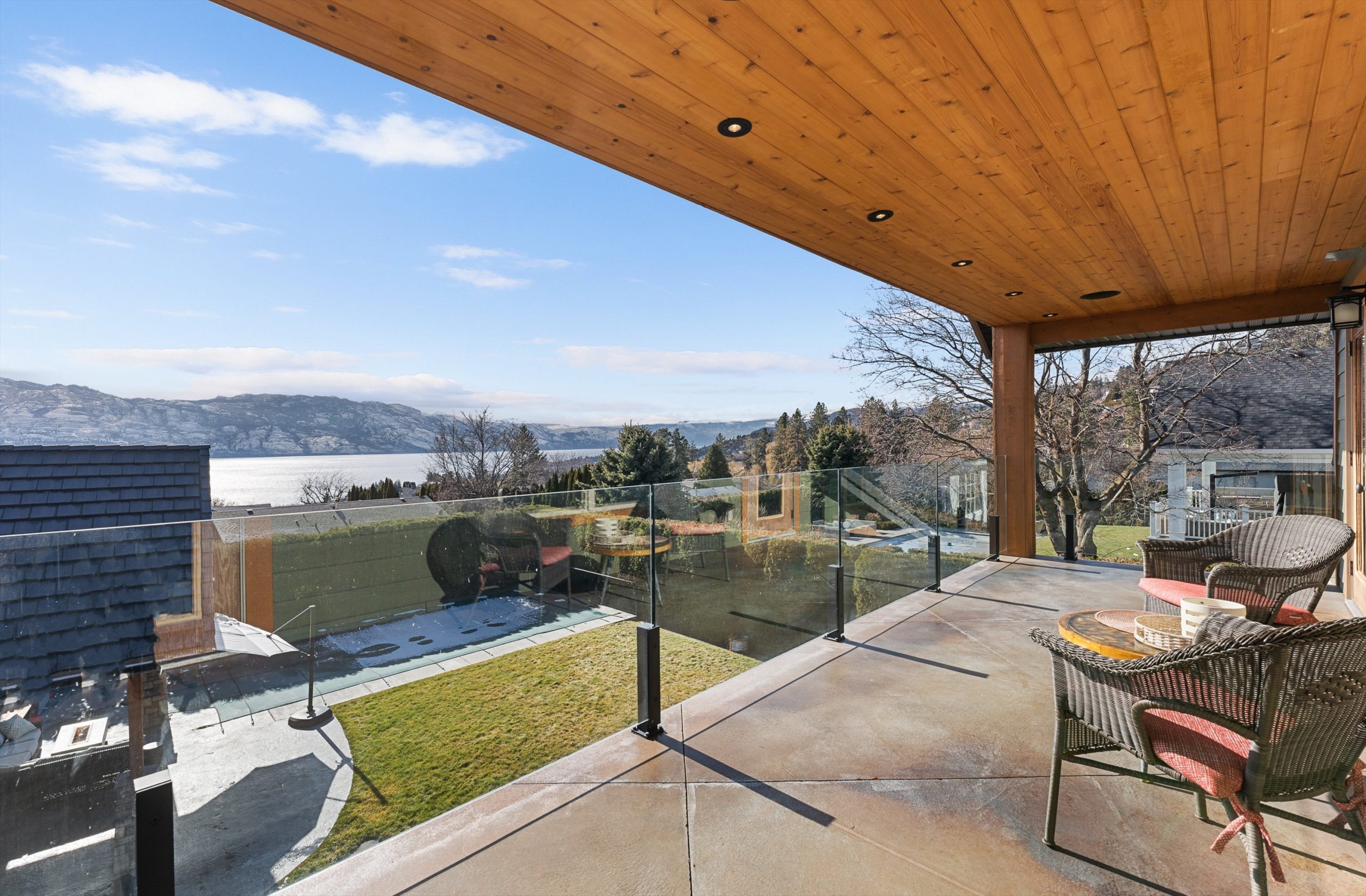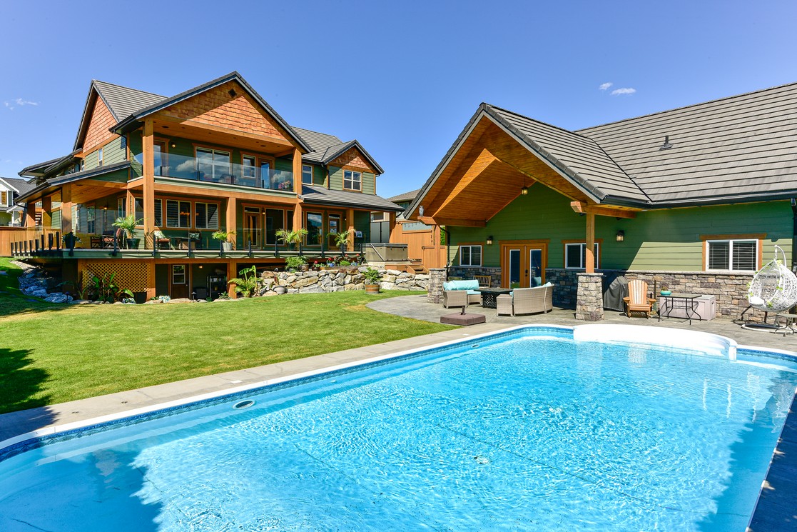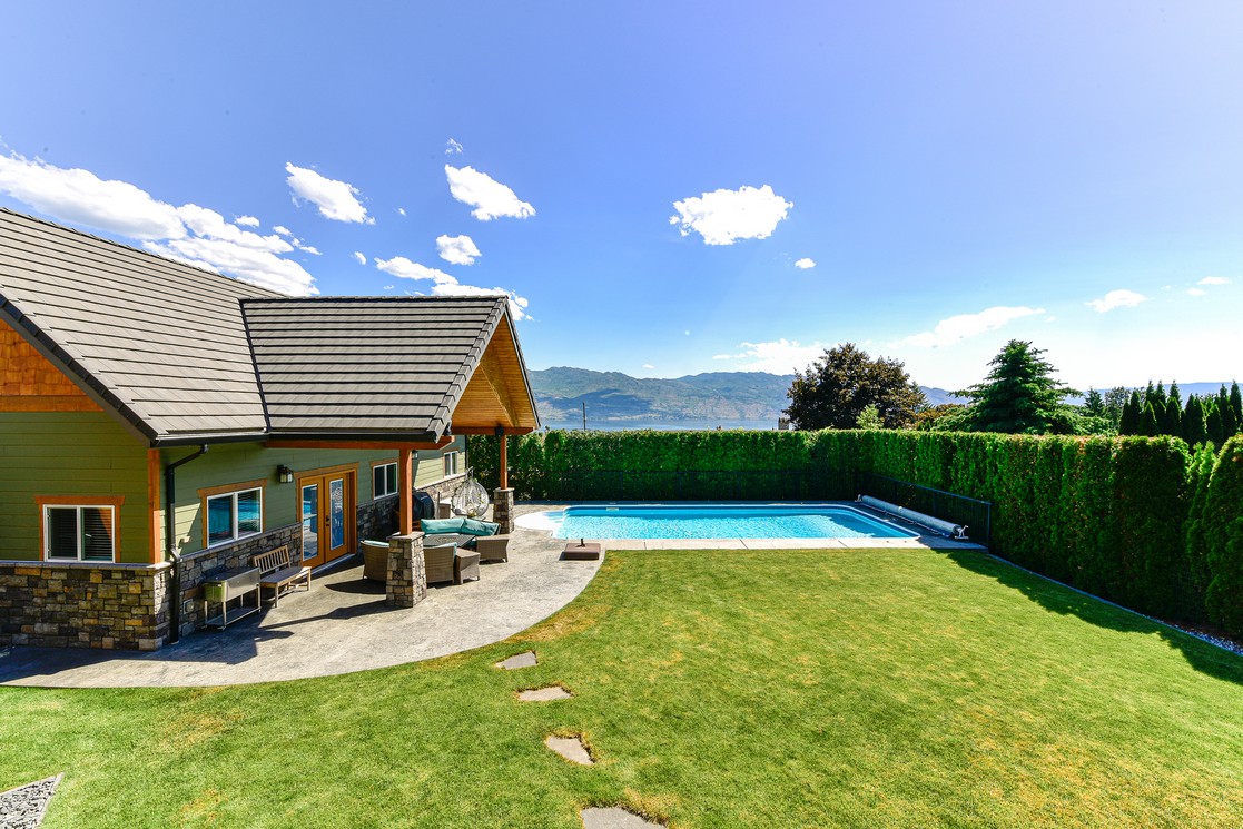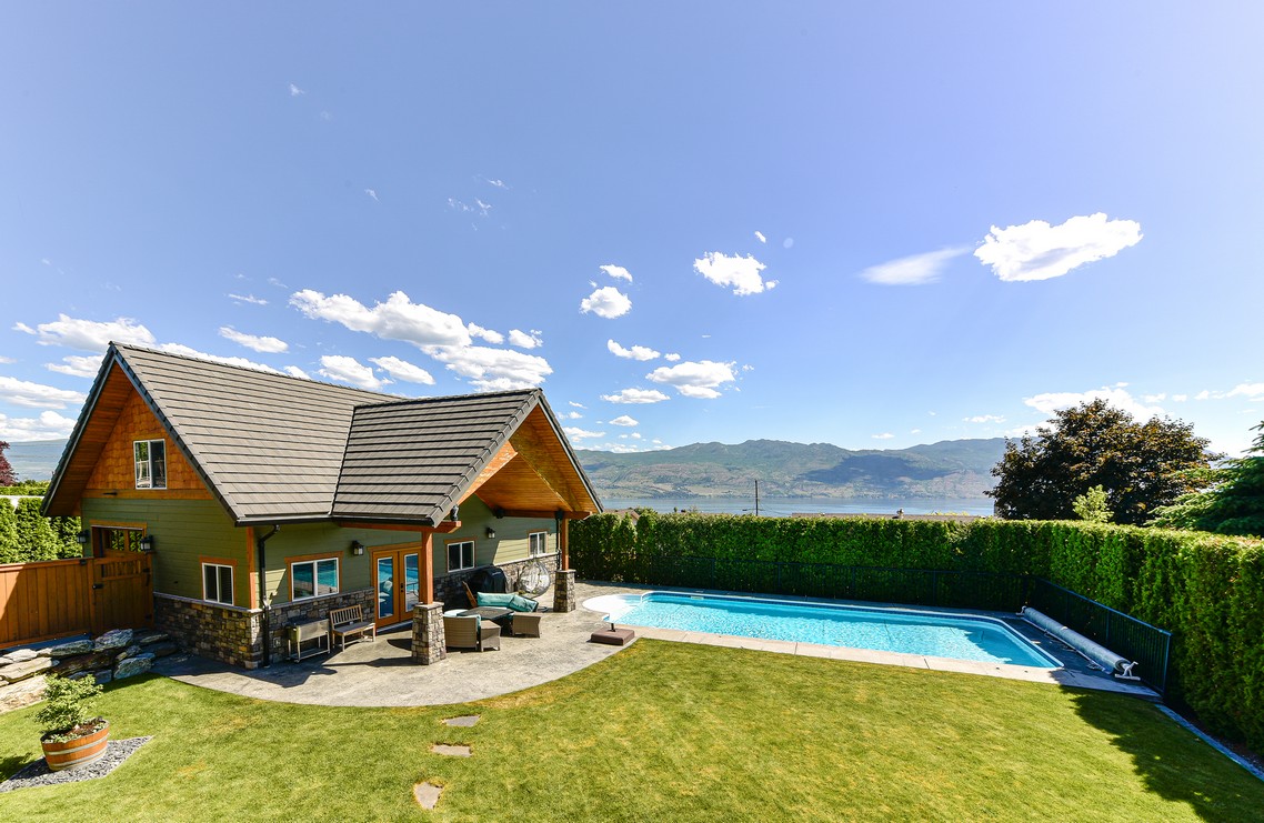 Three additional bedrooms complete the upper level. A legal suite above the garage offers income or guest flexibility, while the detached pool house, with bedroom, bath, kitchenette and separate garage/workshop, adds rare multigenerational potential. With RV parking, wine cellar, climate control systems and walking access to Boucherie Road’s trail, wineries and beaches, this is refined Okanagan living.