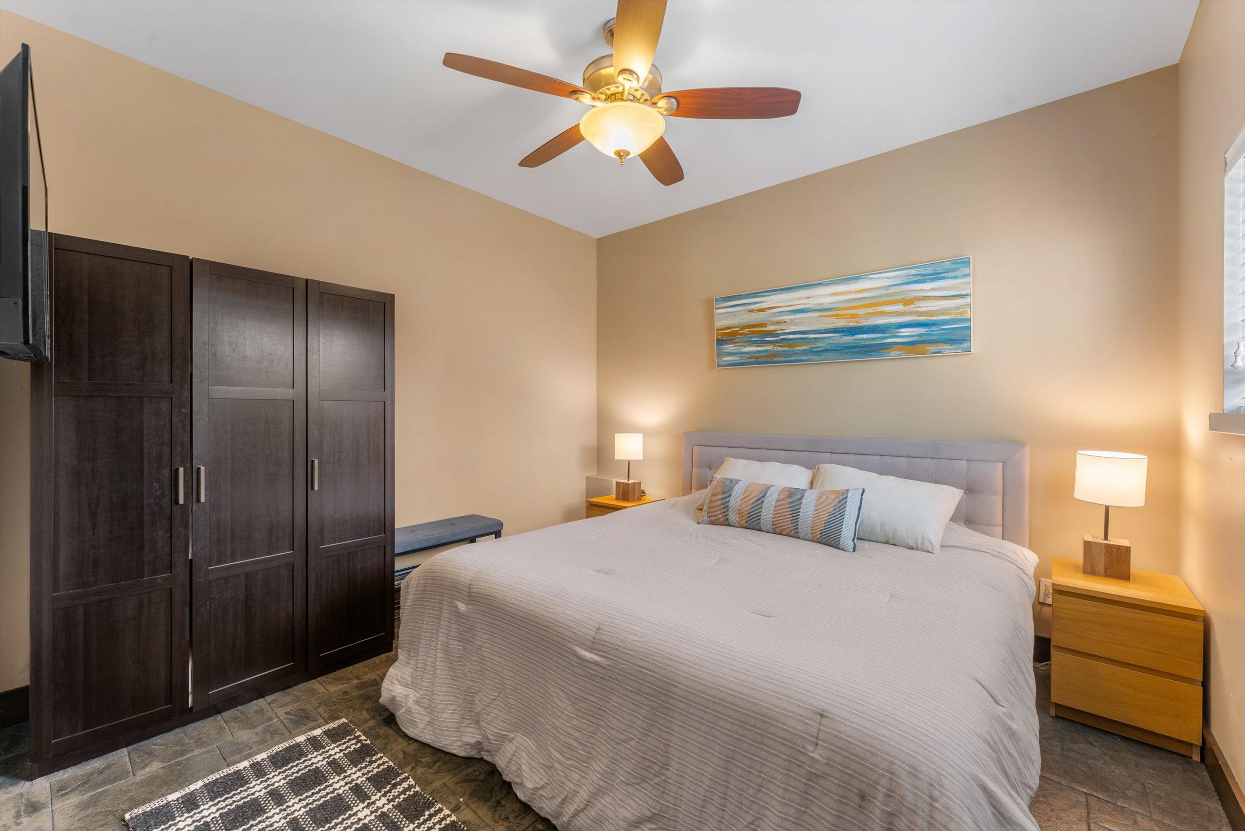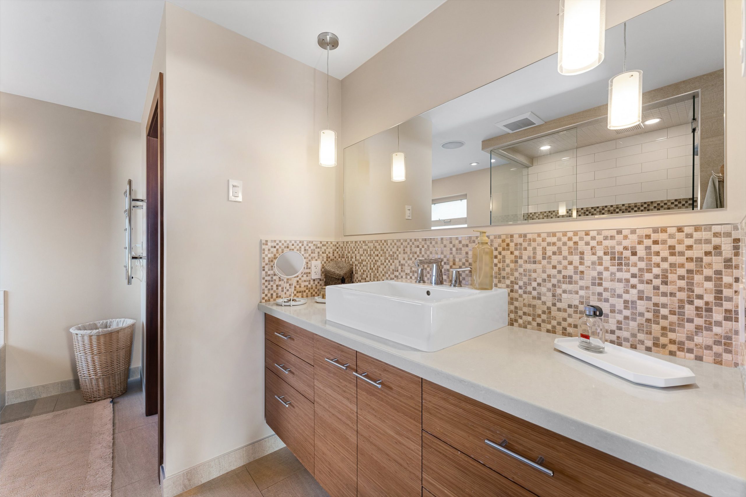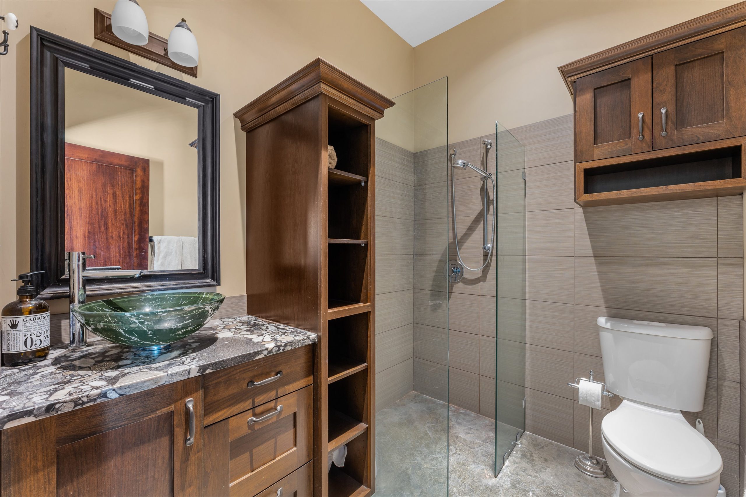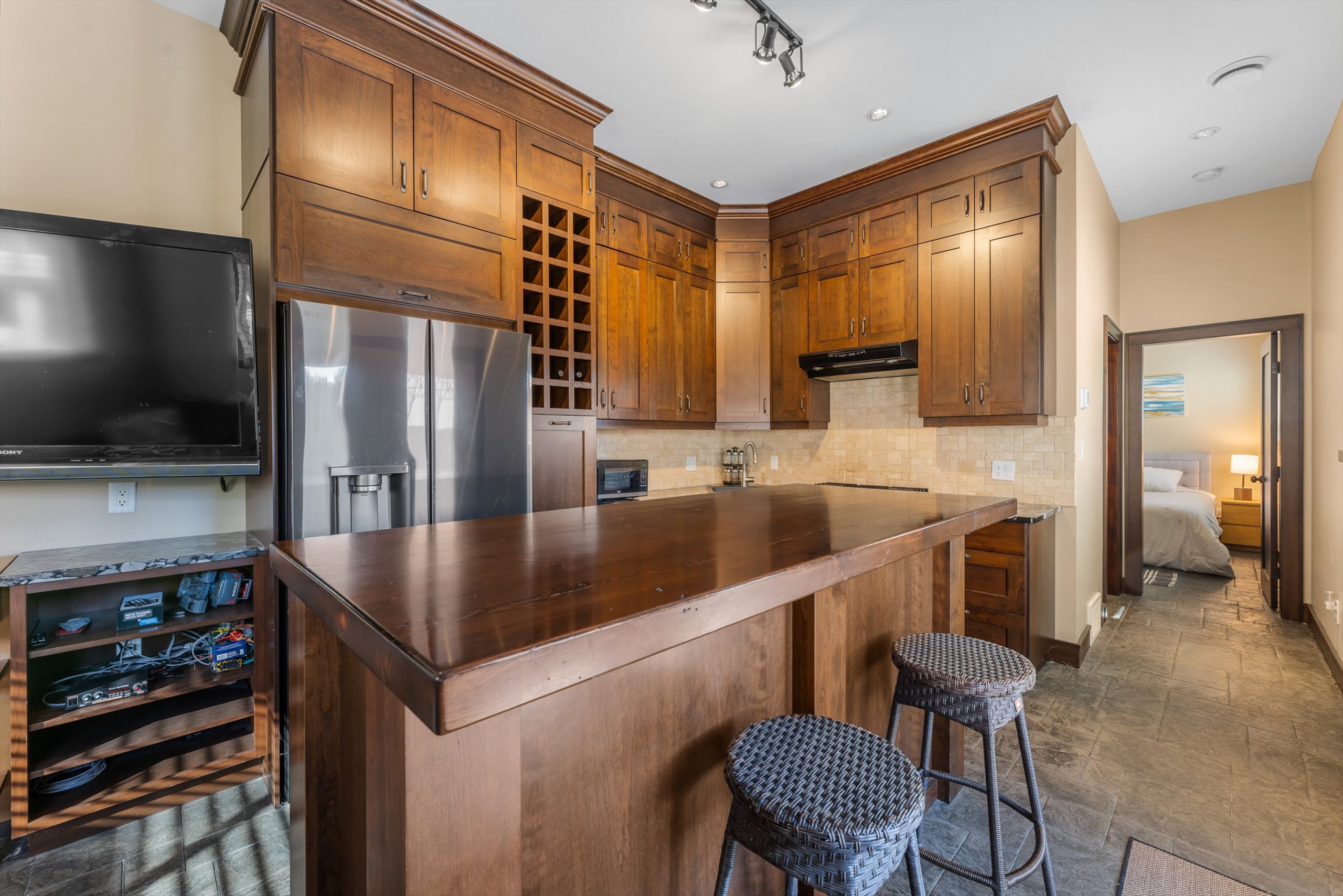 Three additional bedrooms complete the upper level. A legal suite above the garage offers income or guest flexibility, while the detached pool house, with bedroom, bath, kitchenette and separate garage/workshop, adds rare multigenerational potential. With RV parking, wine cellar, climate control systems and walking access to Boucherie Road’s trail, wineries and beaches, this is refined Okanagan living.