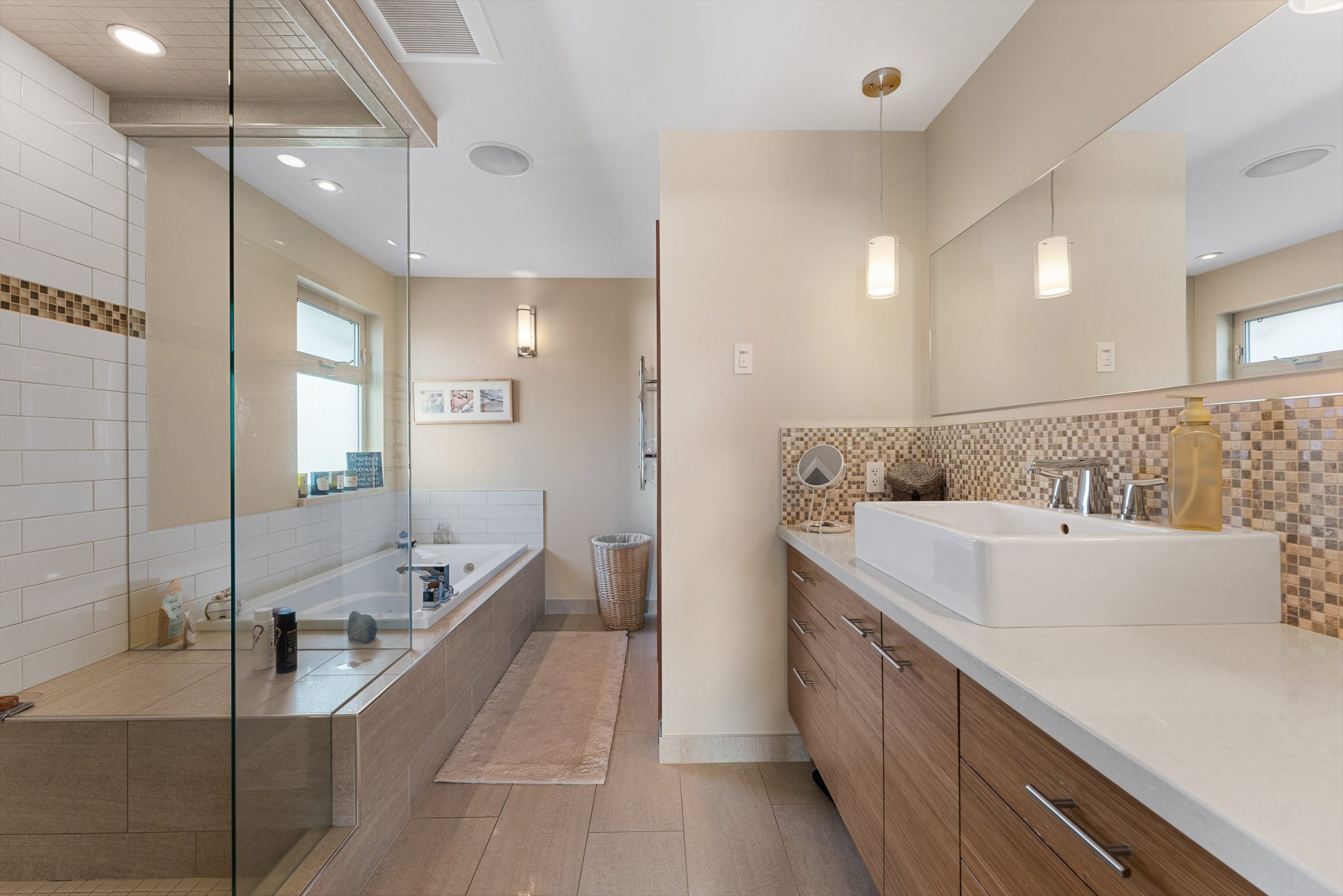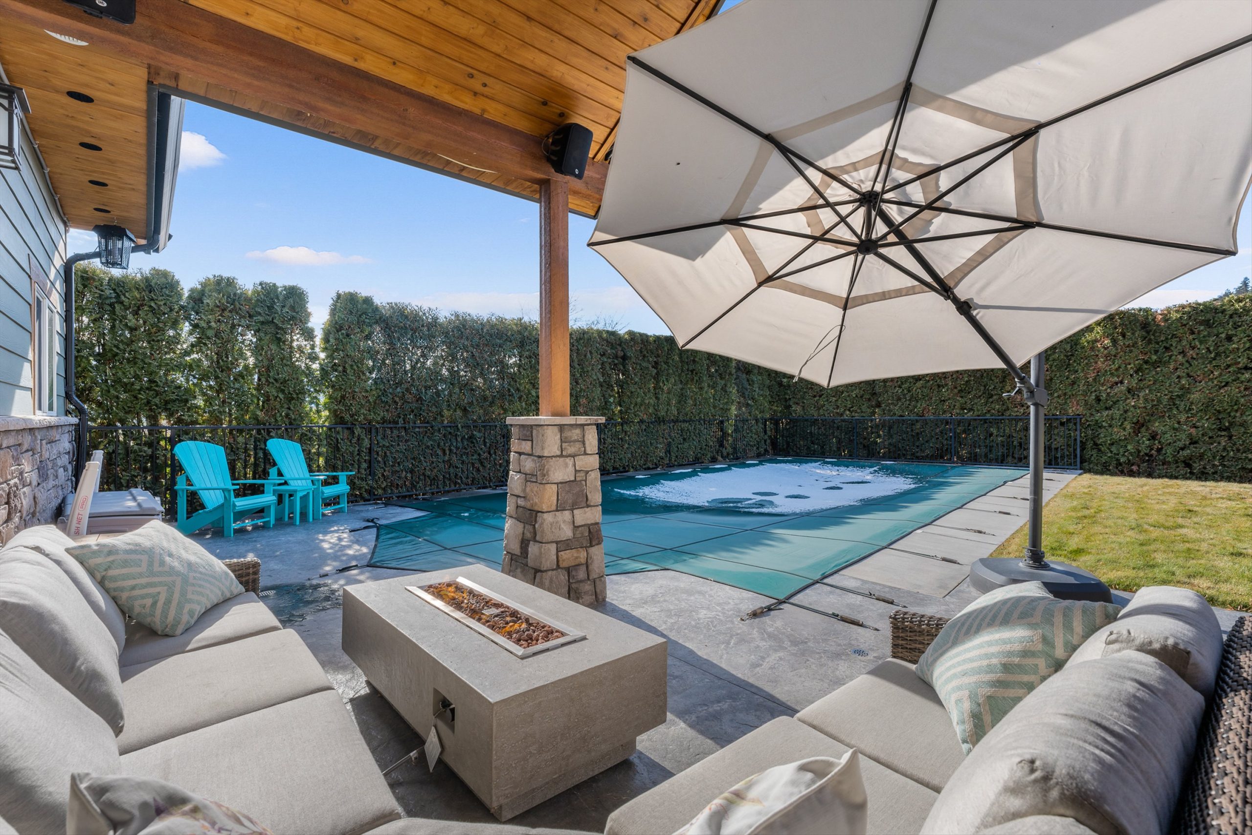 A covered patio off the dining room extends to an spacious covered deck with a hot tub. The backyard features a saltwater sports pool and multiple lounge areas surrounded by stamped concrete, cedar privacy hedging and wired, covered patios with wood inlay ceilings, speakers and gas hookups, crafted for effortless entertaining.